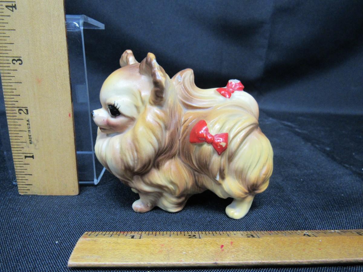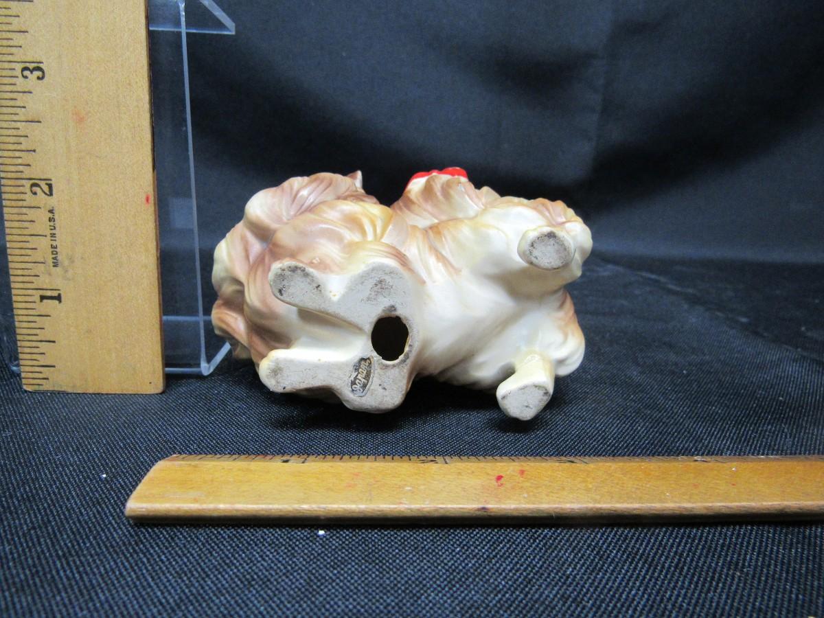 Vintage Pomeranian dog with red bows figurine. Porcelain figurine, made in Japan. About 3" size. Good condition.