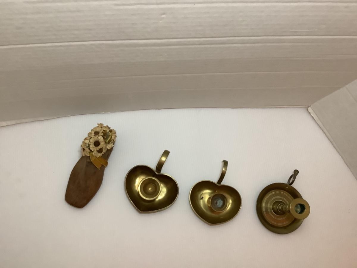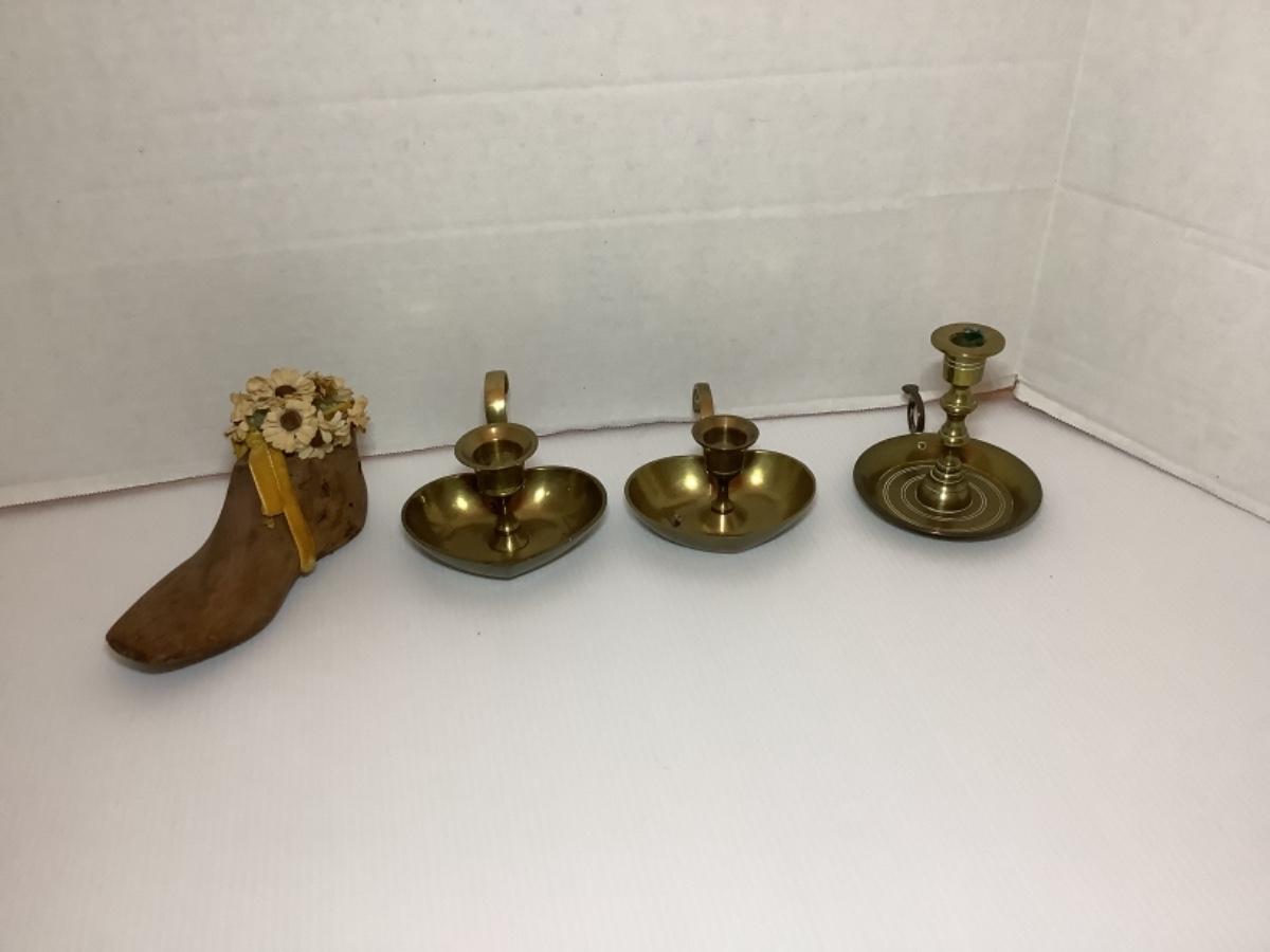 M. 924. Three Small Brass Finger Candlesticks / Antique Wooden Childs Shoe Mold