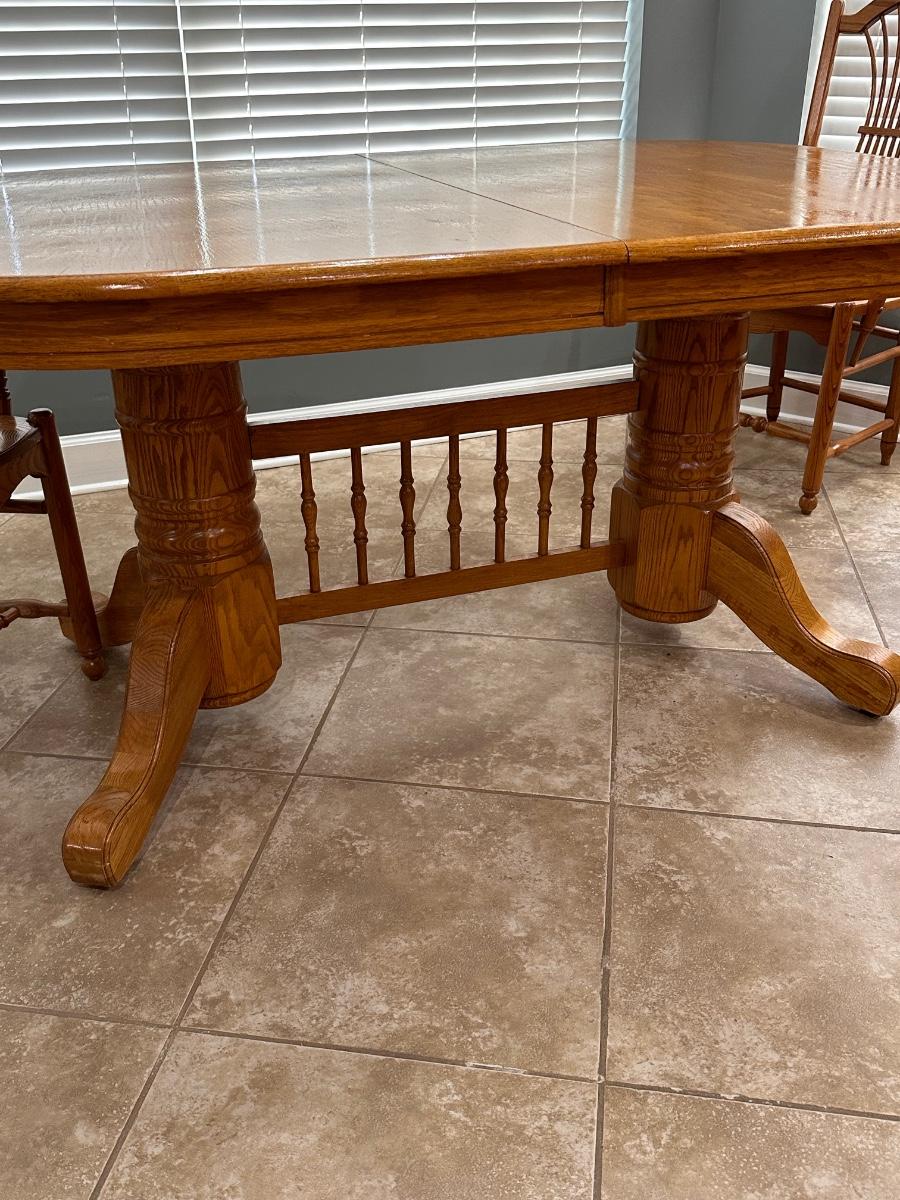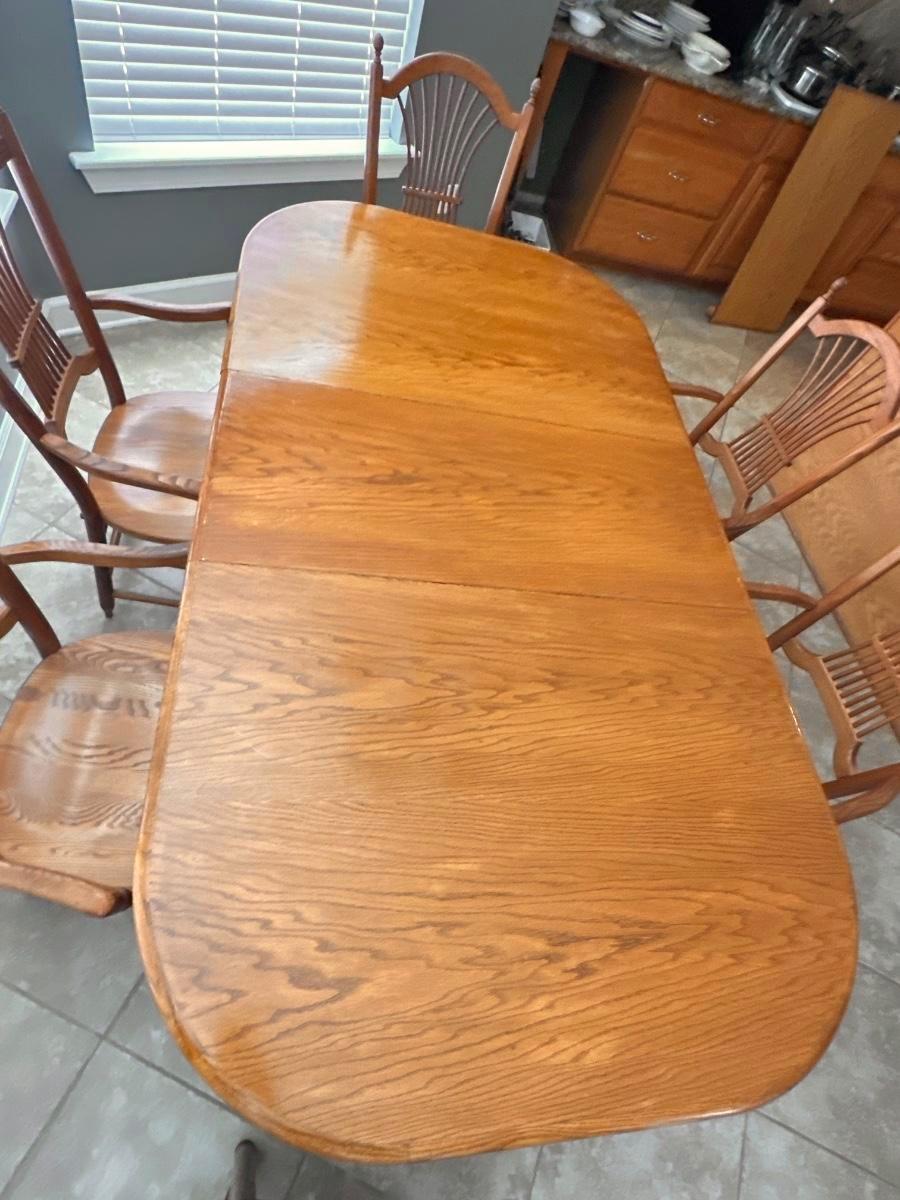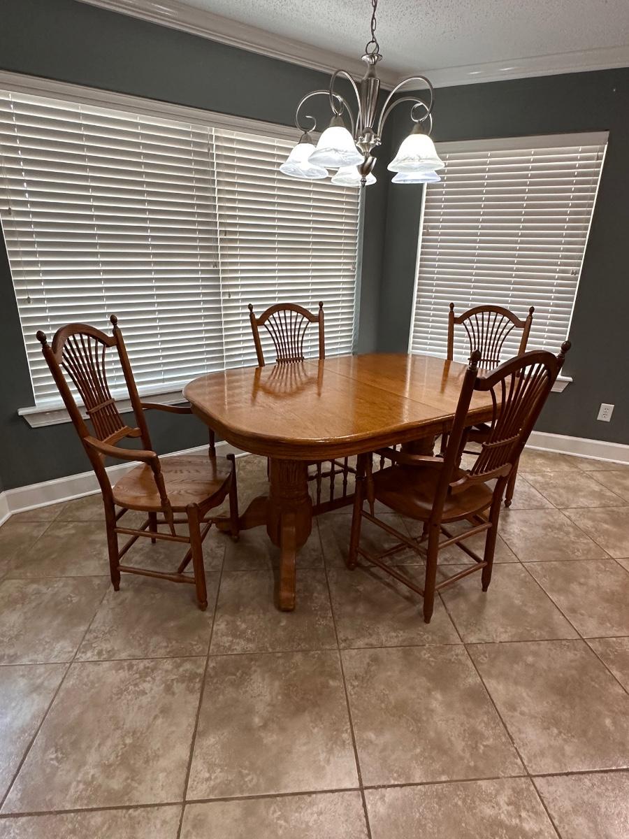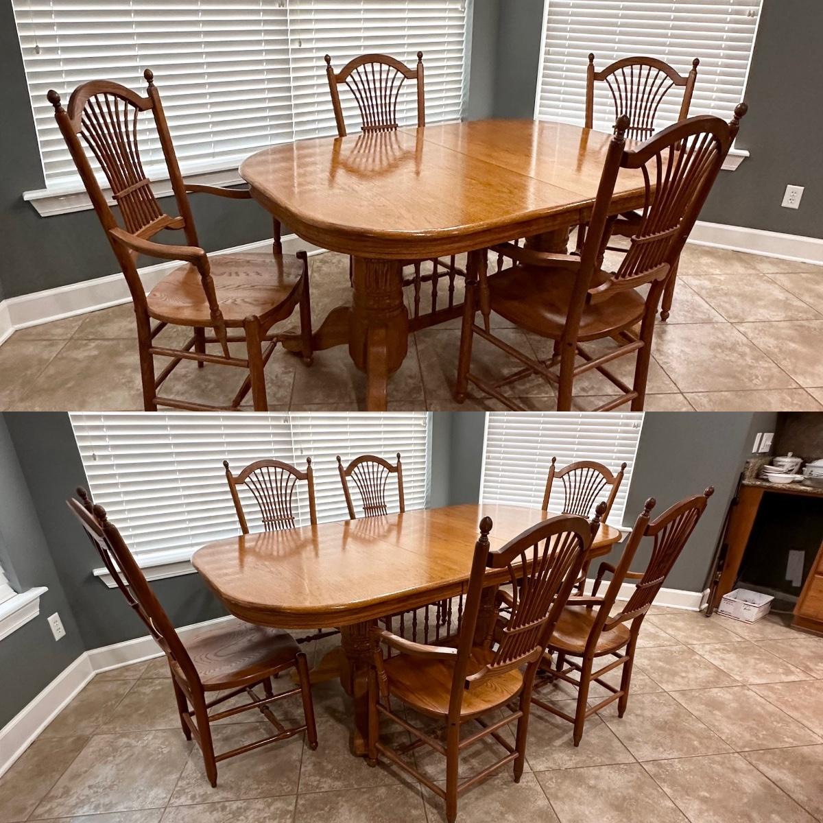 Table shown with & without 18” Leaf ~ table without leaf measures 60” Long x 42” W x 30.25” H ~ easy roll leaf insert ~ set has normal wear from use, minor surface scratches on table top ~ one chair has a screw plug missing ~ overall great and sturdy condition