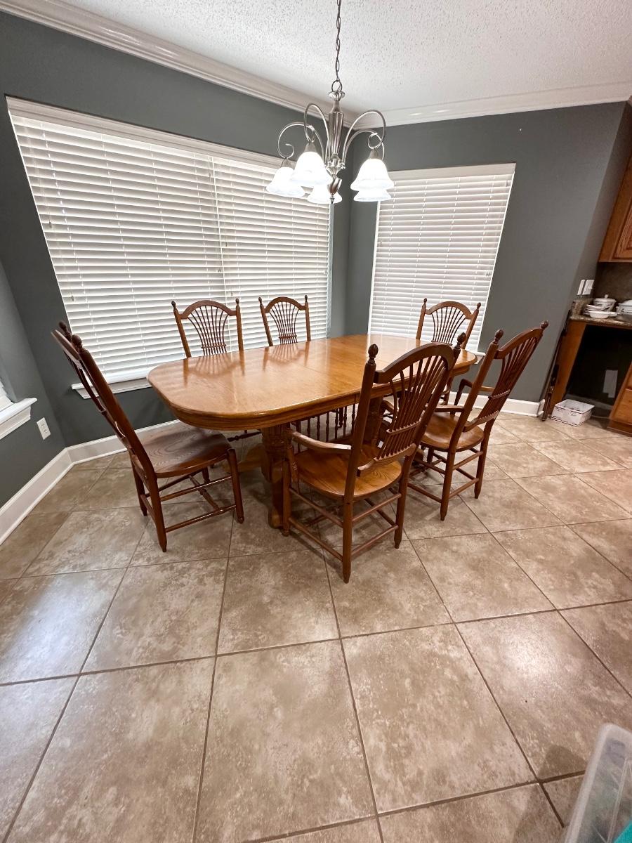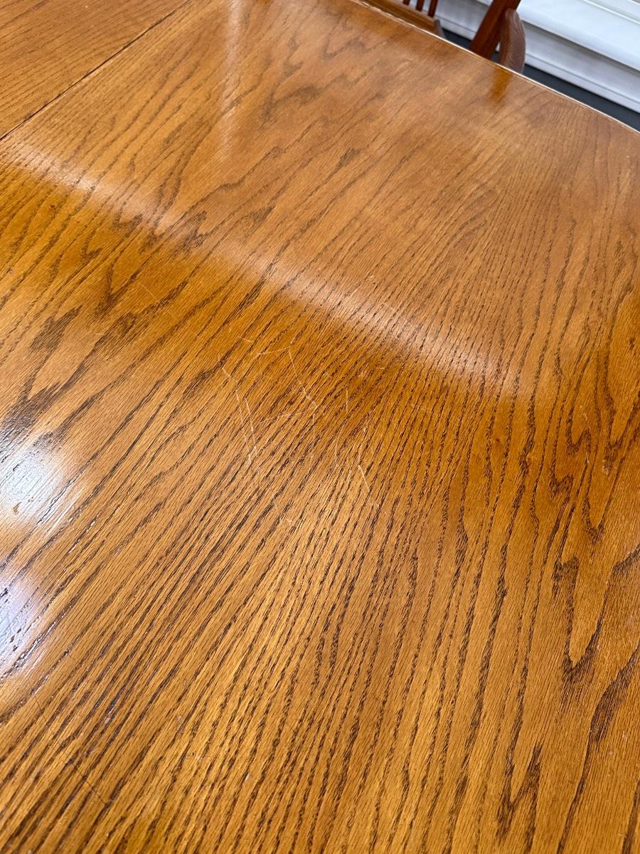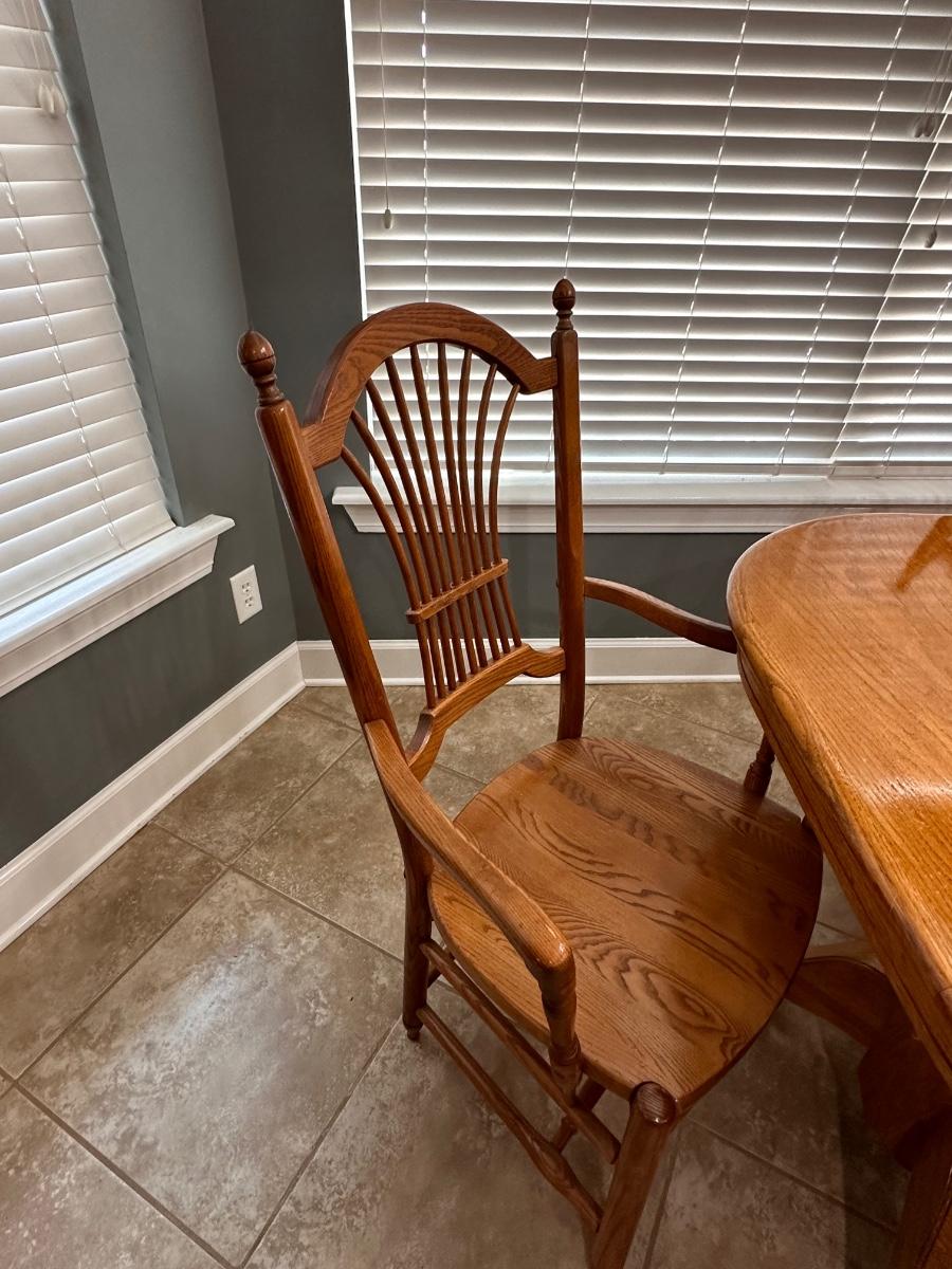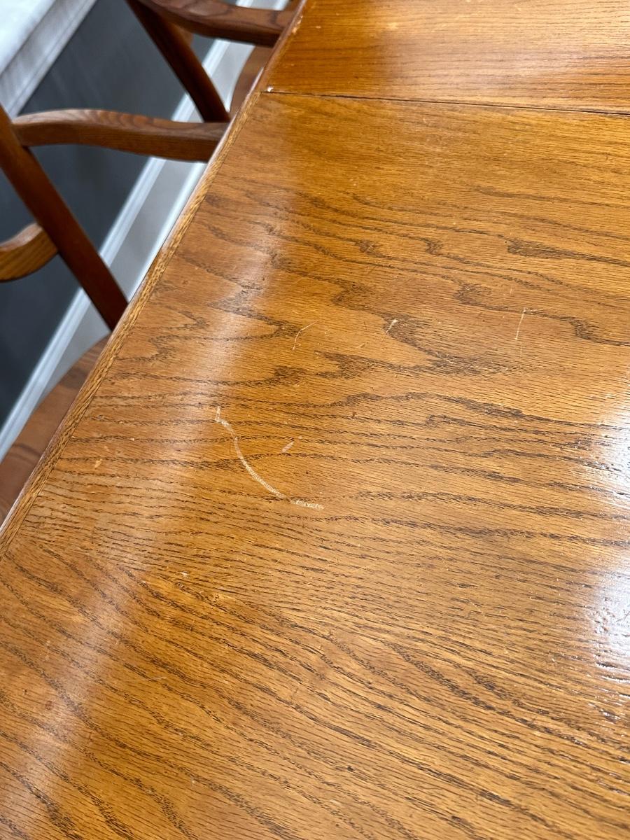 Table shown with & without 18” Leaf ~ table without leaf measures 60” Long x 42” W x 30.25” H ~ easy roll leaf insert ~ set has normal wear from use, minor surface scratches on table top ~ one chair has a screw plug missing ~ overall great and sturdy condition
