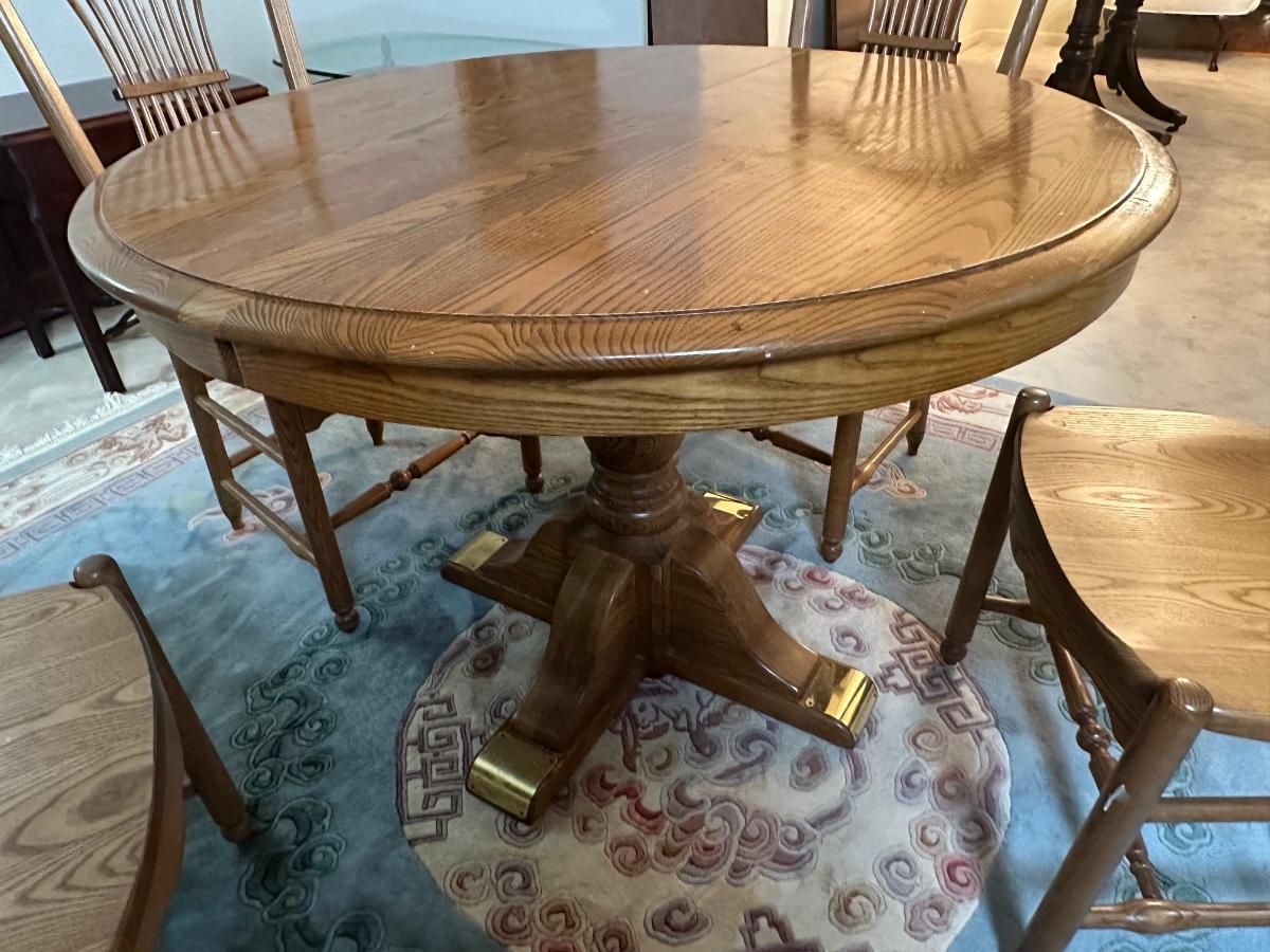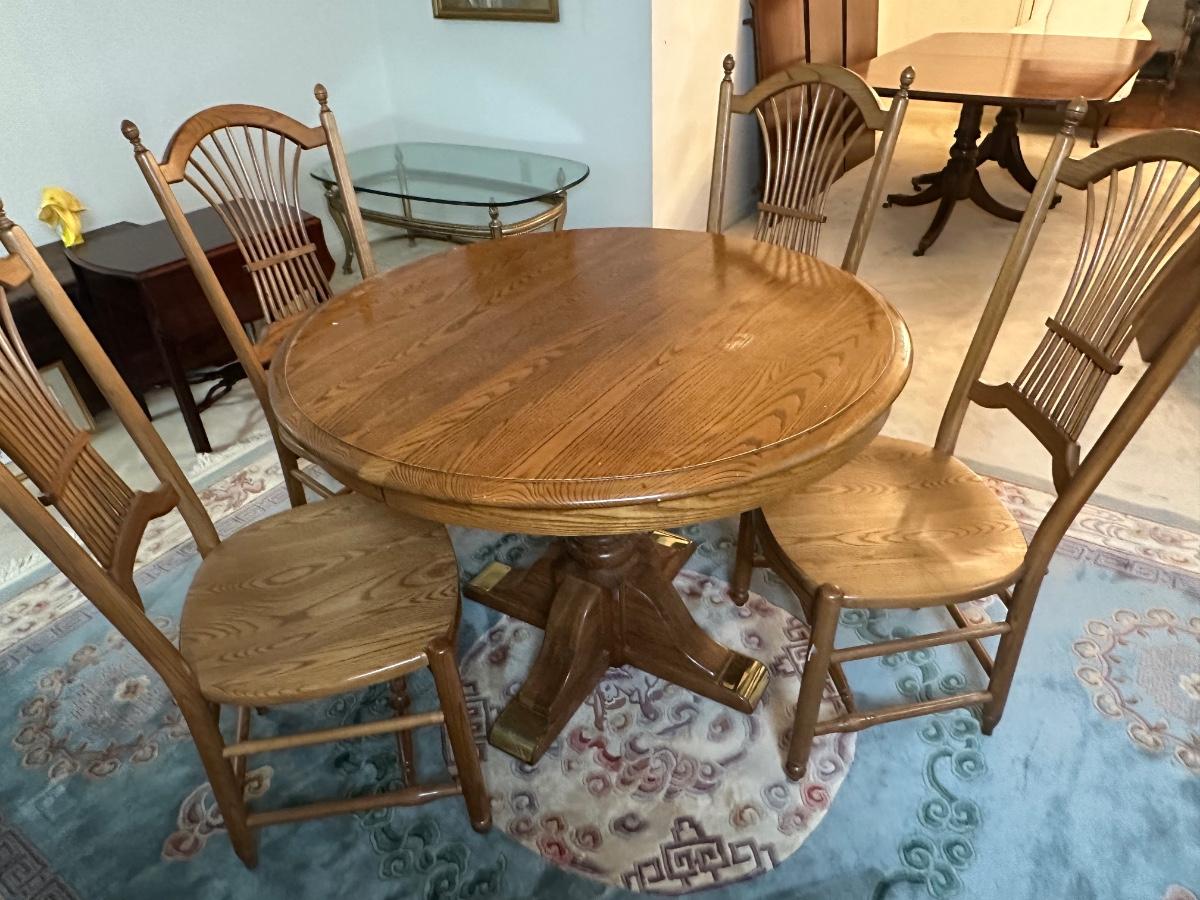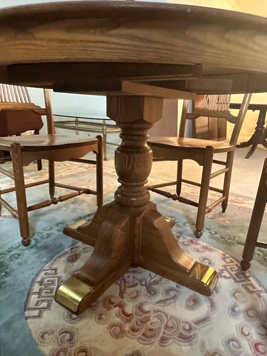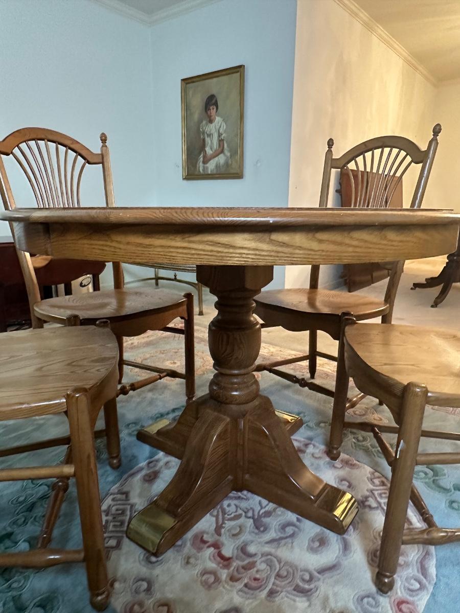 S. Bent & Bros Oak Pedestal Dining Table with 4 Chairs + 2 Leaves