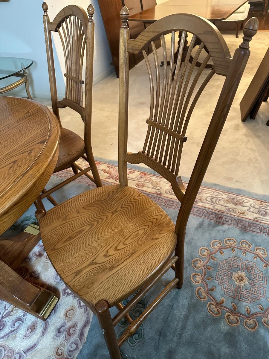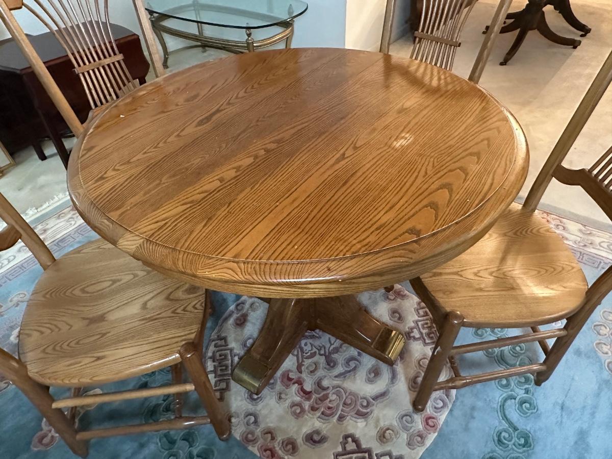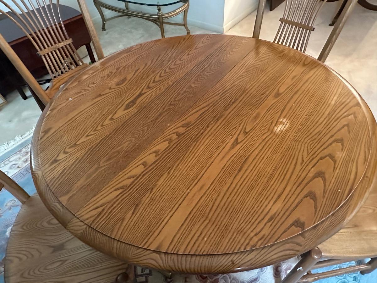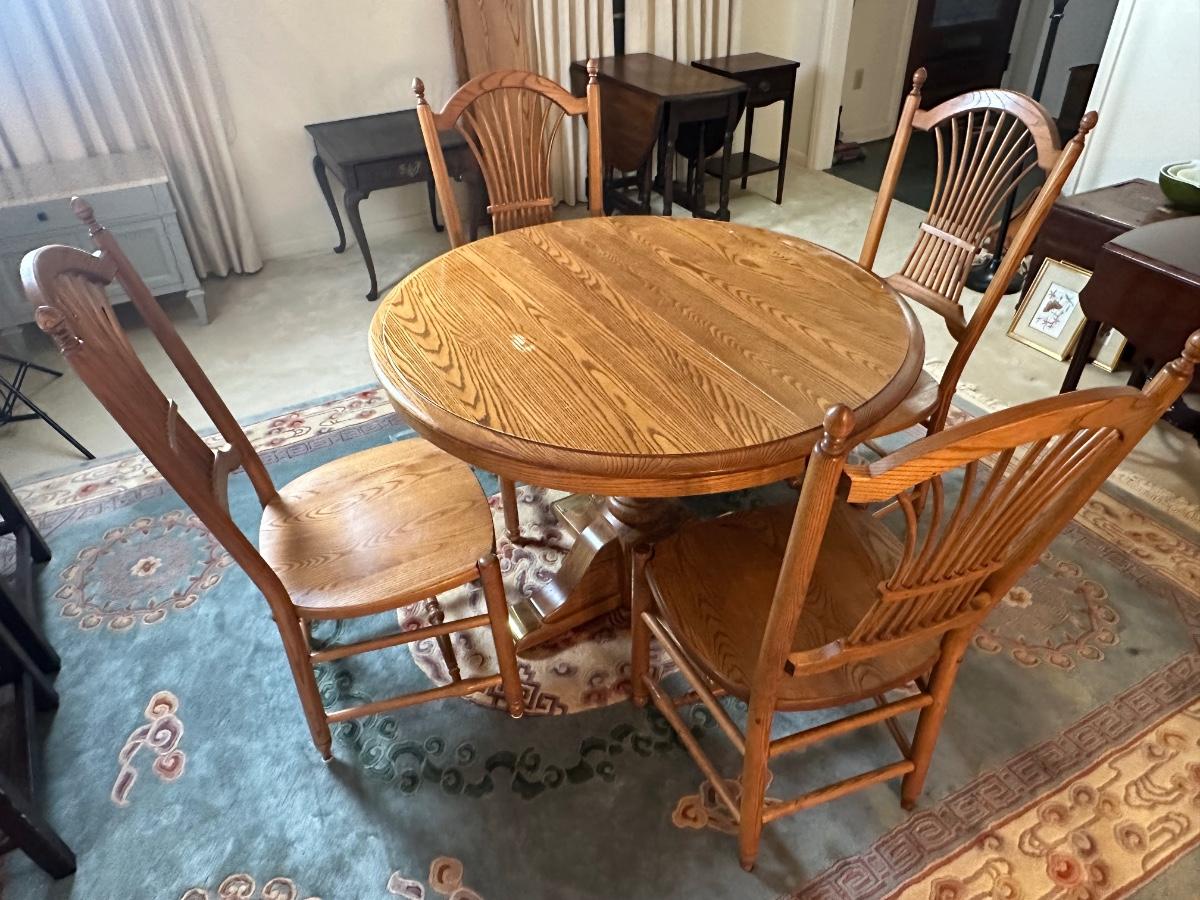 S. Bent & Bros Oak Pedestal Dining Table with 4 Chairs + 2 Leaves