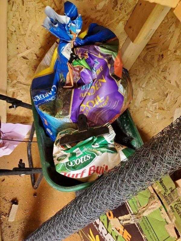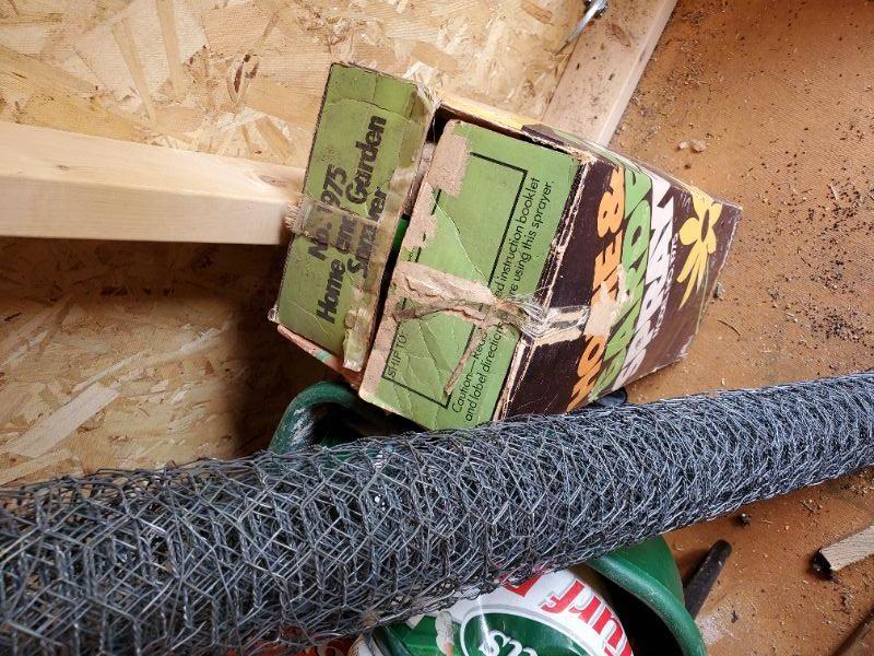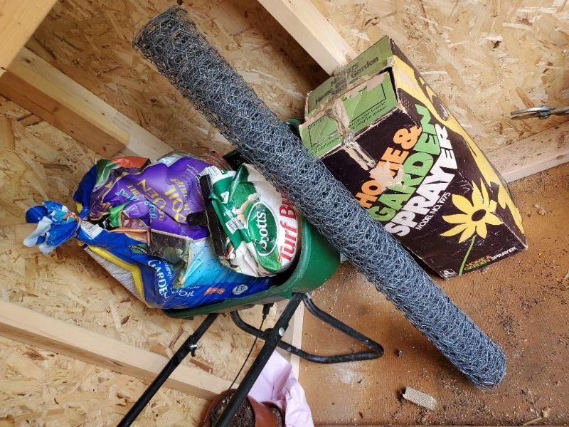 Spreader, wire fencing, garden sprayer, and lawn treatment.