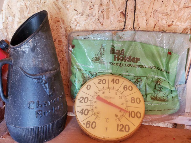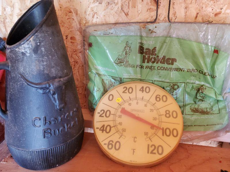 Bag holder to help get those leaves bagged up, a charcoal bucket, and an outside thermometer, untested.
