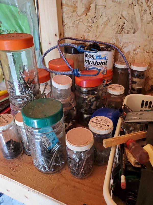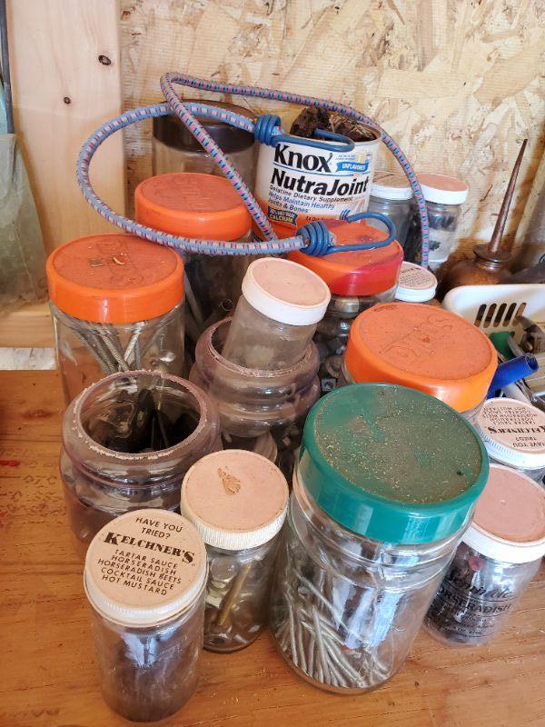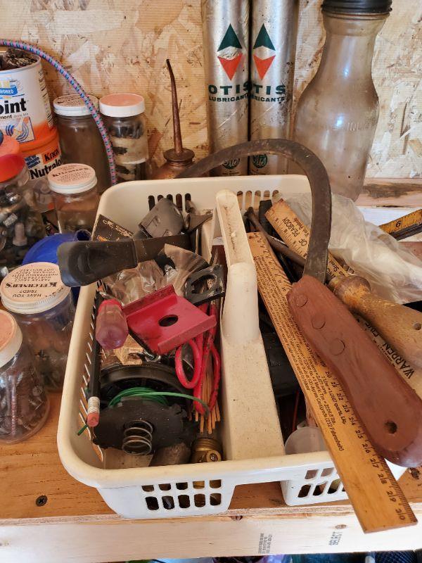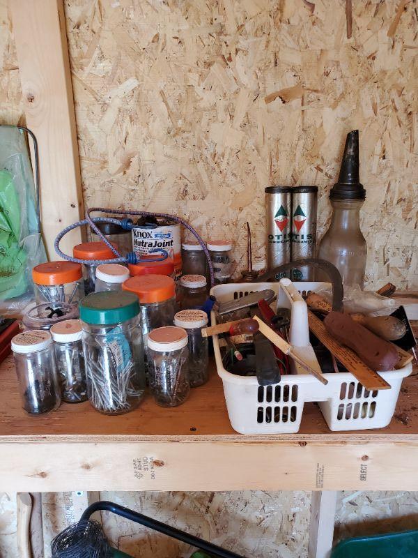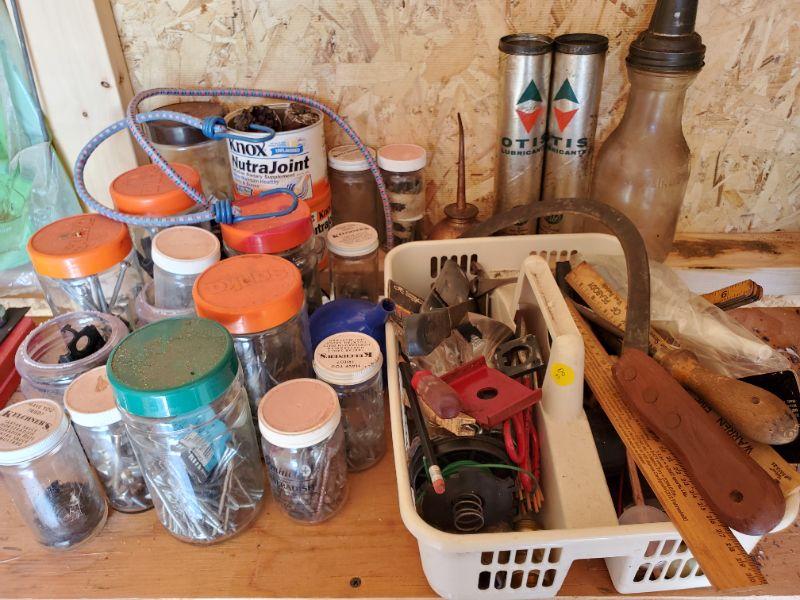 Jars of assorted nails, vintage oil container, rulers, scythe, and more. Bring box for packing.
