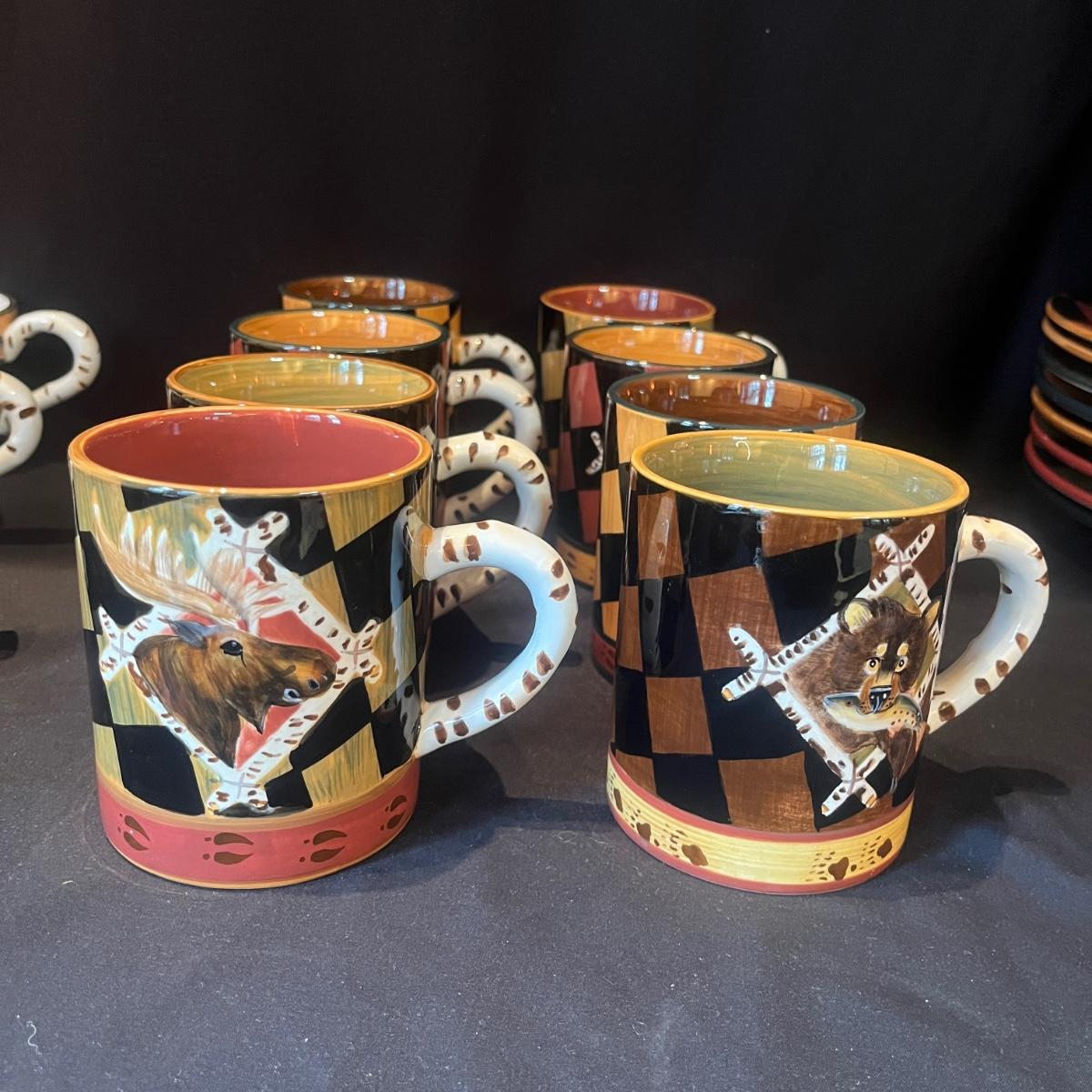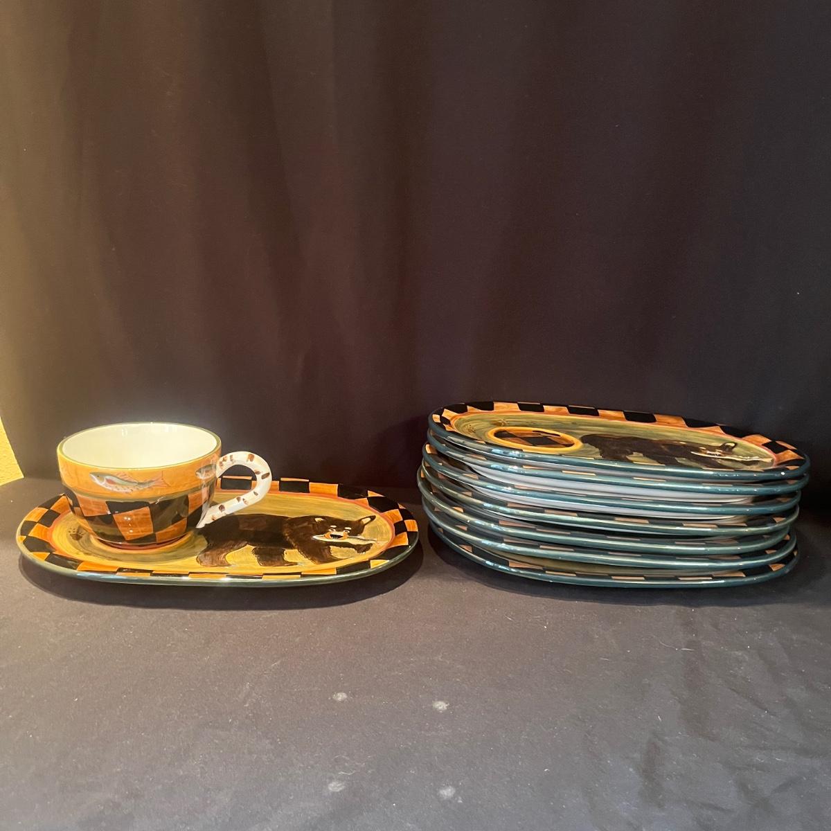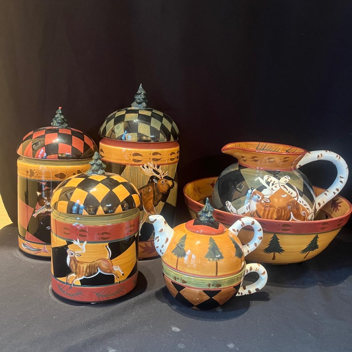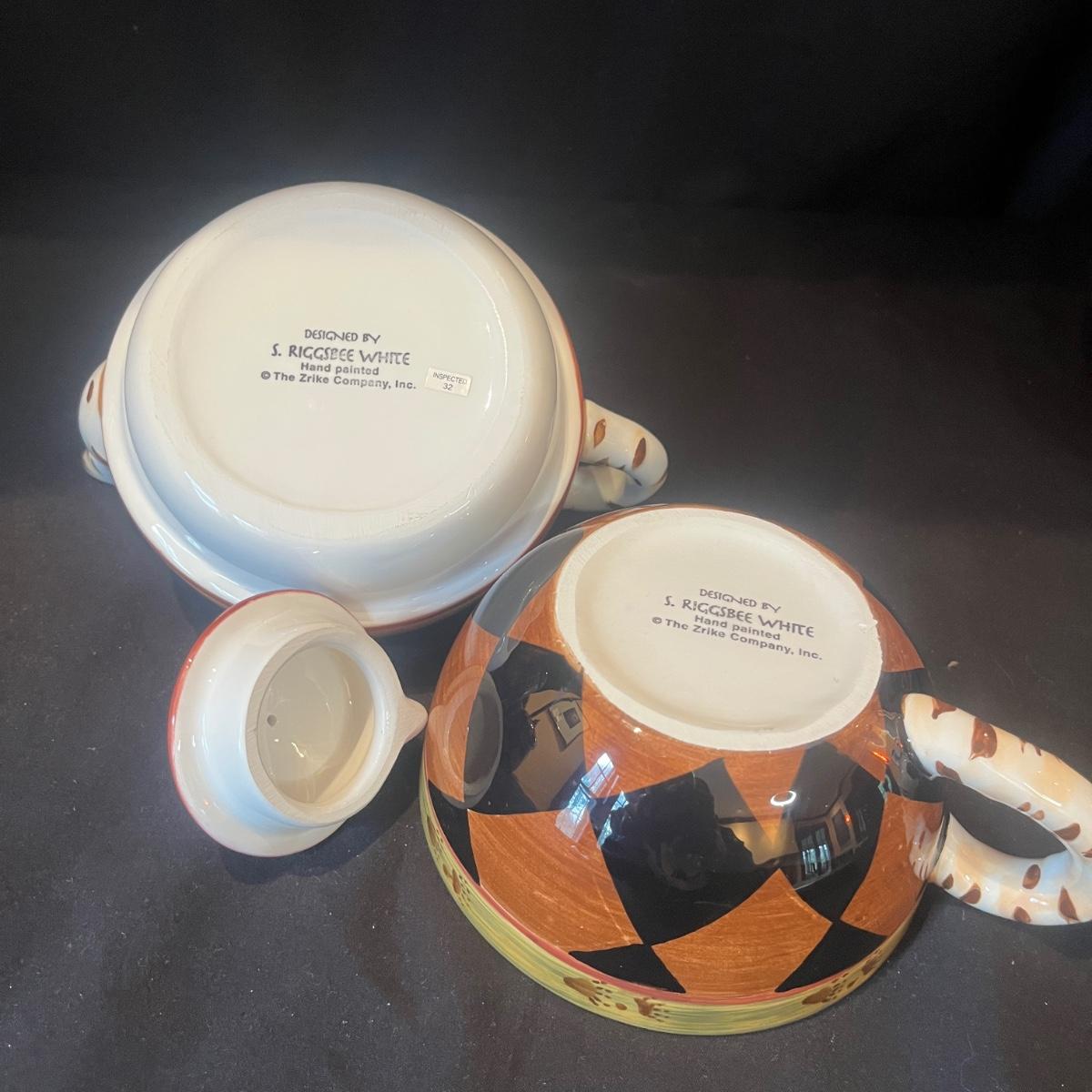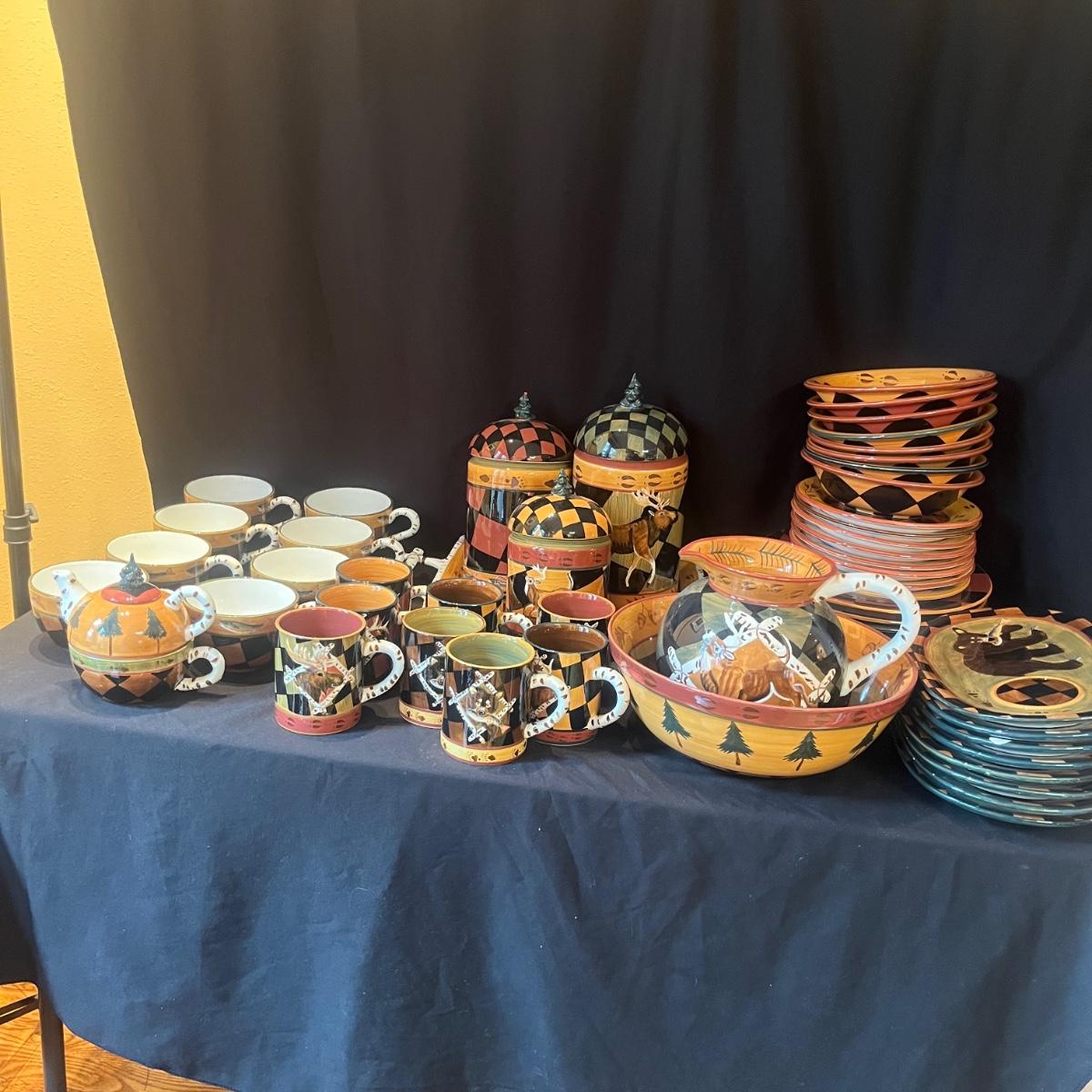 Lot contains a set of S. Riggsbee White dish set that includes eight each of cups, mugs, dinner plates, salad plates, trays and bowls. Also includes three canisters, a serving tray, teacup, large bowl and 12 napkins. Serving tray measures 20” x 14” x 1.5”H. One plate is chipped, see photo.