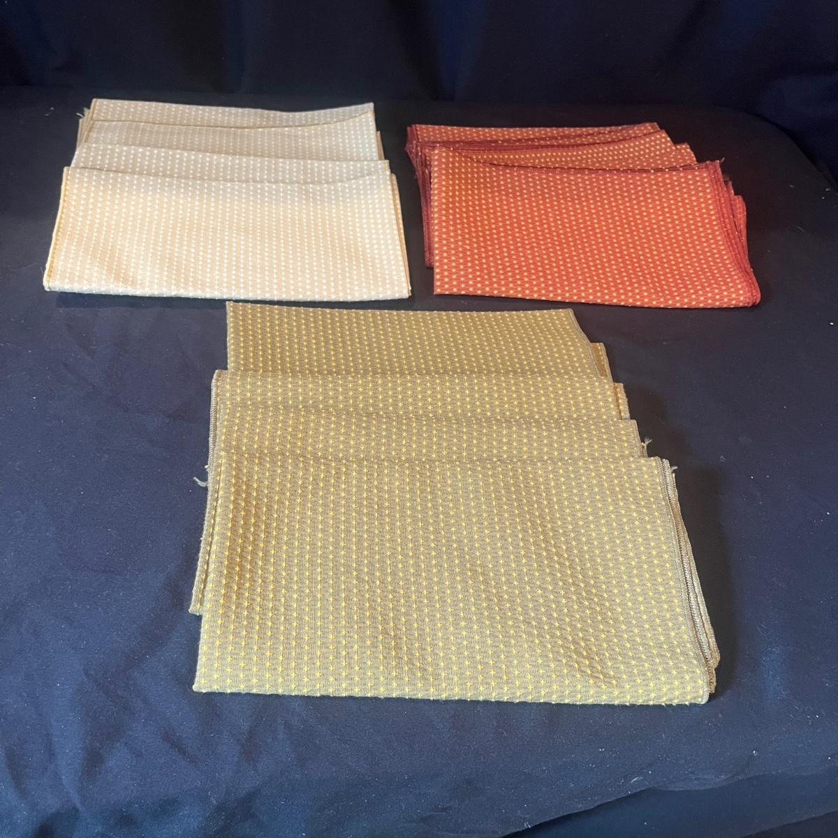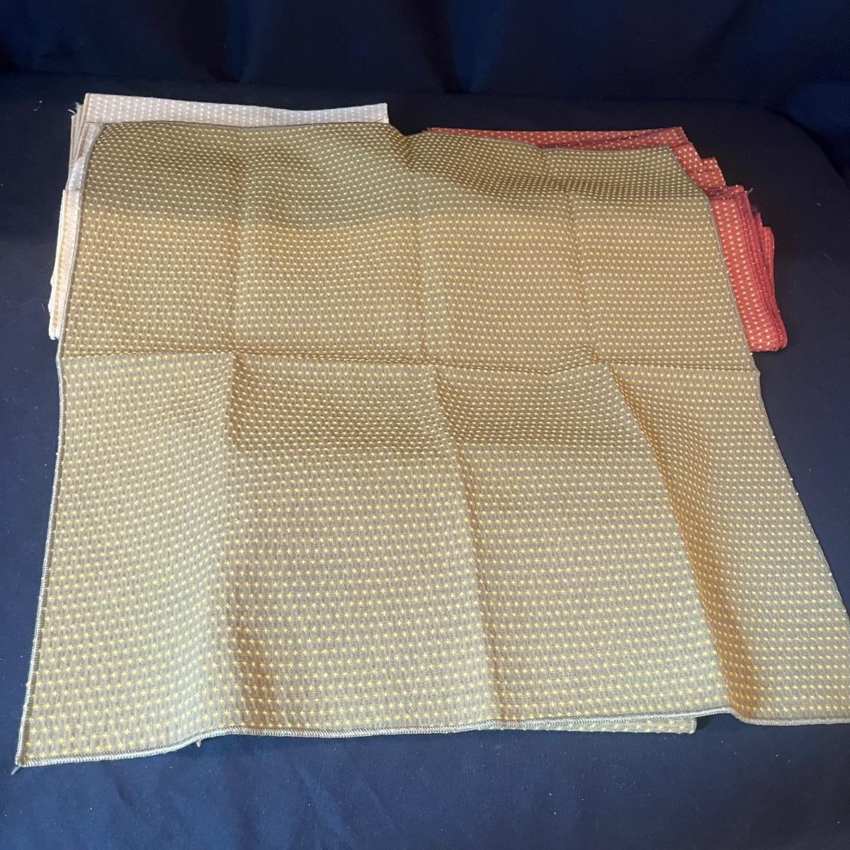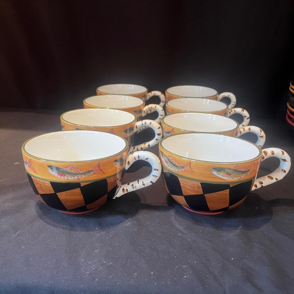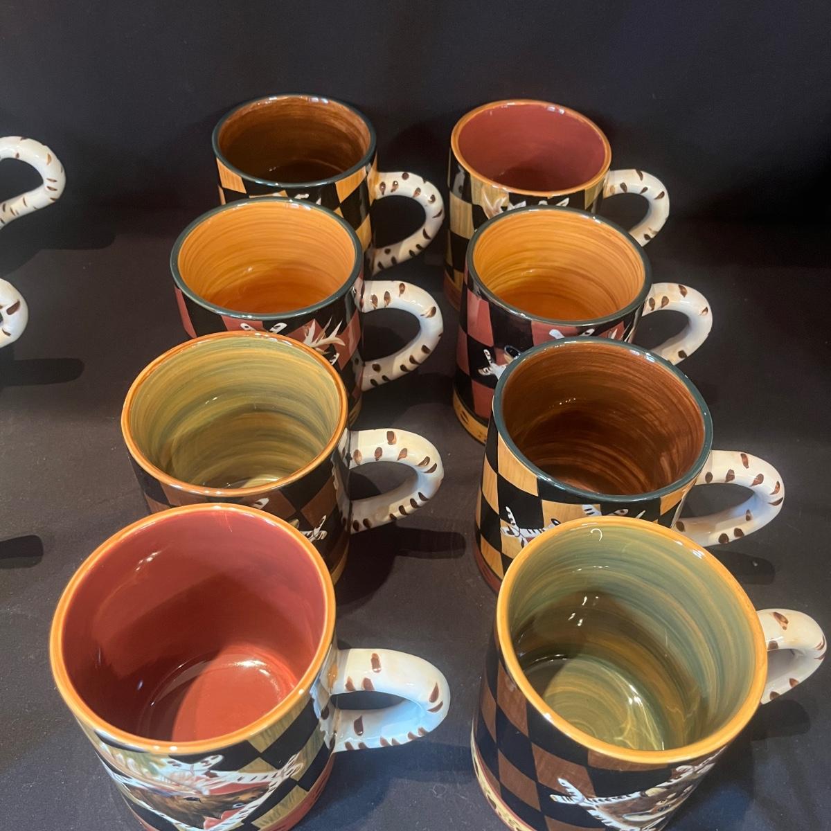 Lot contains a set of S. Riggsbee White dish set that includes eight each of cups, mugs, dinner plates, salad plates, trays and bowls. Also includes three canisters, a serving tray, teacup, large bowl and 12 napkins. Serving tray measures 20” x 14” x 1.5”H. One plate is chipped, see photo.