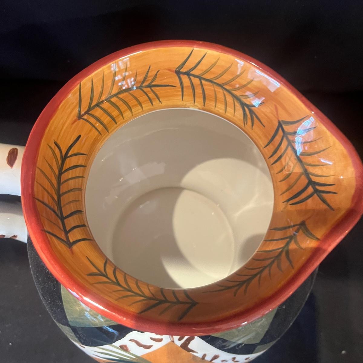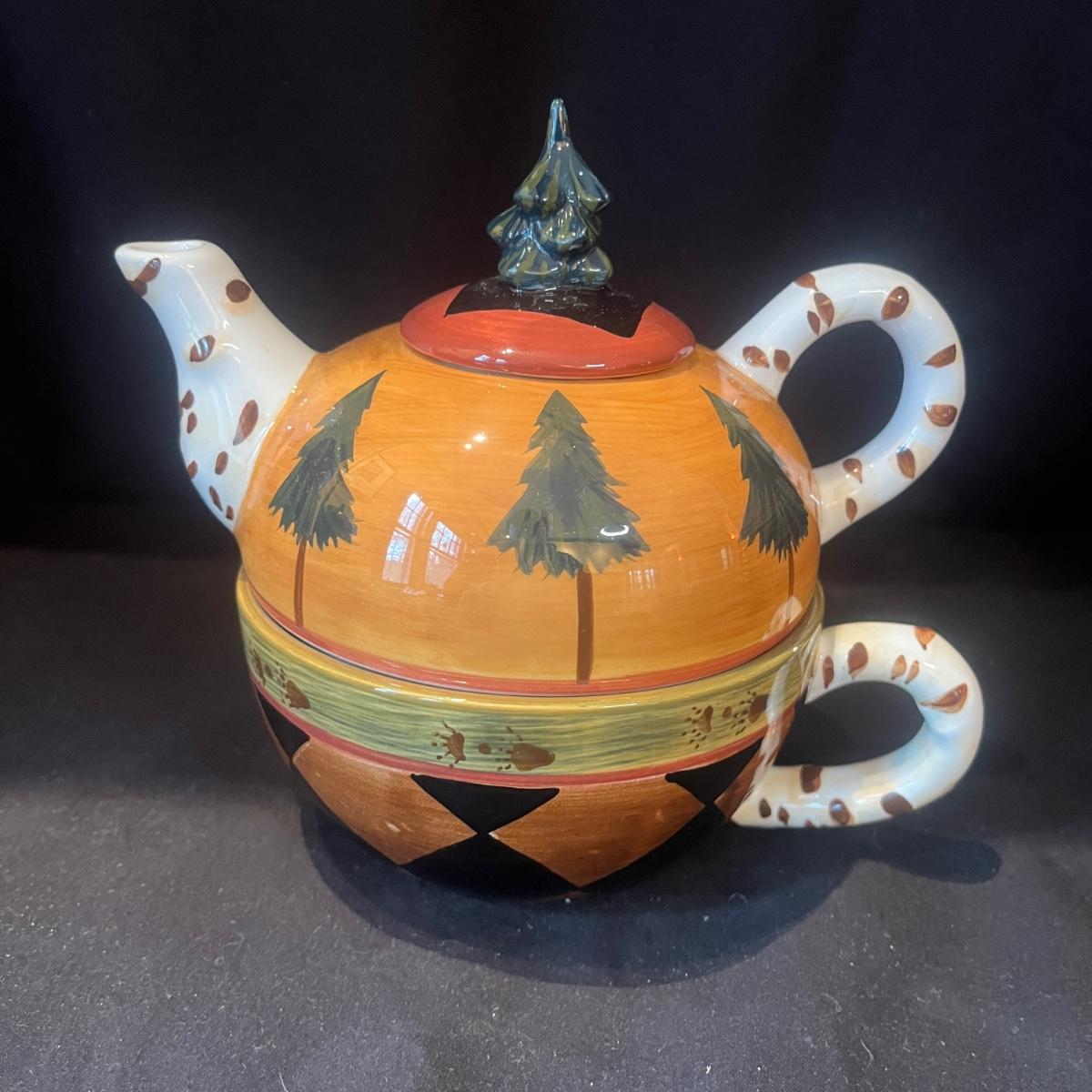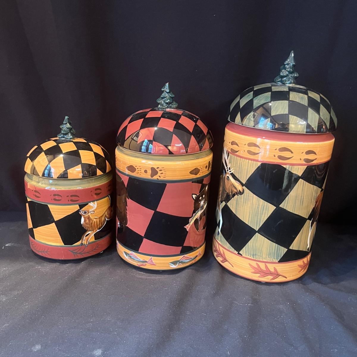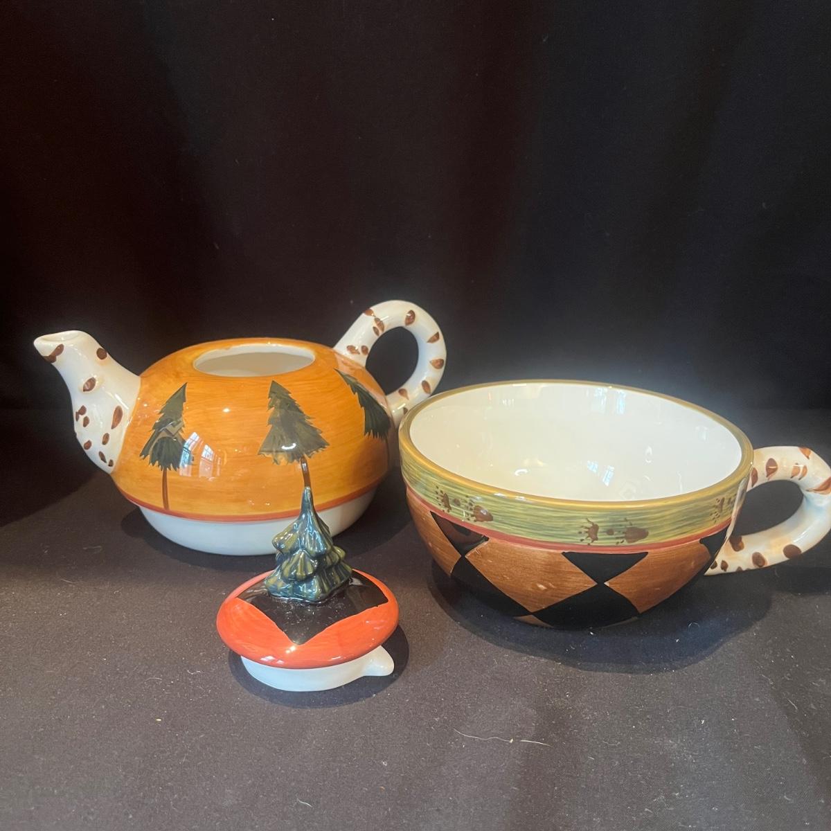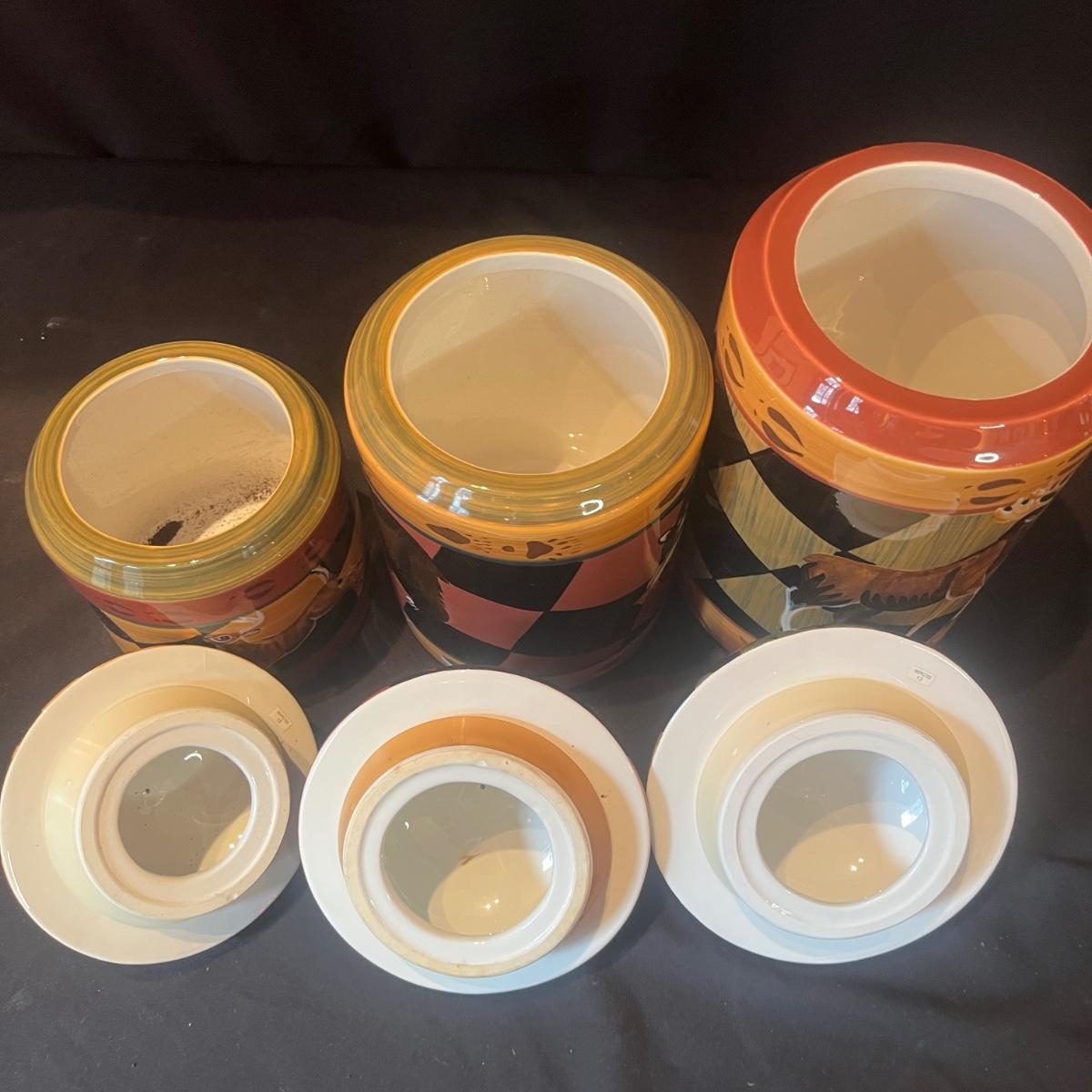 Lot contains a set of S. Riggsbee White dish set that includes eight each of cups, mugs, dinner plates, salad plates, trays and bowls. Also includes three canisters, a serving tray, teacup, large bowl and 12 napkins. Serving tray measures 20” x 14” x 1.5”H. One plate is chipped, see photo.