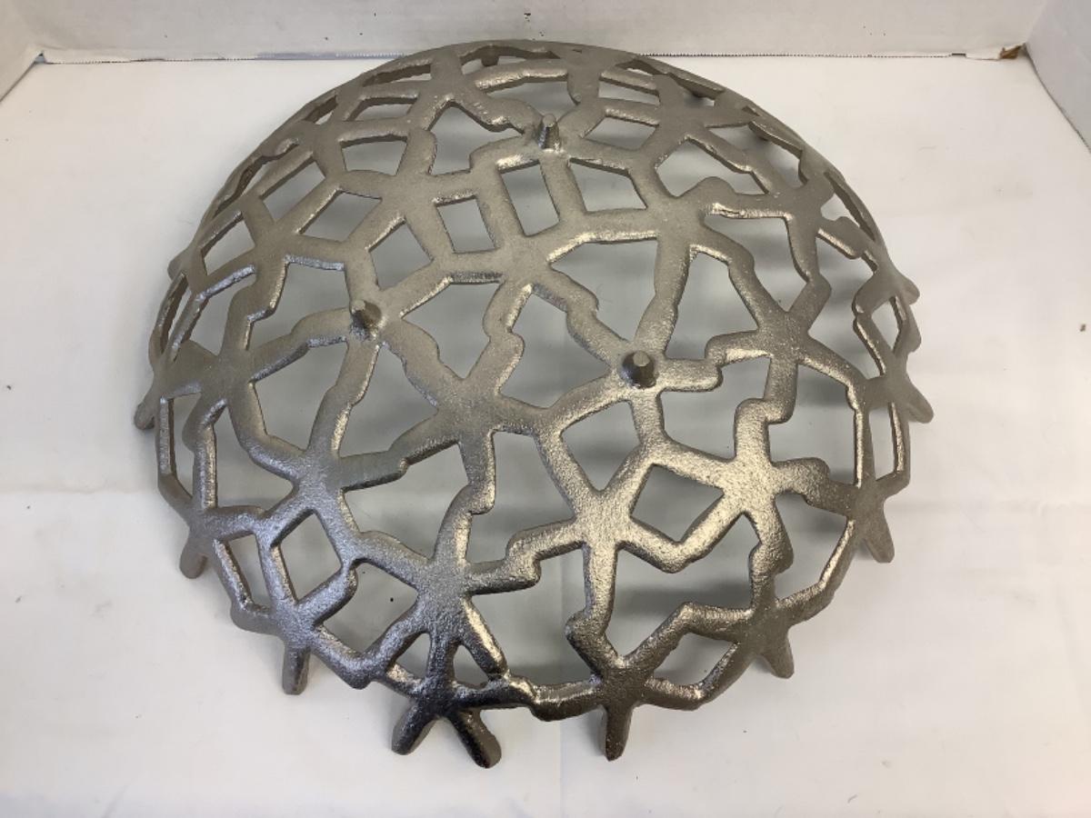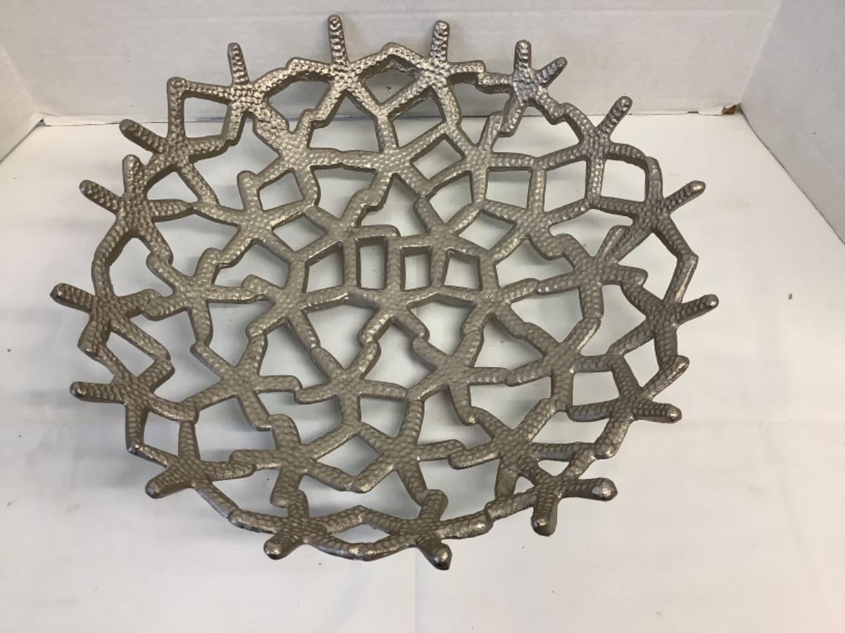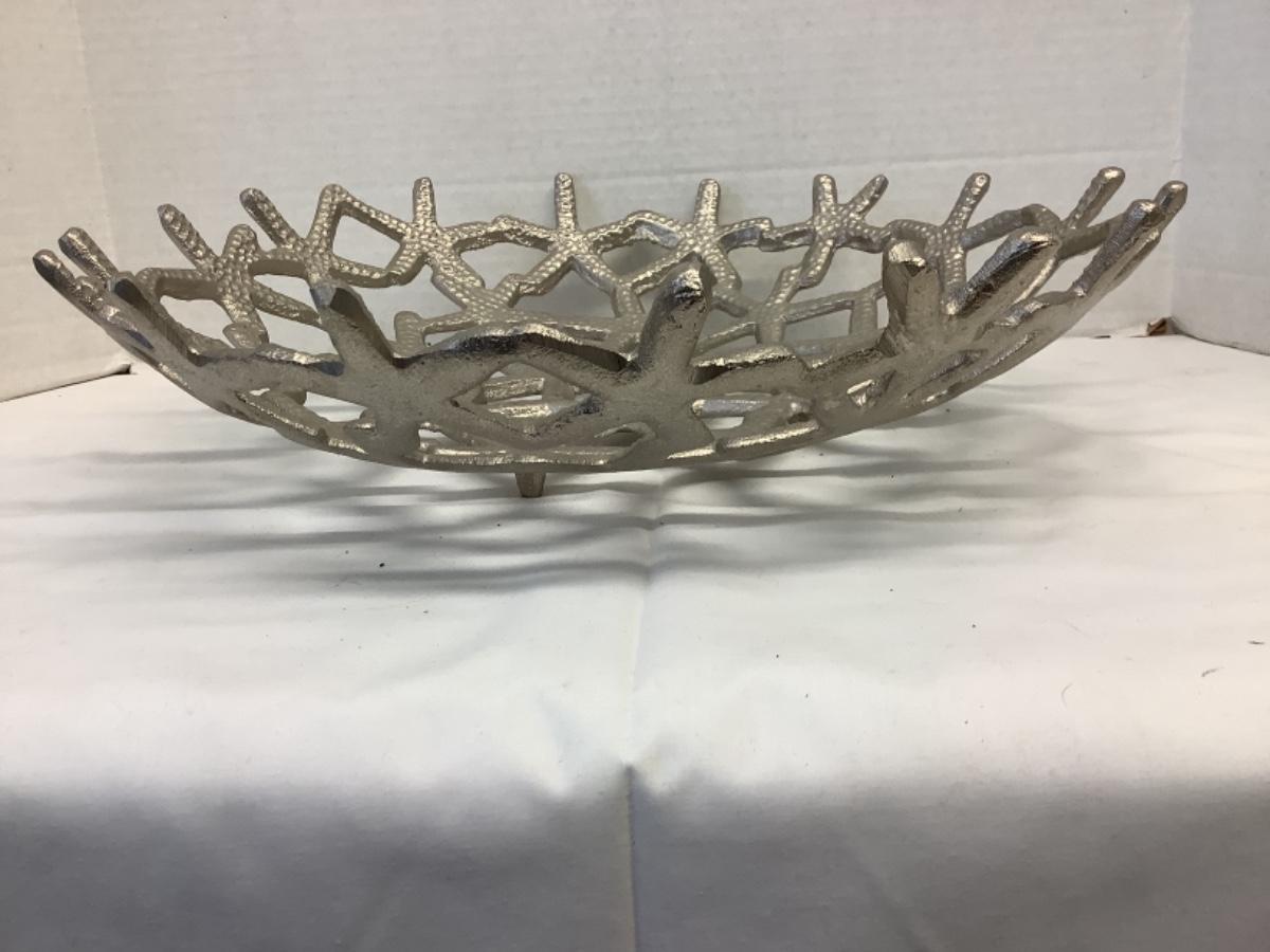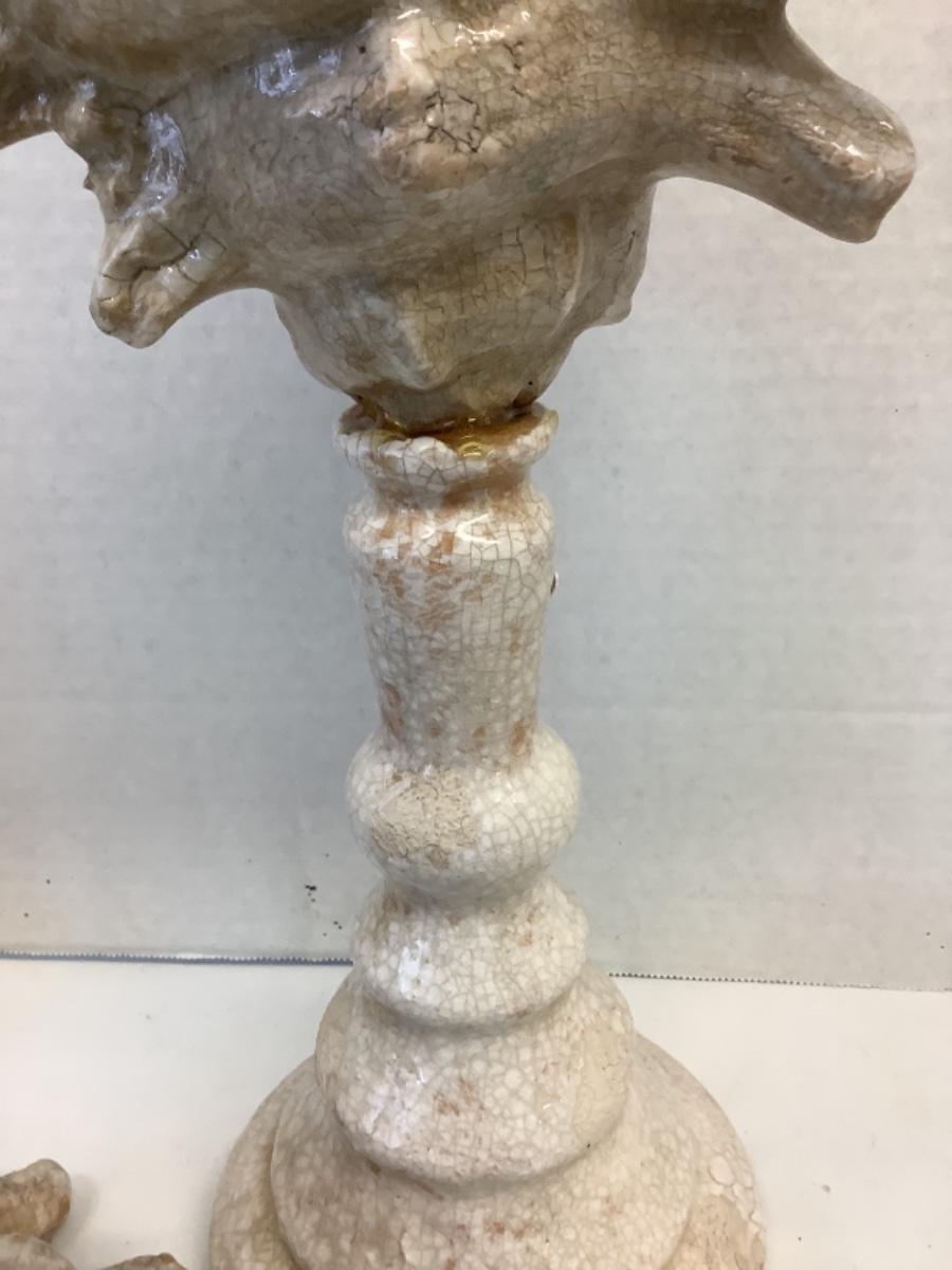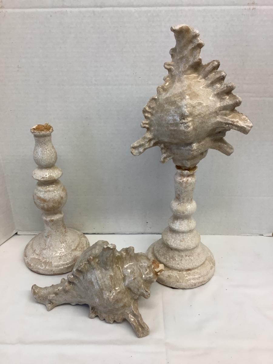 Pair of Pottery conch shell decorative pieces, 1 needs repair and 1 has been repaired, measuring approximately 18” tall, Large metal starfish footed bowl measures 16” round