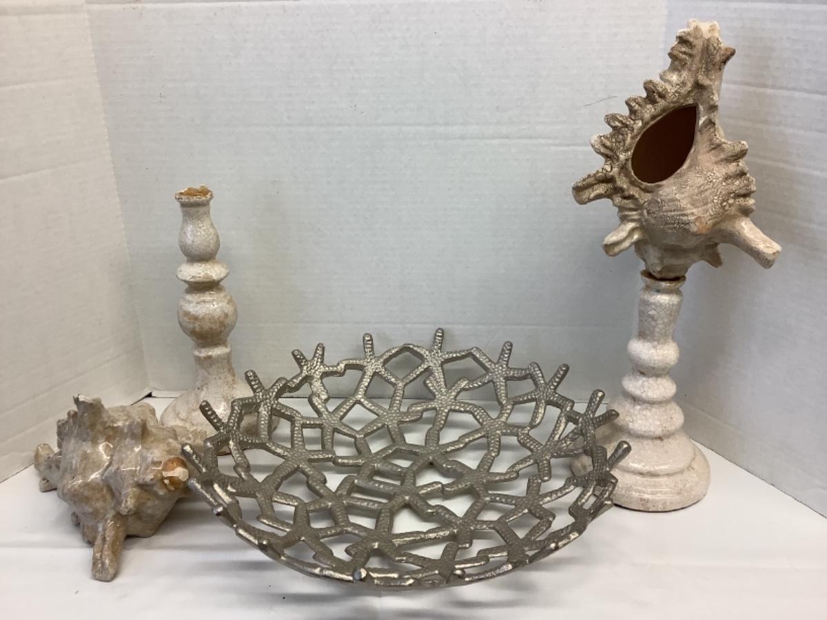 S1210 Pair of Pottery Conch Shell Decorative Pieces and Large Metal Starfish Footed Bowl