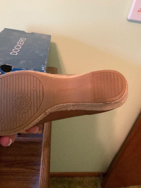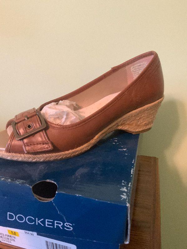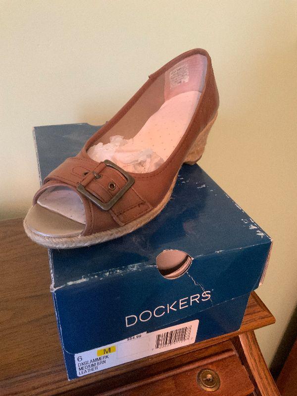 S14: Women's size 6 Dockers. Open toe, Brown Leather shoe with buckle detail.