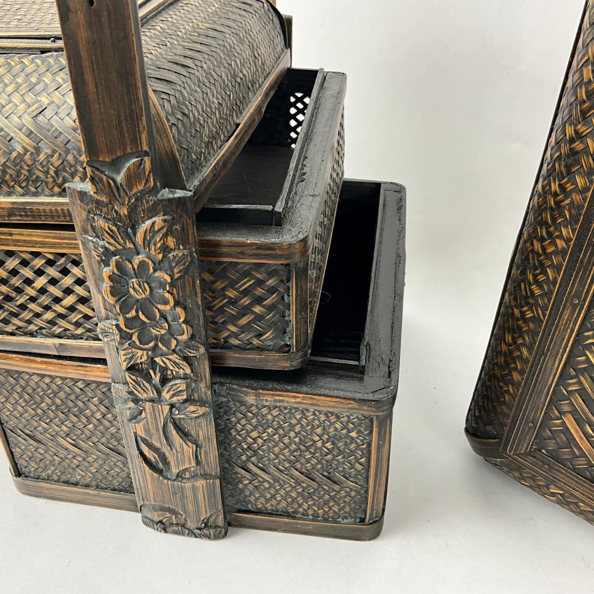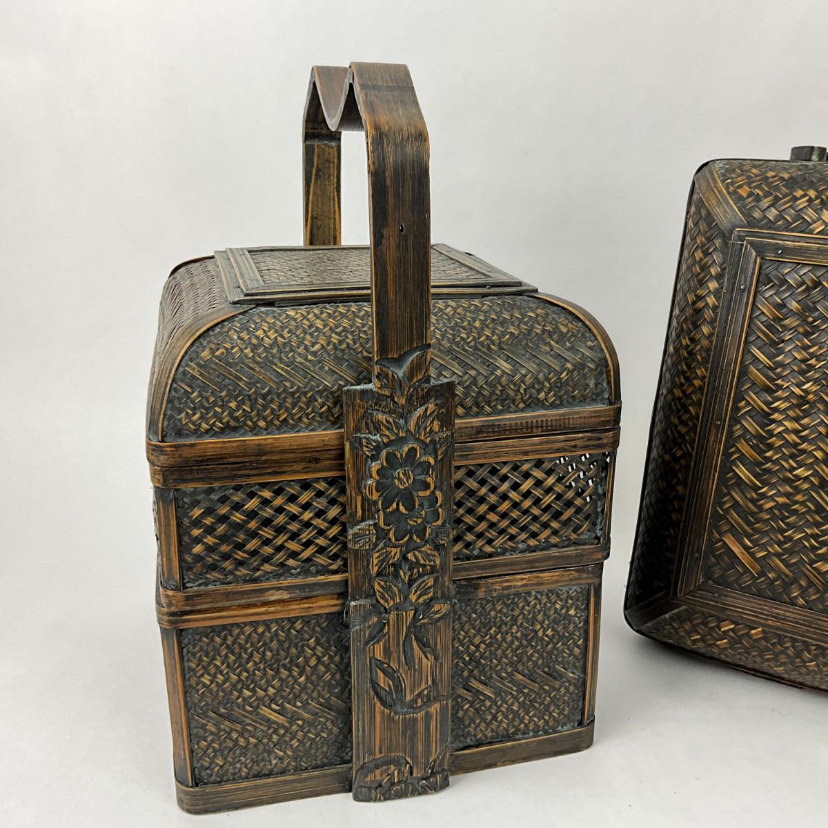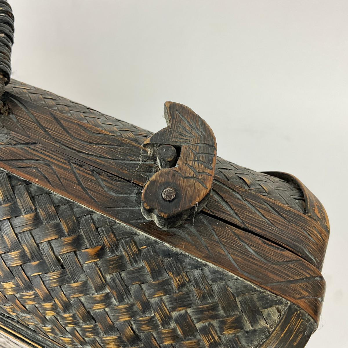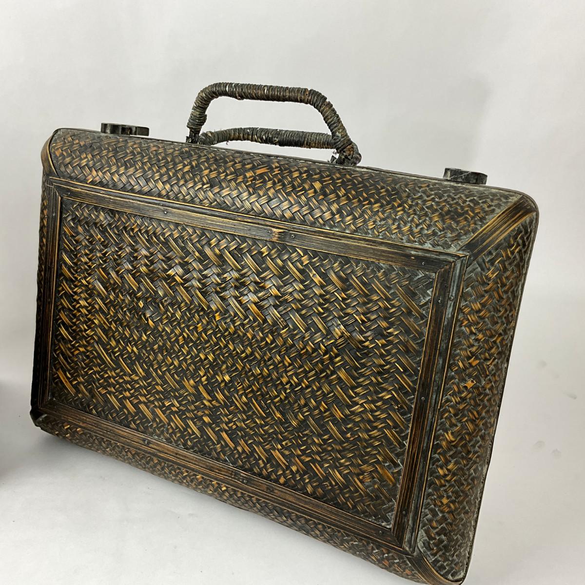 Three tiered floral basket, traveling woven suitcase has wooden fish clasp