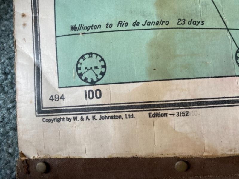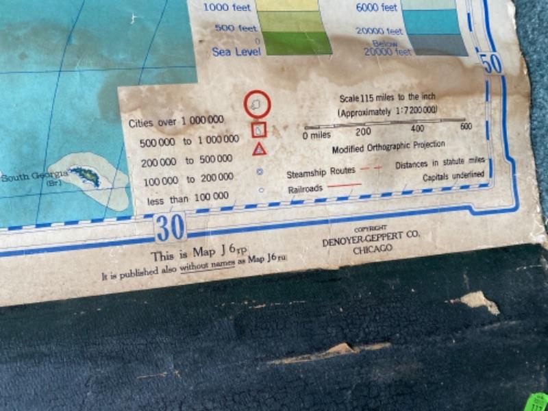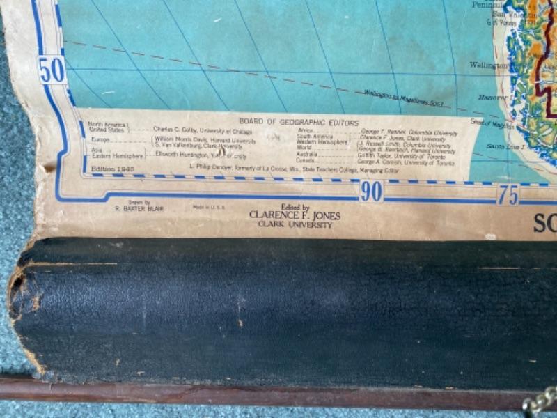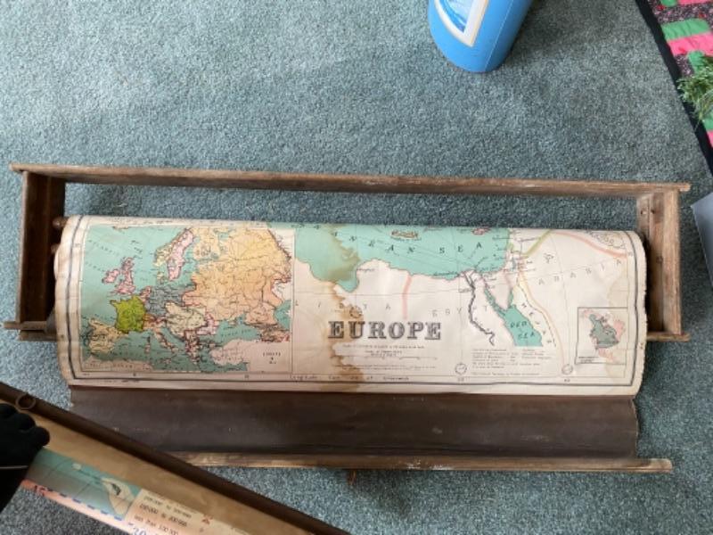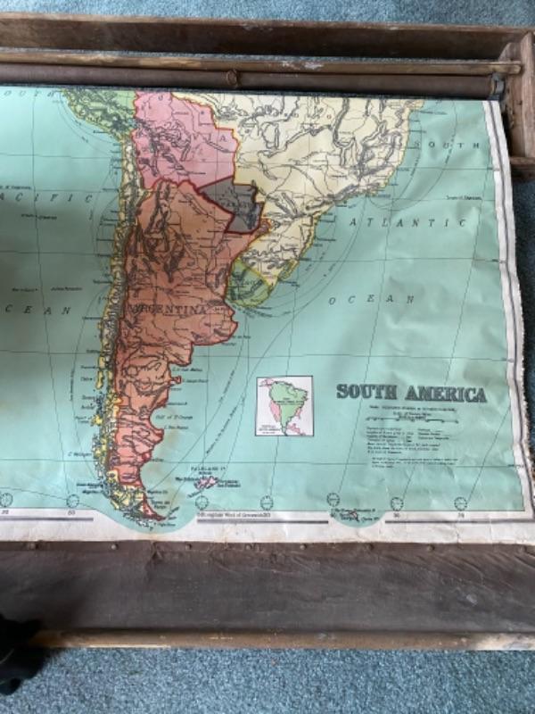 Antique Wooden Map Rack with Antique School House Pull down maps of Europe and South America . Rack measures approximately. 46.5” x 11”