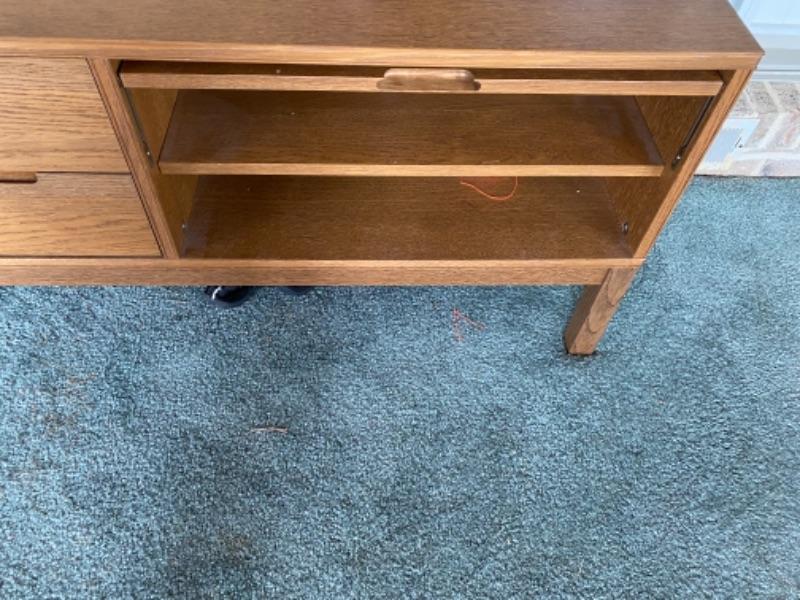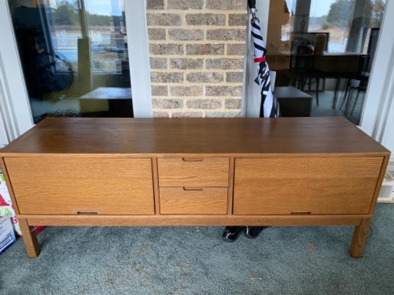 IKEA Sideboard has two doors that lift to open and has 4 shelves and two drawers