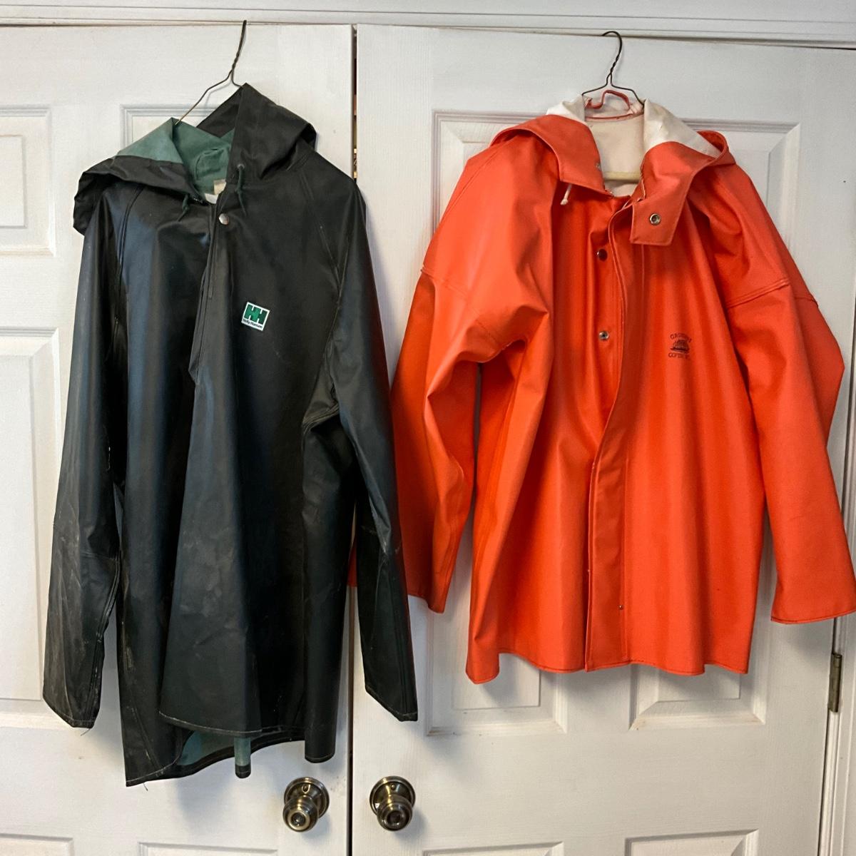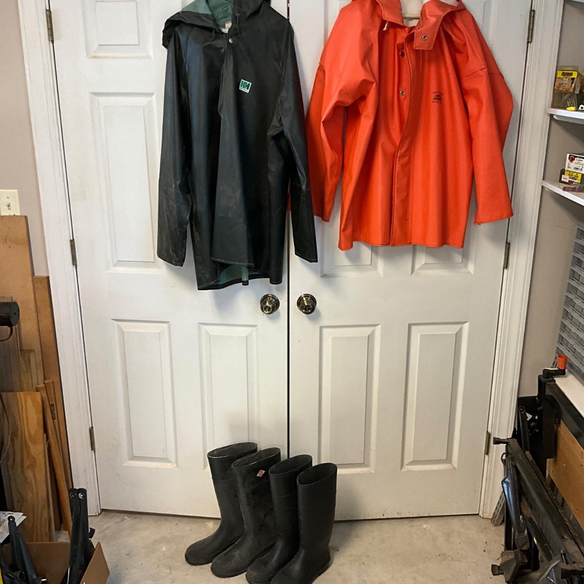 S1719 Two Rain Jackets Helly Hanson @ Grunden Go Fish with 2 pairs of Rainboots