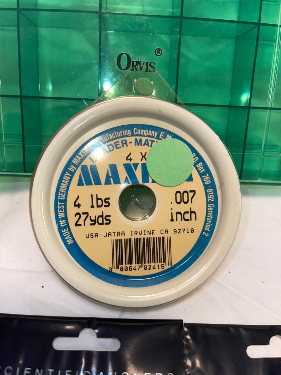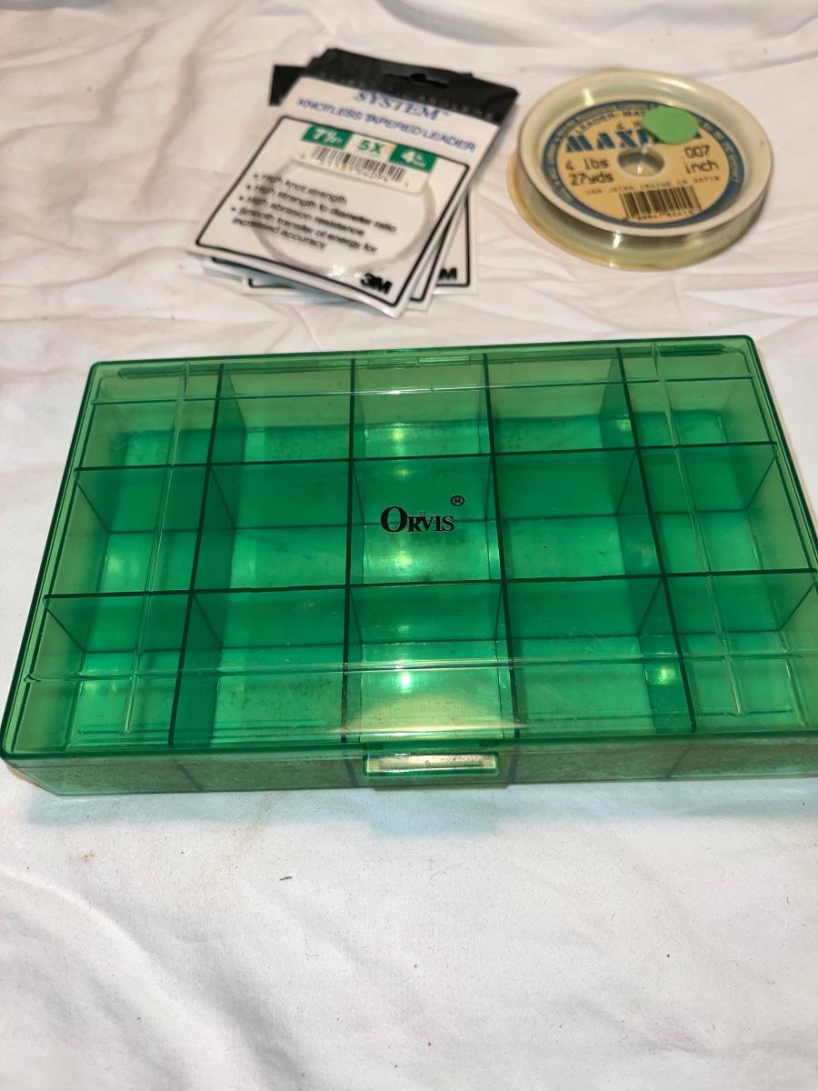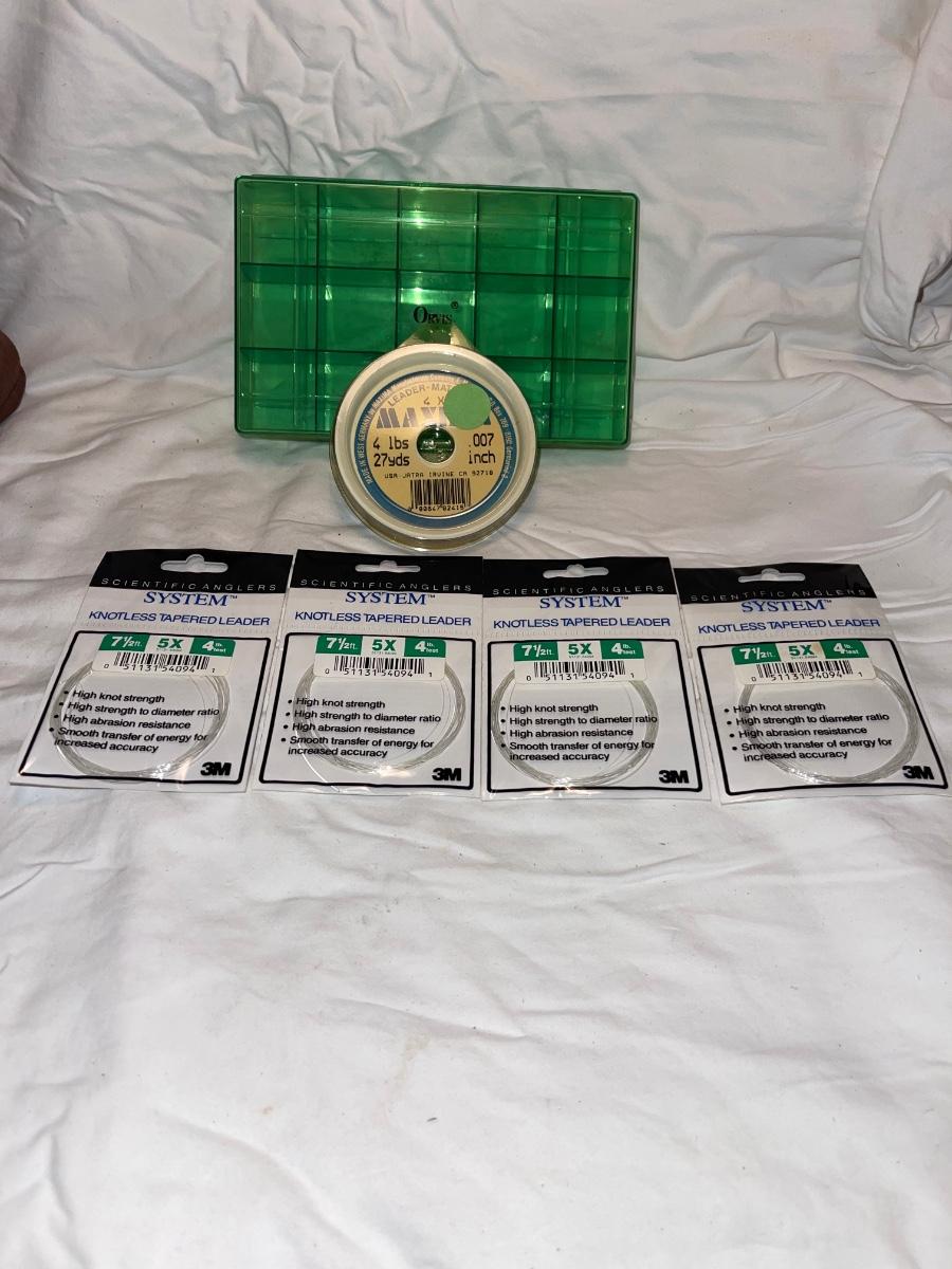 Qty(4) Scientific Anglers knotless Leader Fishing Line by 3M, Qty (1) Maxima 27yds fishing line. Orvis Fly storage box-15 compartments.