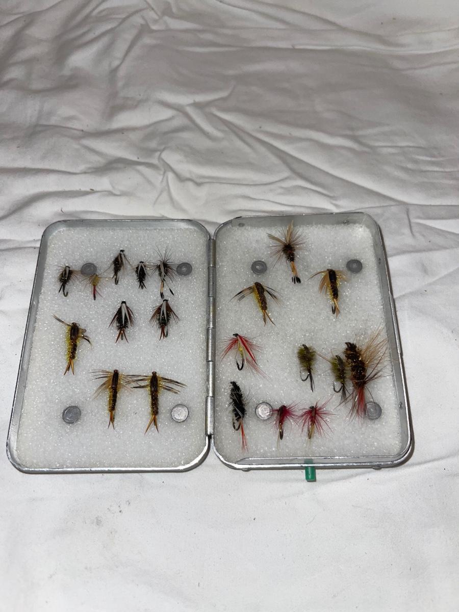 Perrine Aluminum Fishing Fly Storage Case and qty (20) fishing flies.