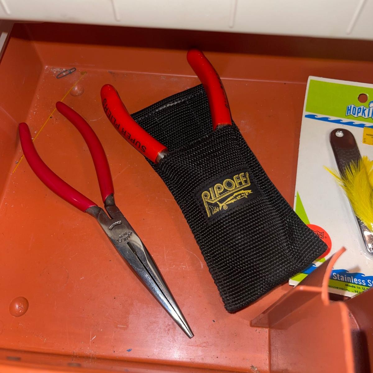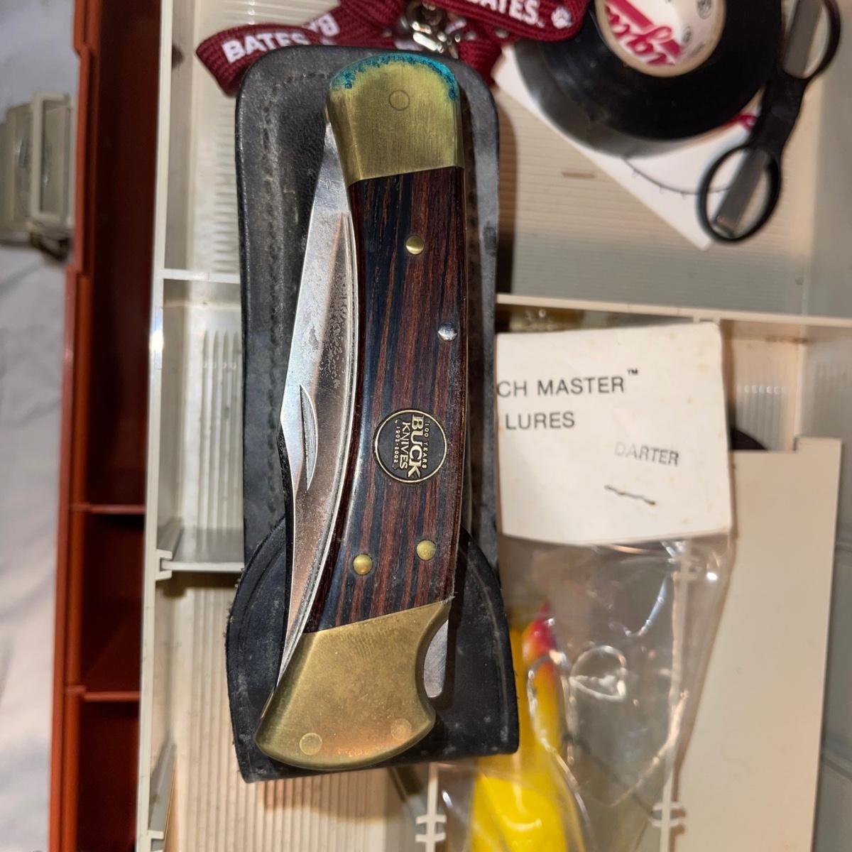 Plano Model 7620 Fishing Tackle Box w/fishing gear to include lures, pliers, knife, etc., see pics.