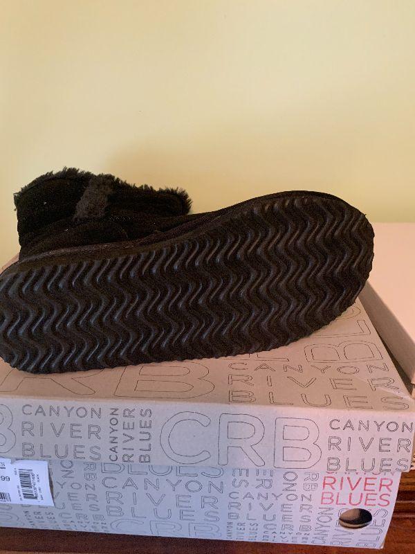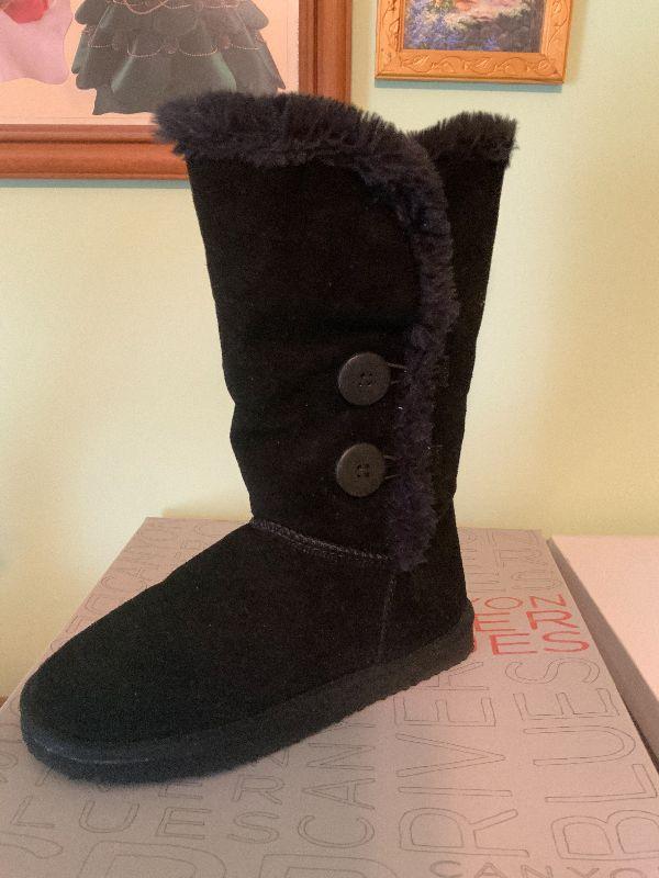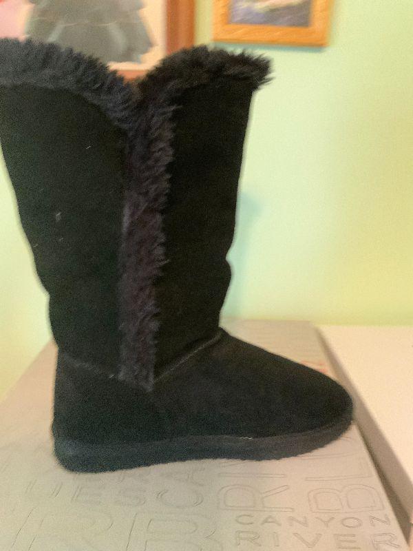 S21: Canyon River Blues. Tall Black Fuzzy Boot. Size 6.