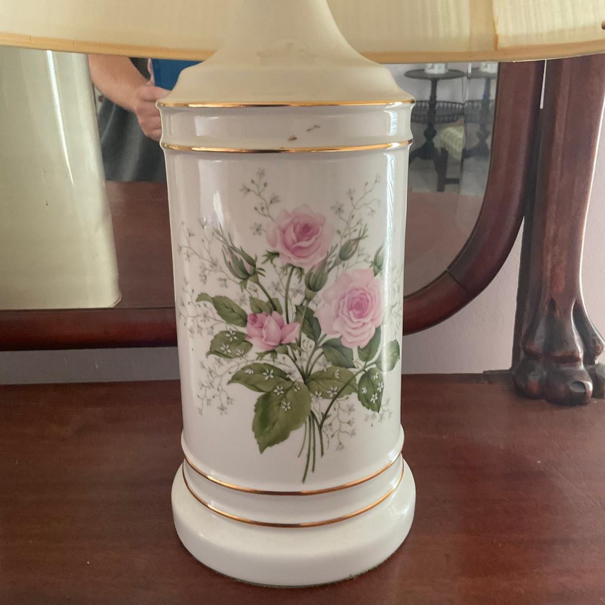 A230 Pair of Rose Floral Lamps With Matching Waste Can