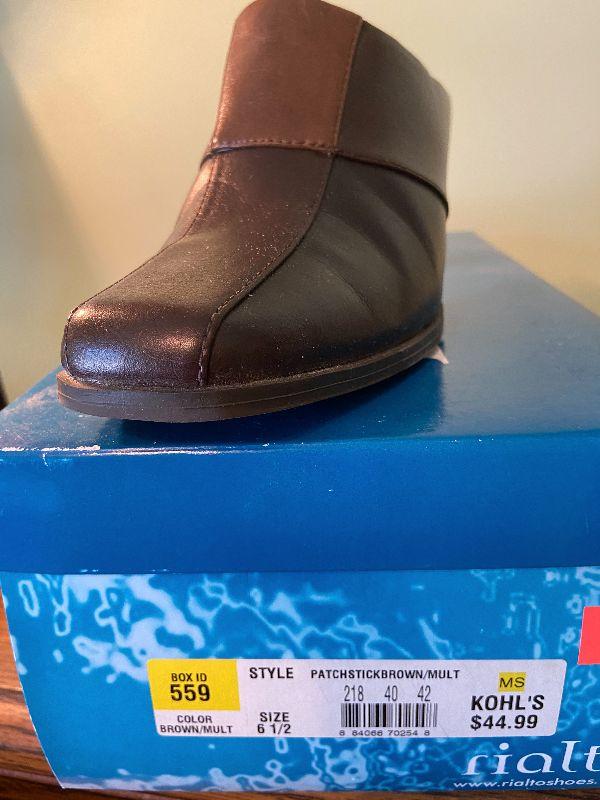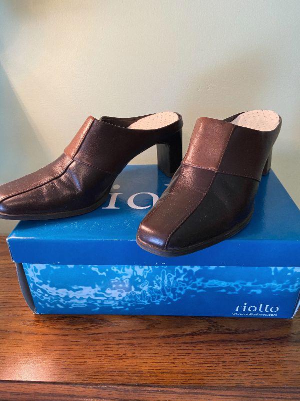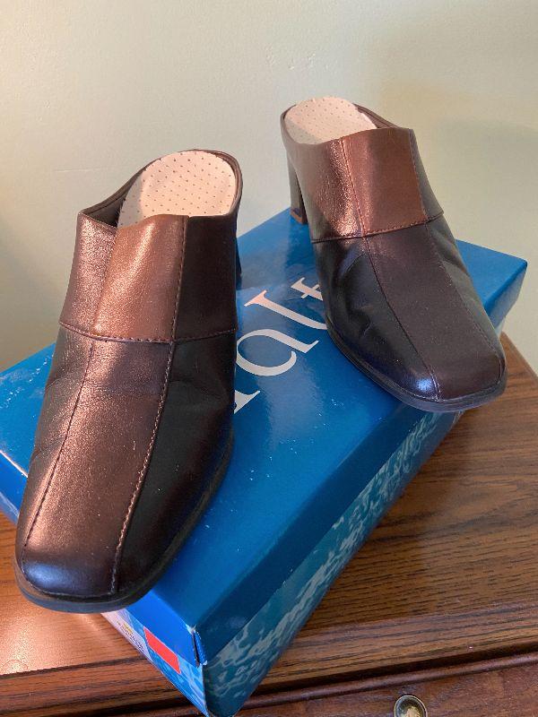 S3: Women's Multi Brown Patchwork Clog With Heel.