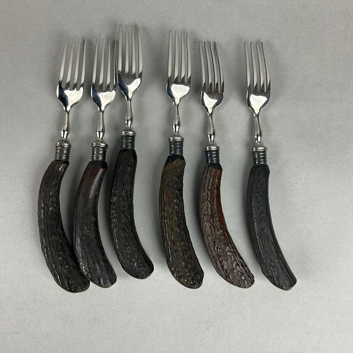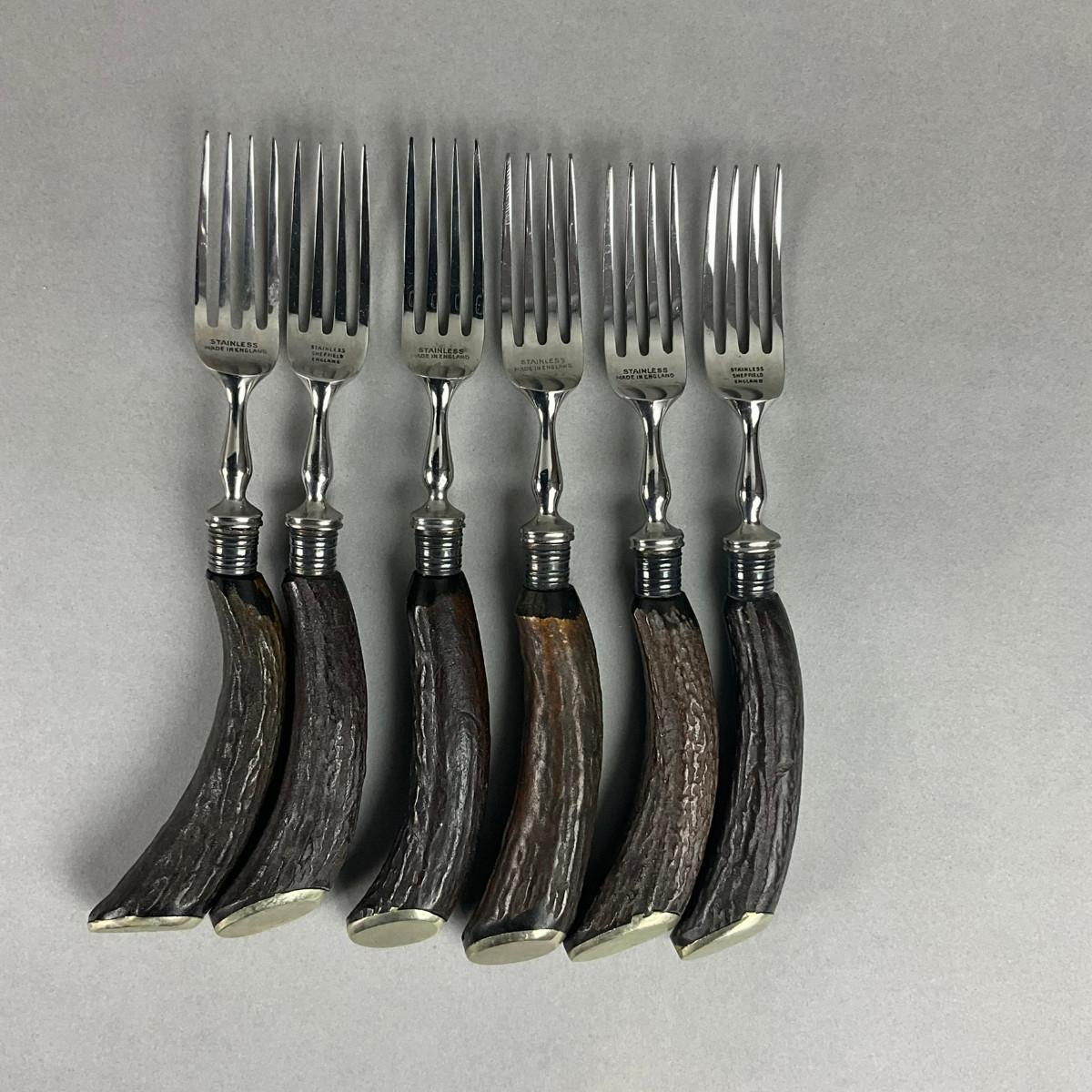 S346 Set Of Six Sheffield Silver Ferruled Steak Forks WIth Red Deer Stag Antler Handles