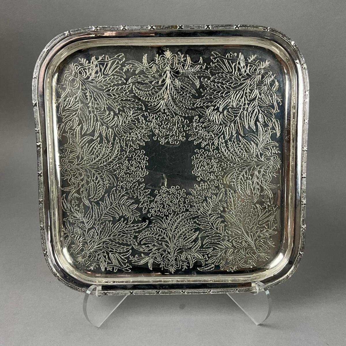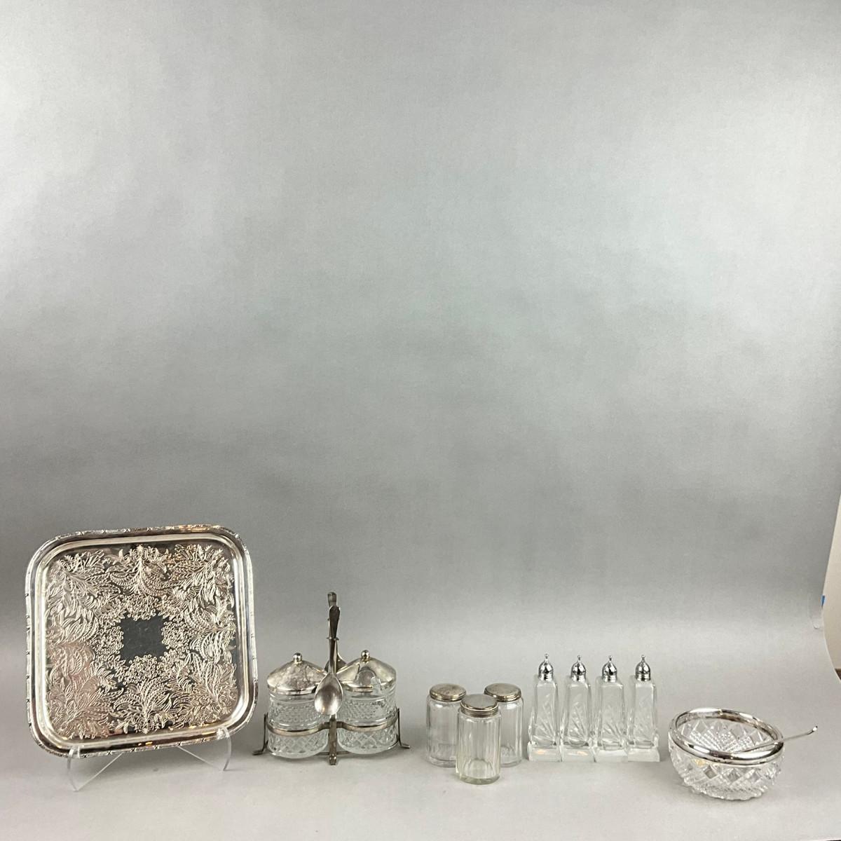 Silver plated cruet set, crystal cut bowl with silver plated serving spoon, 4 salt and pepper shakers, 3 lidded containers, silver plated serving tray
