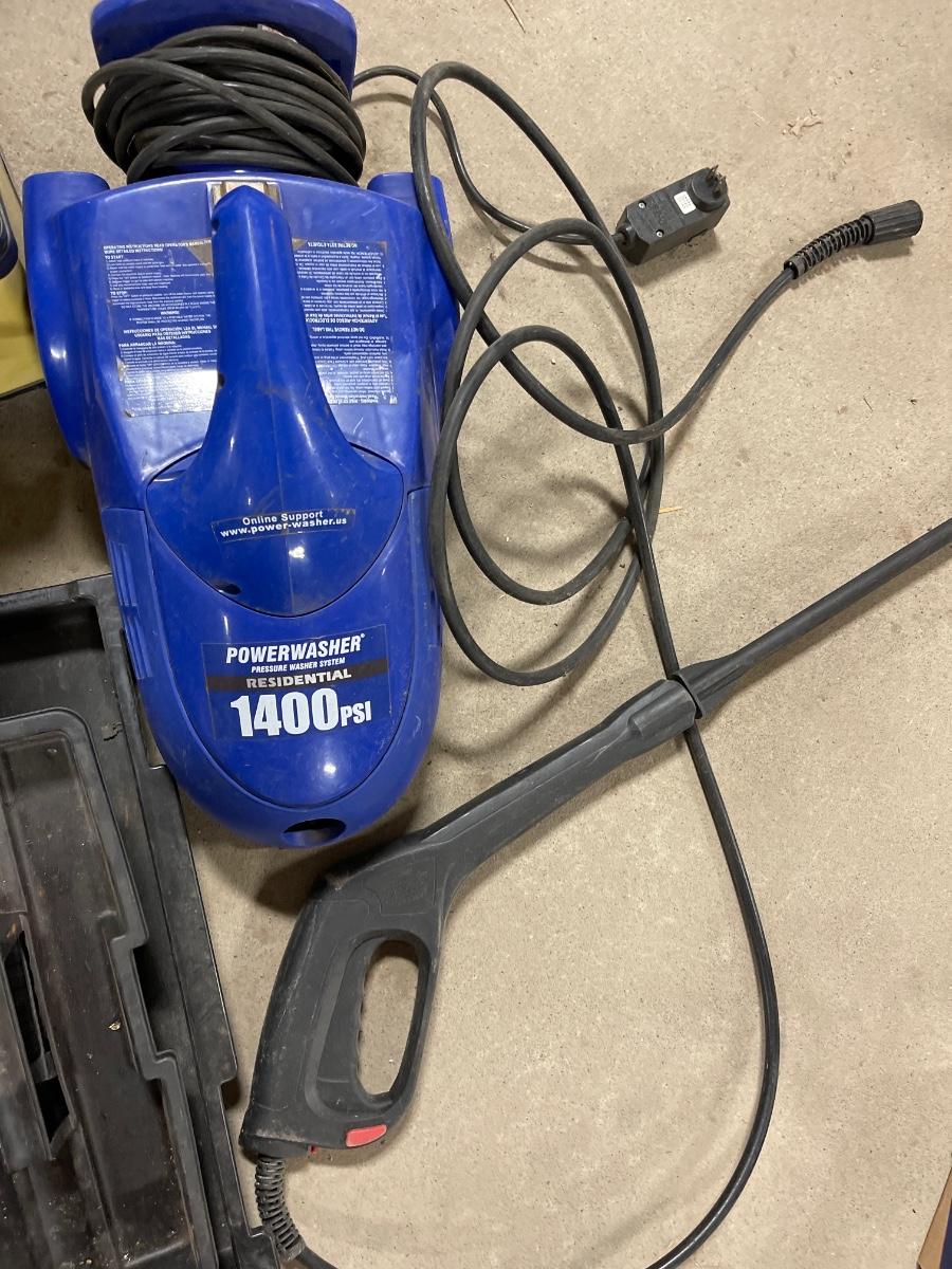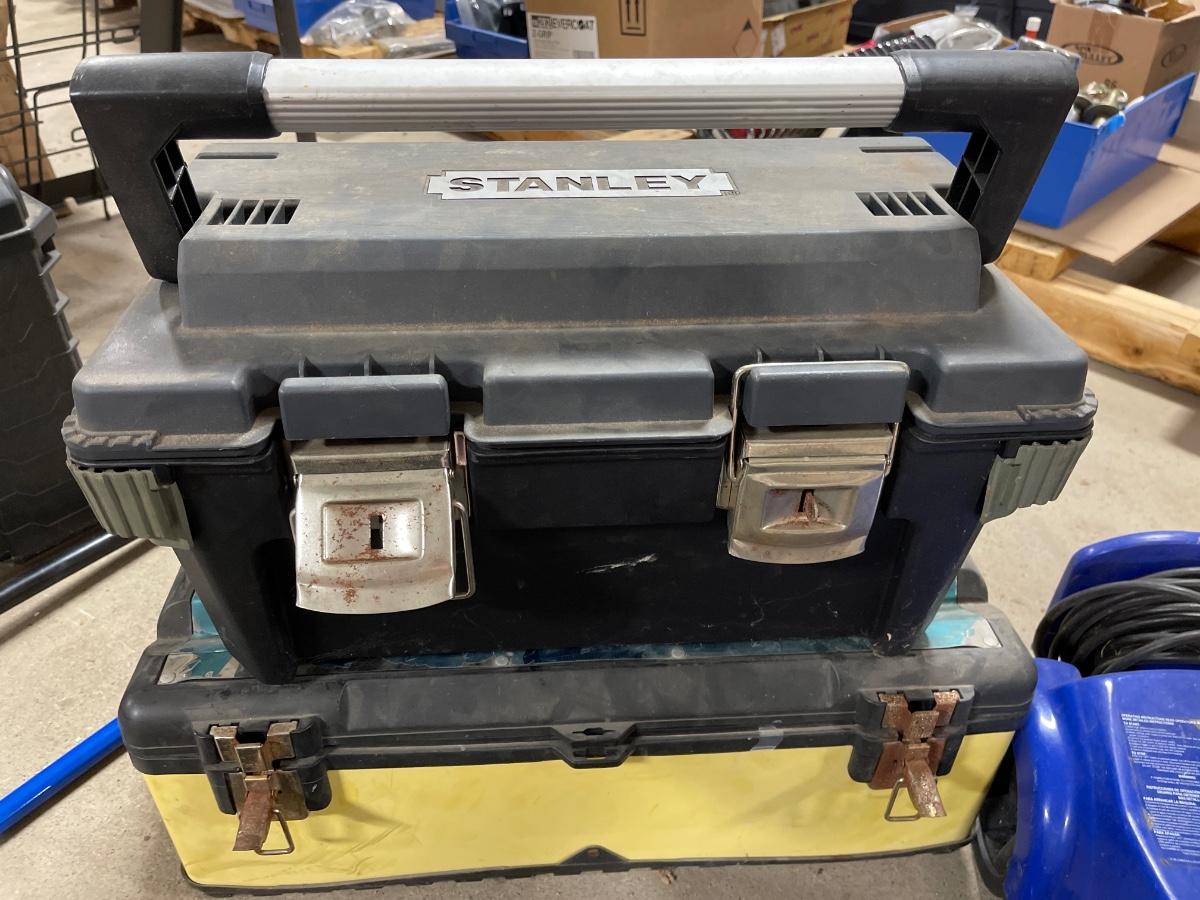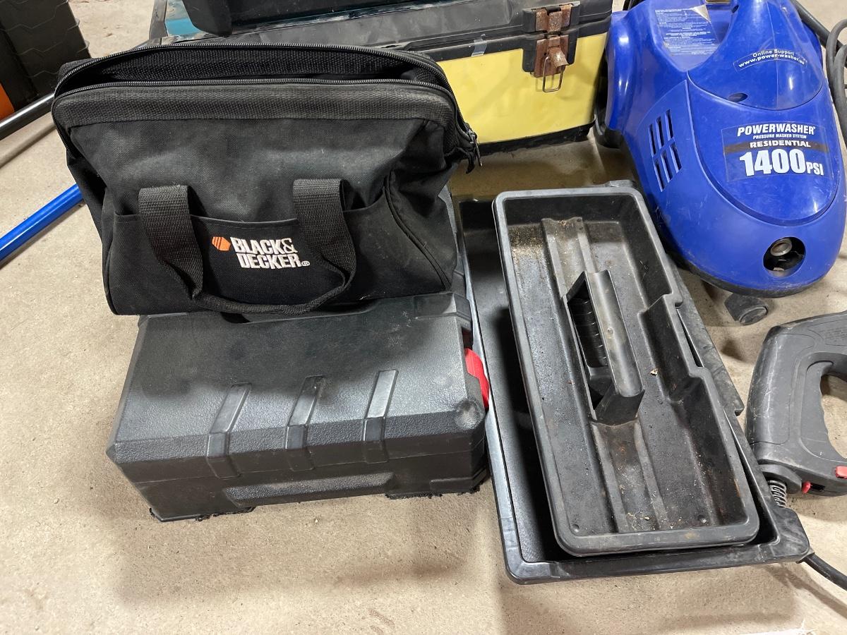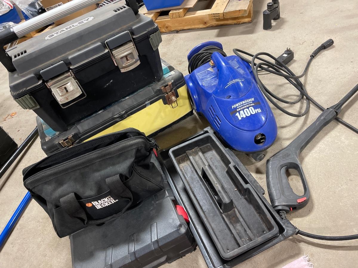 All tool boxes and bags are empty, back Stanley has an Organizer tray.  Power washer is as is, has not been tested.