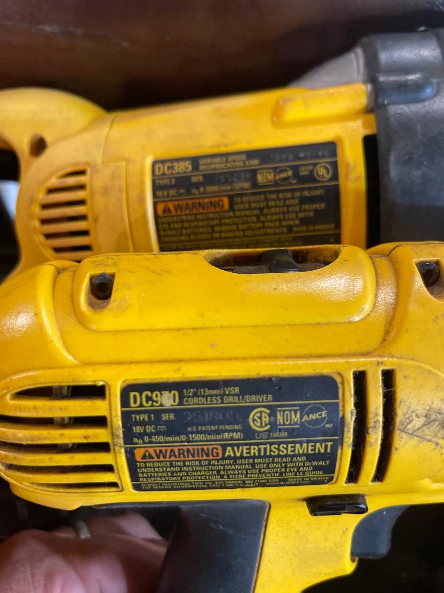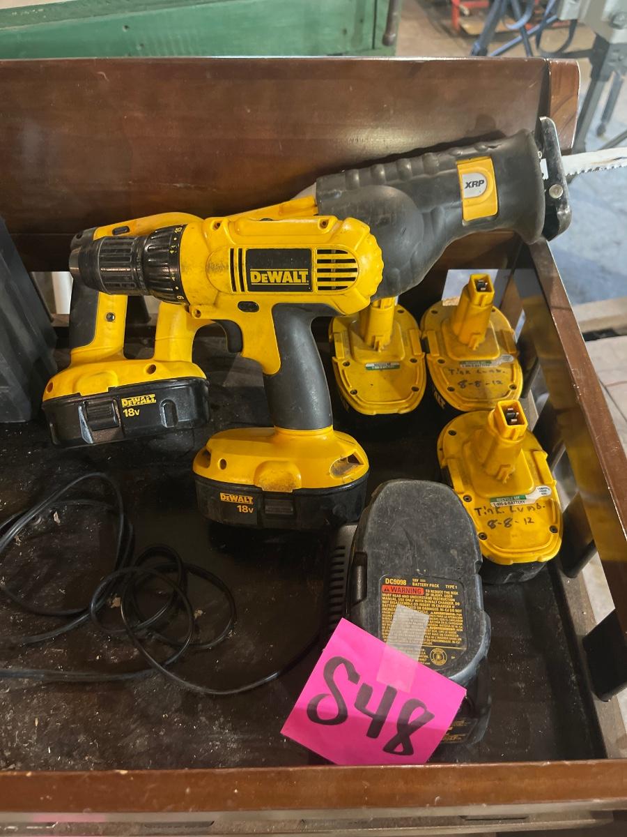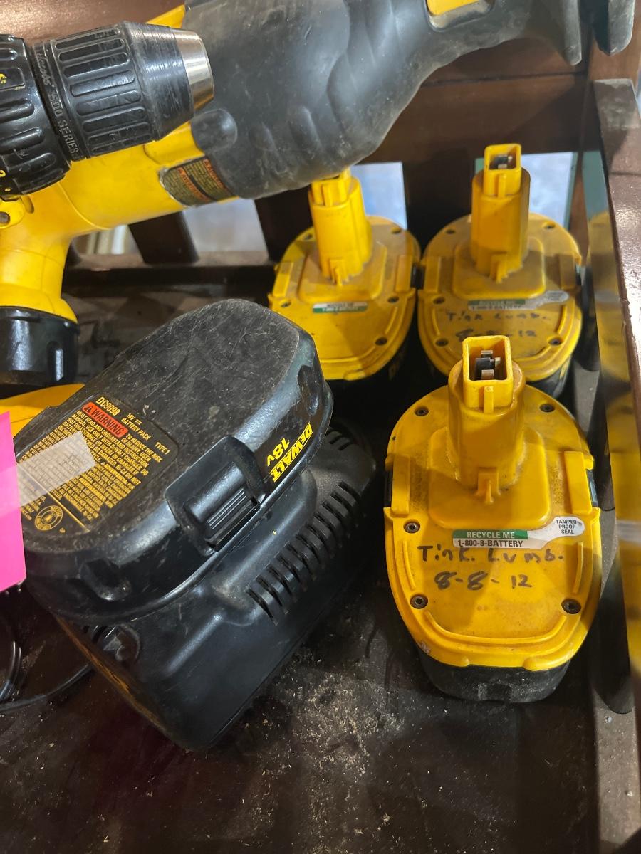 Six batteries, a charger, a reciprocating saw and a cordless drill