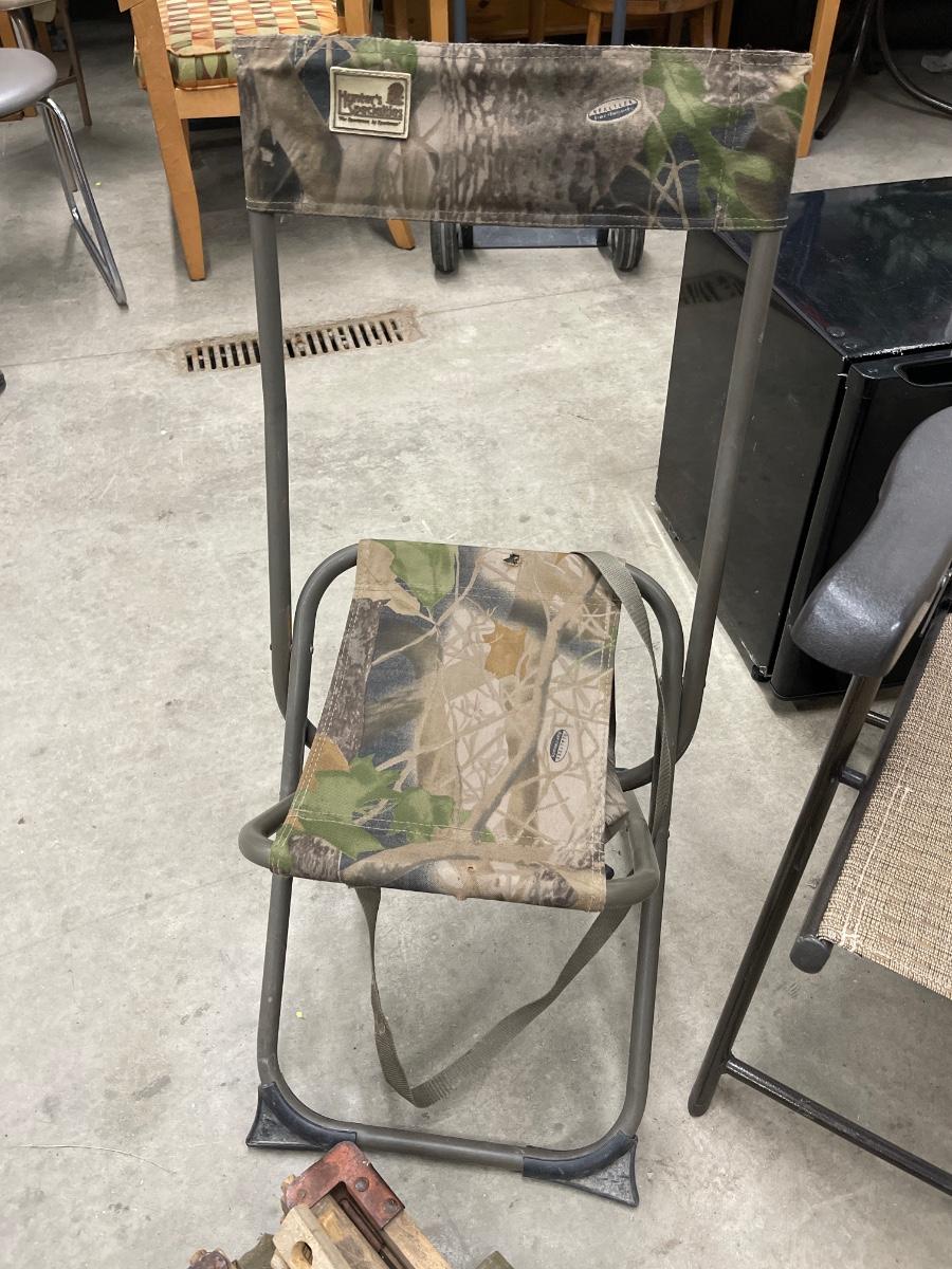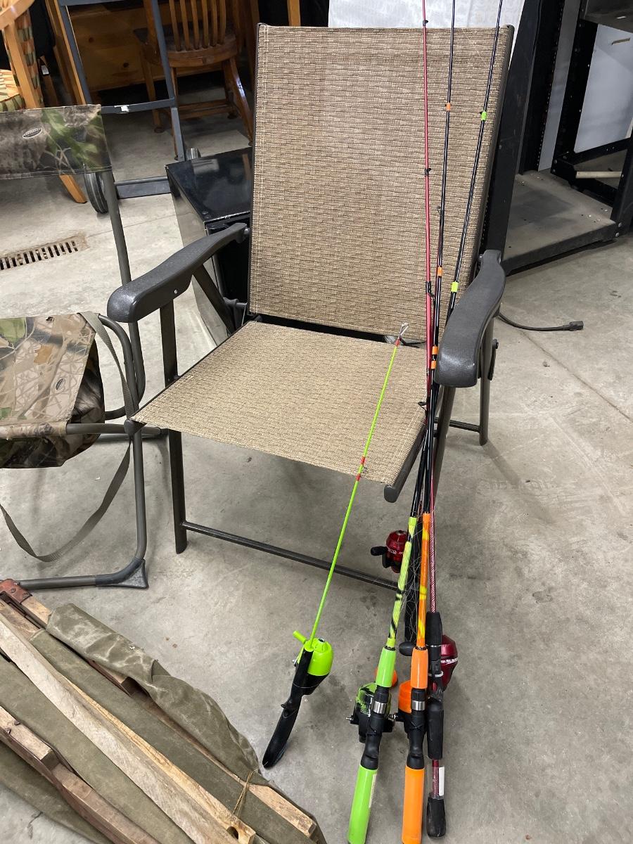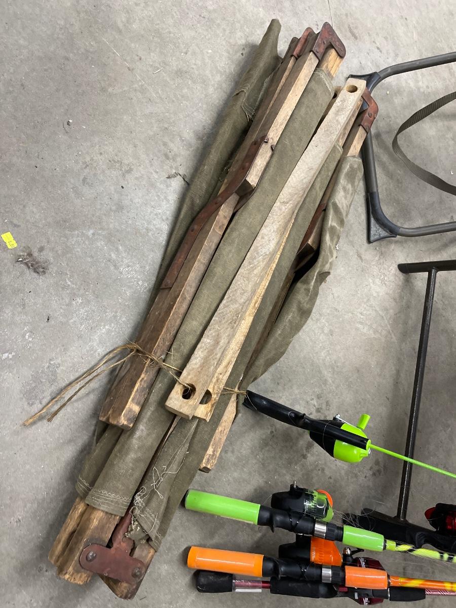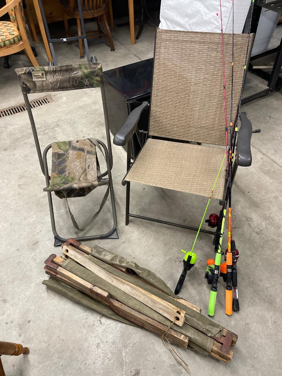 Lawn chair, hunting stand chair, Military cot and miscellaneous fishing rods. As is.