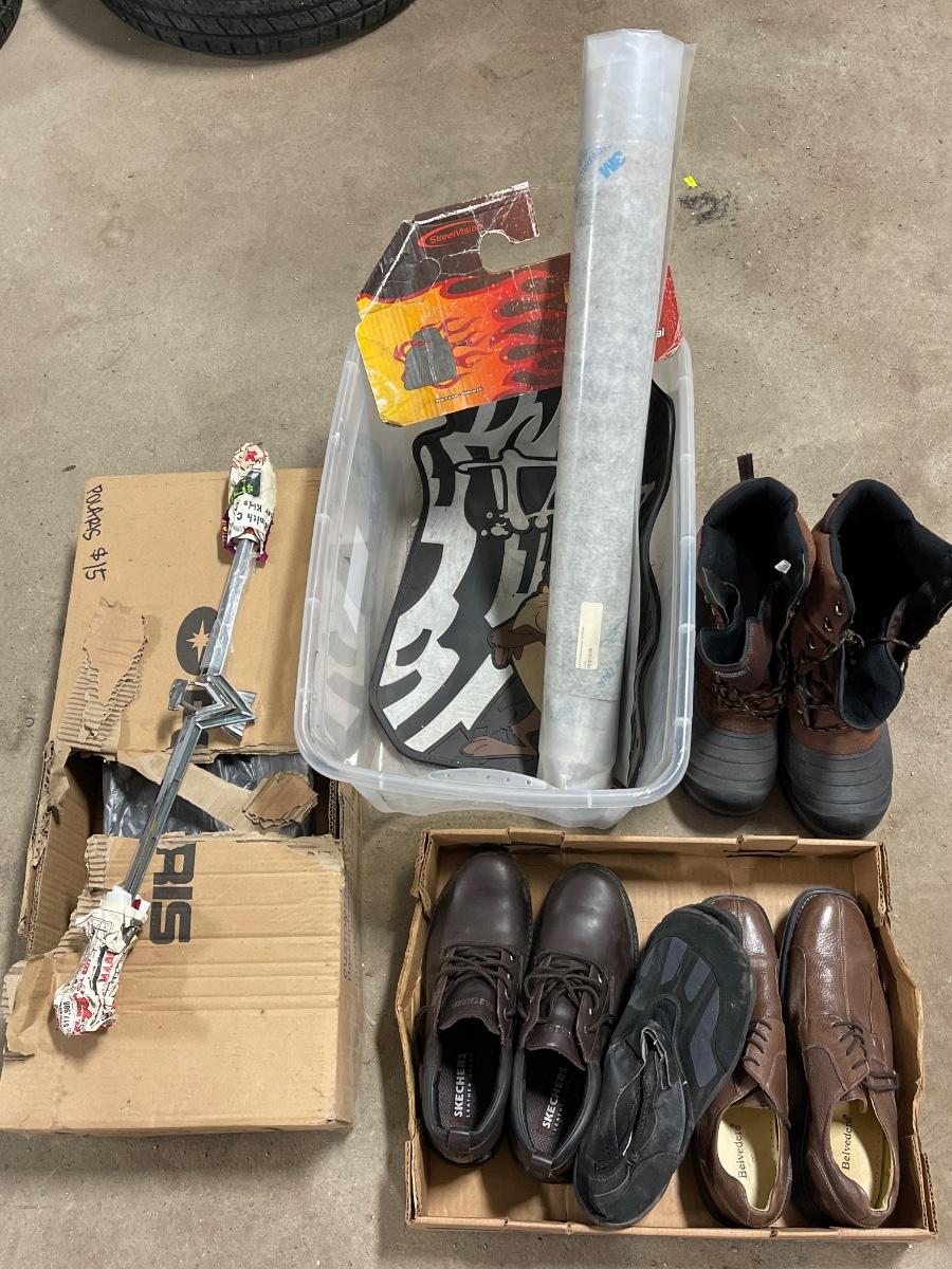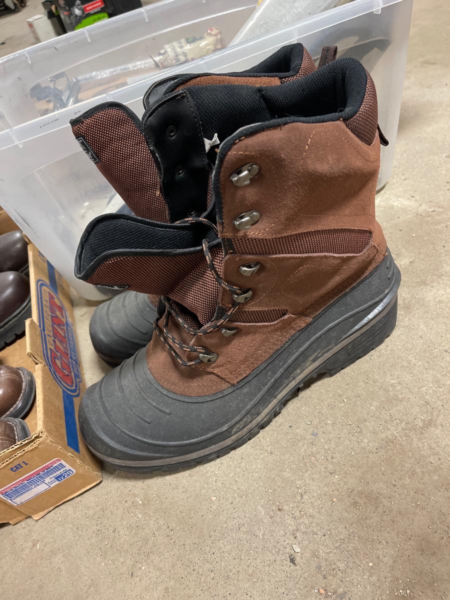 Boots are size 14 men’s, light brown shoes are size 14 D, water shoes are size 13 - 14 and dark brown shoes are size 13.