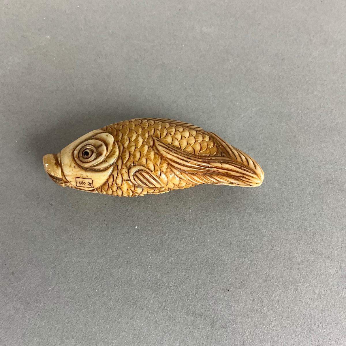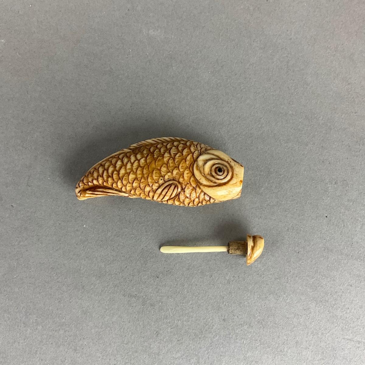 S808 Vintage Bone Carved Koi Fish Snuff Bottle