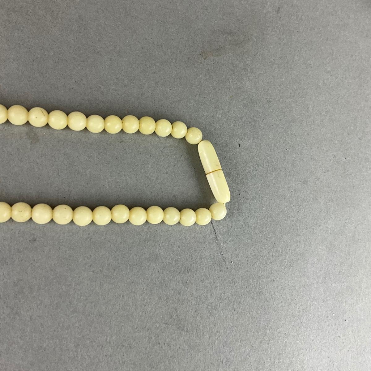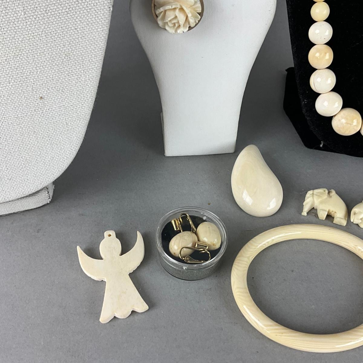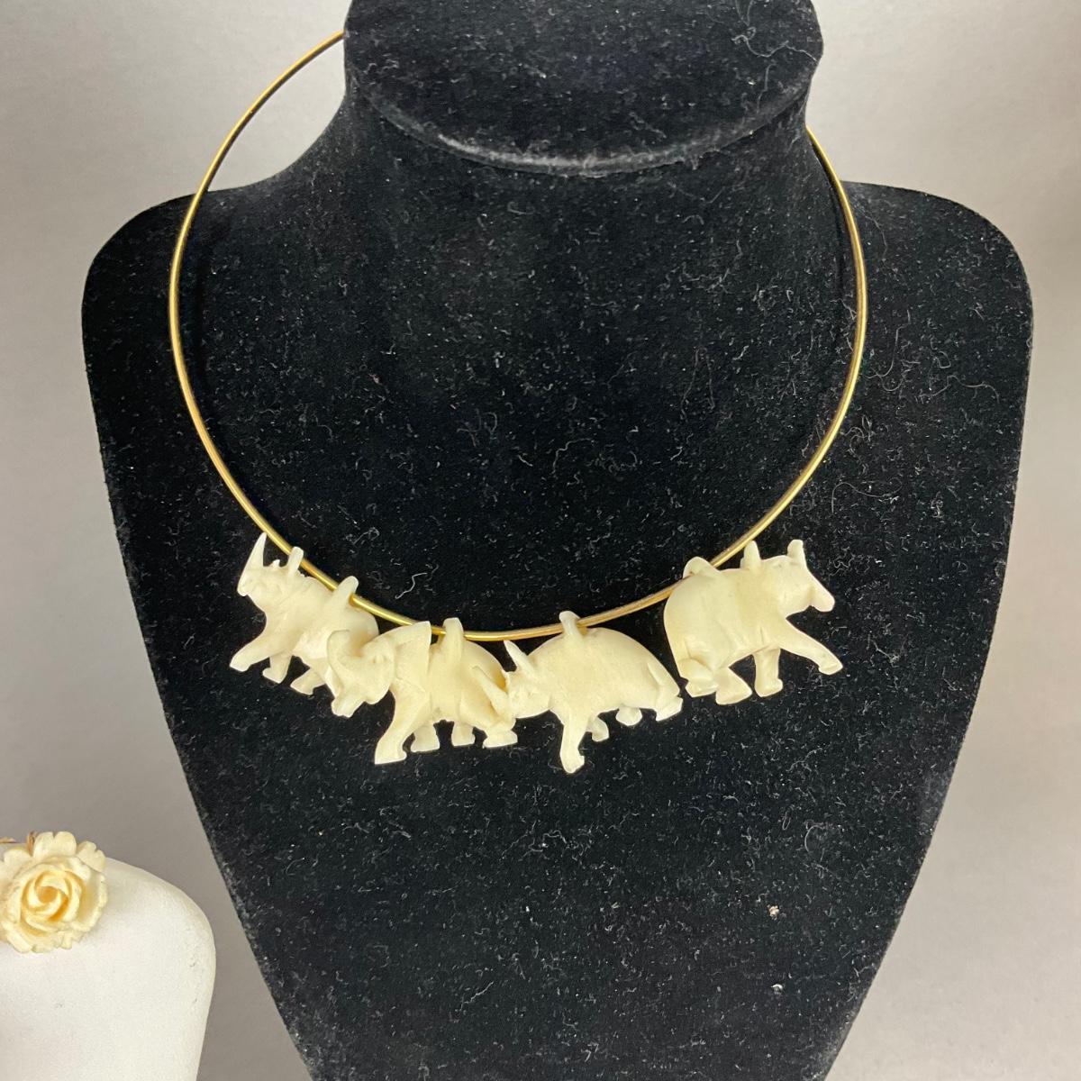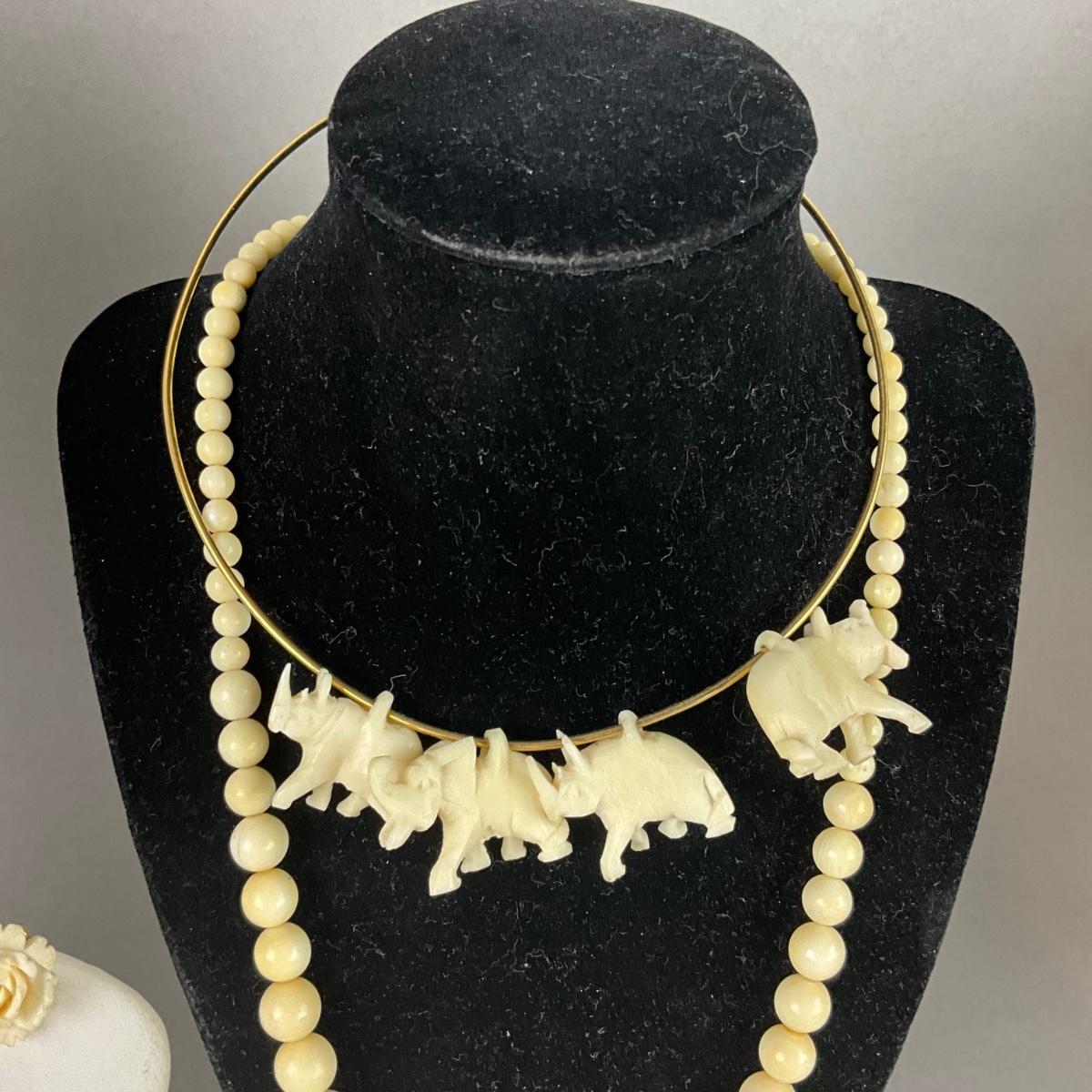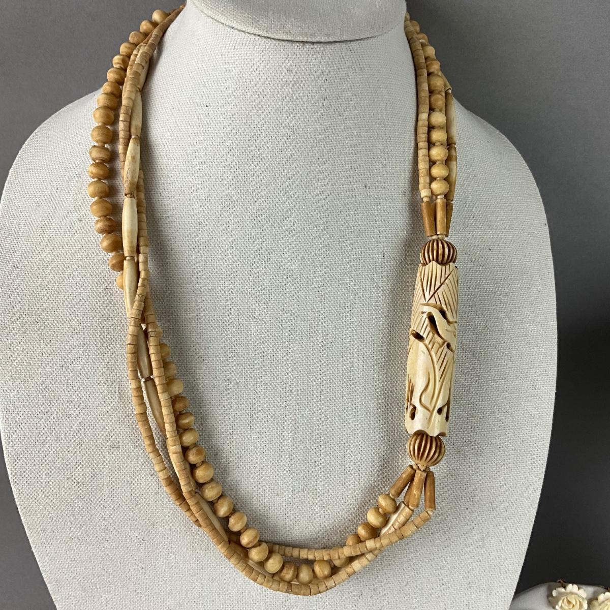 22" graduated bead necklace with hidden clasp, choker with several carved animals, floral bone pin and earring set, clip earrings, angle, slip on bangle and large necklace 28" with wood and bone