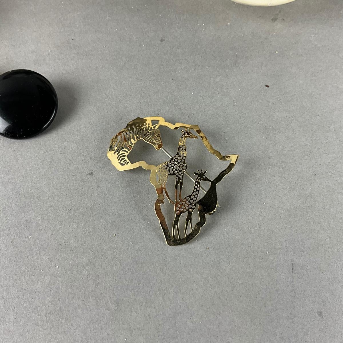 Horn Slip on bracelets, clip earrings, painted seed pod with matching clip earrings on leather rope, stone necklace is 24" long and wild bryde safari brooch, black clip earrings , carved wooden safari necklace
