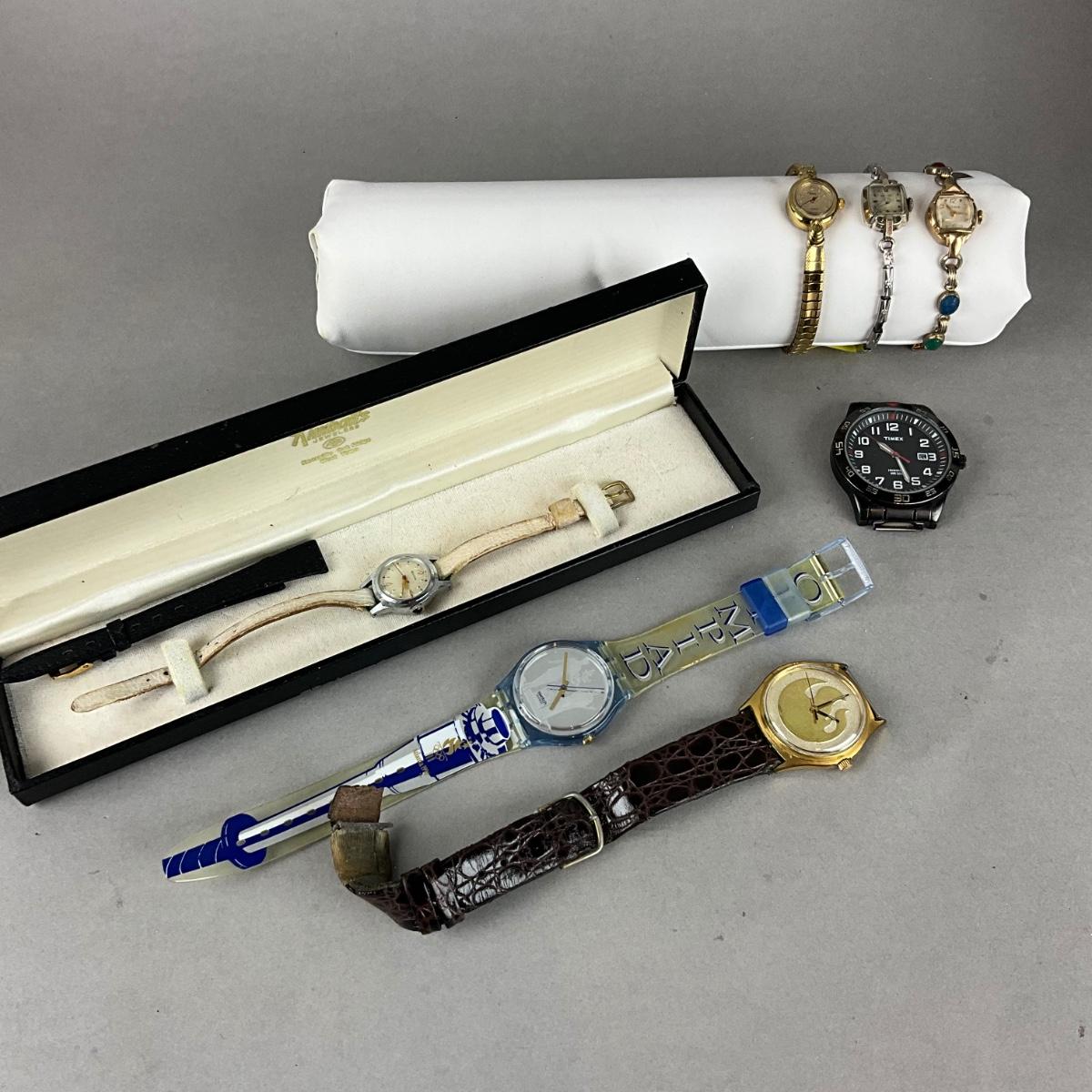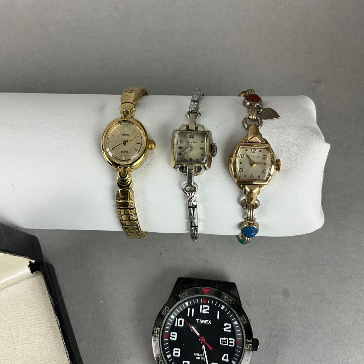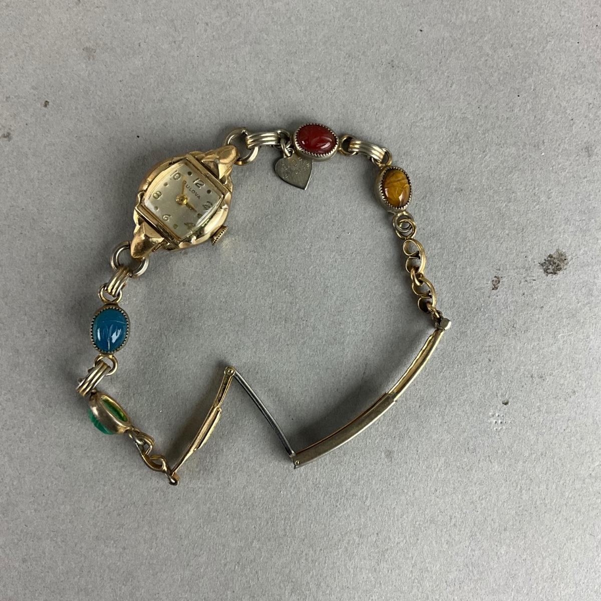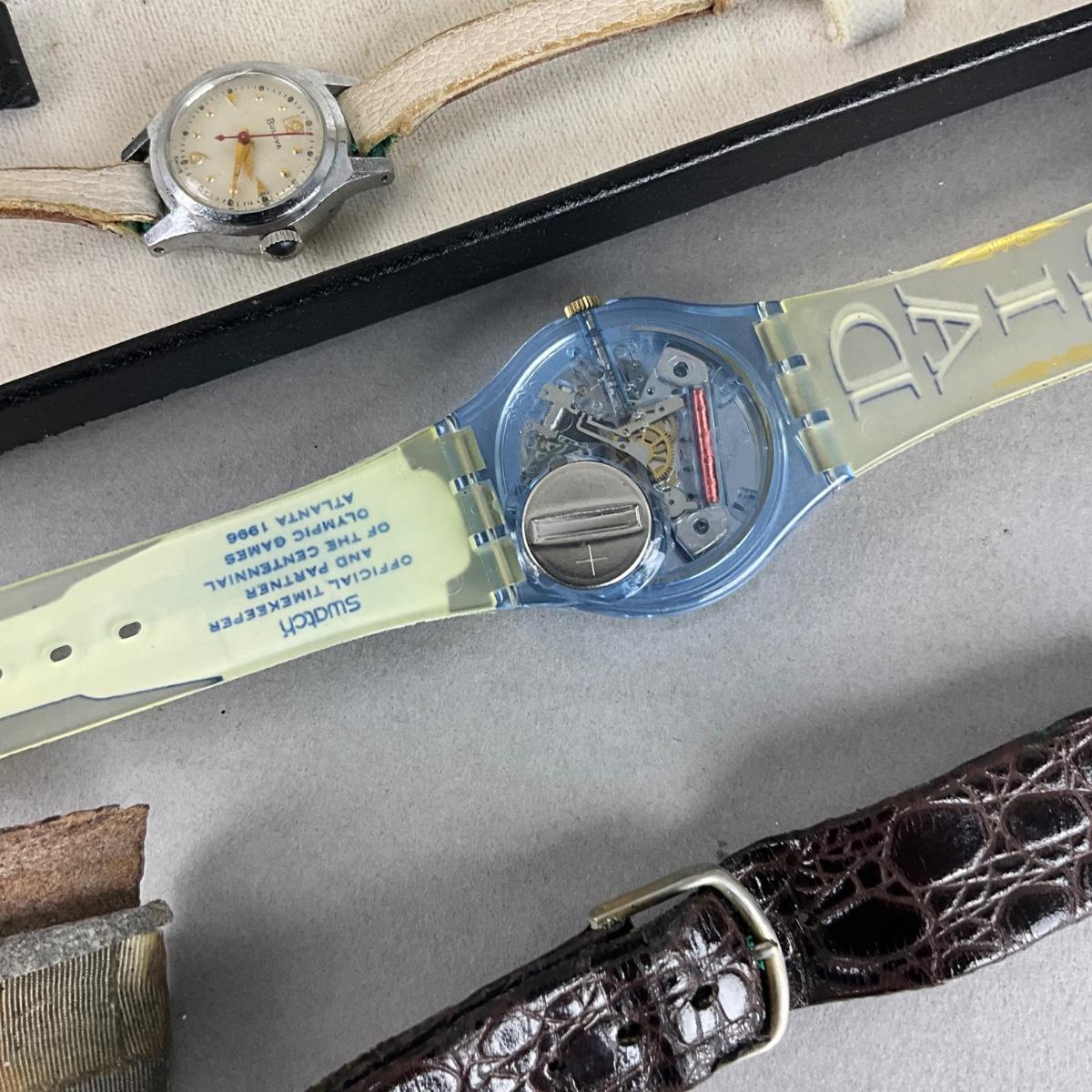 3 bulova ladies watches two are in working condition and are manual winding and 2 are gold filled , others need batteries and one of mens leather band is torn and is from the 1982 world's fair, Olympia Swatch watch - not working needs battery