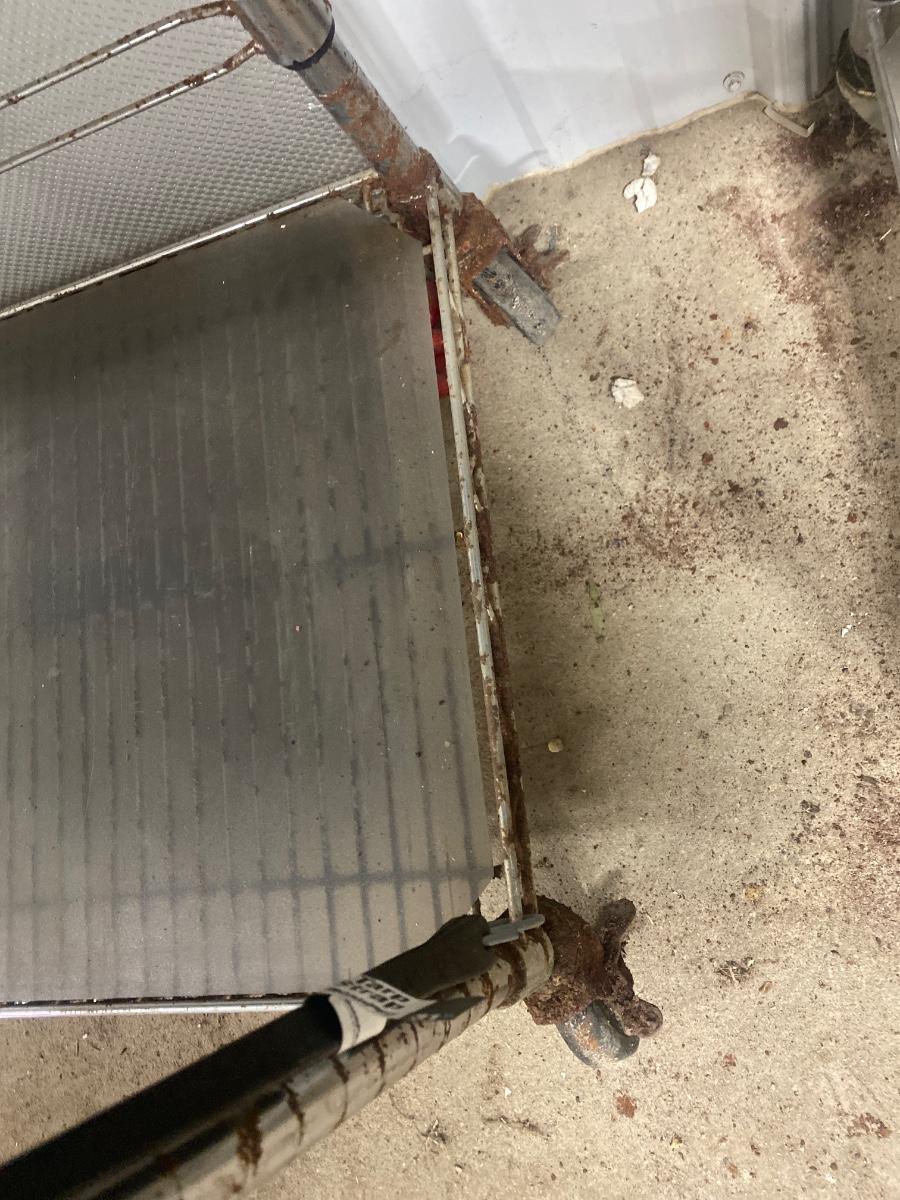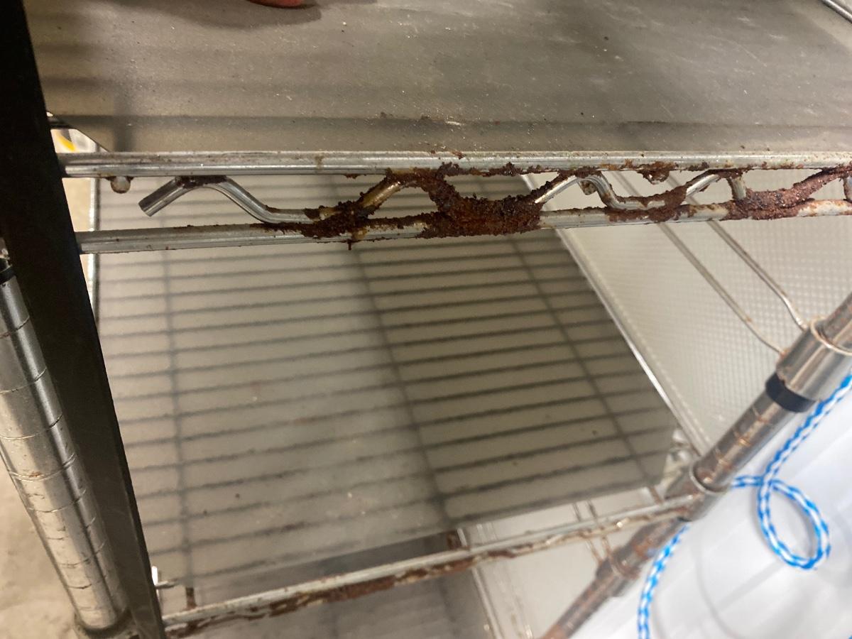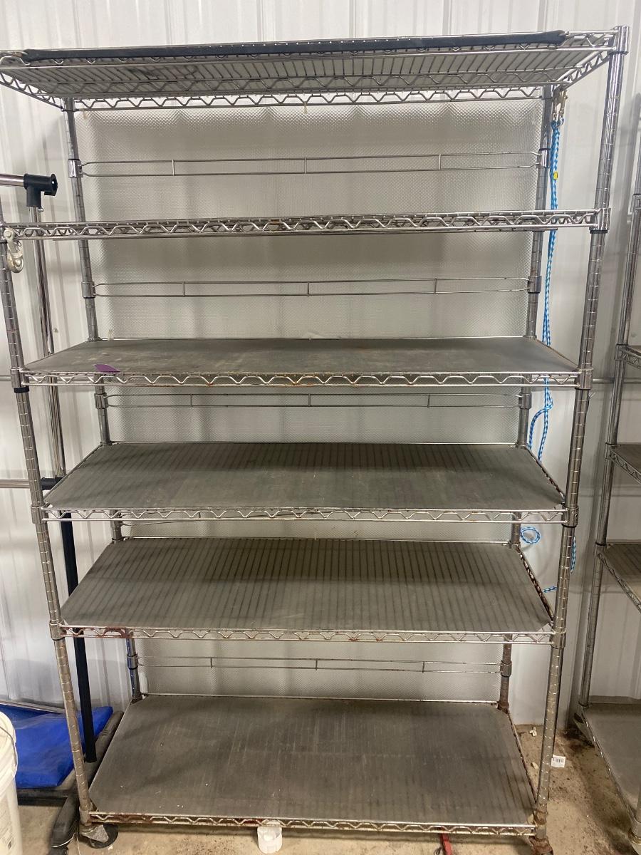 S88 Metal shelving on wheels, 75 and three-quarter inches tall, 18 inches deep, 47 1/2 inches wide. Has rust