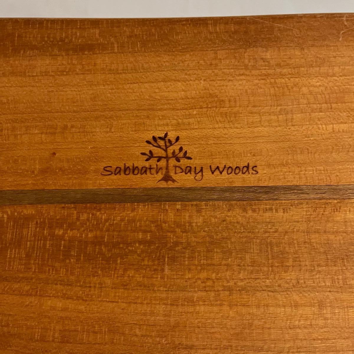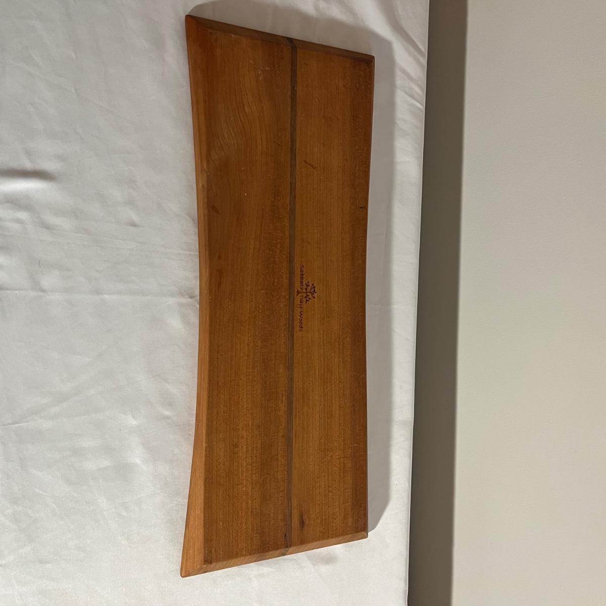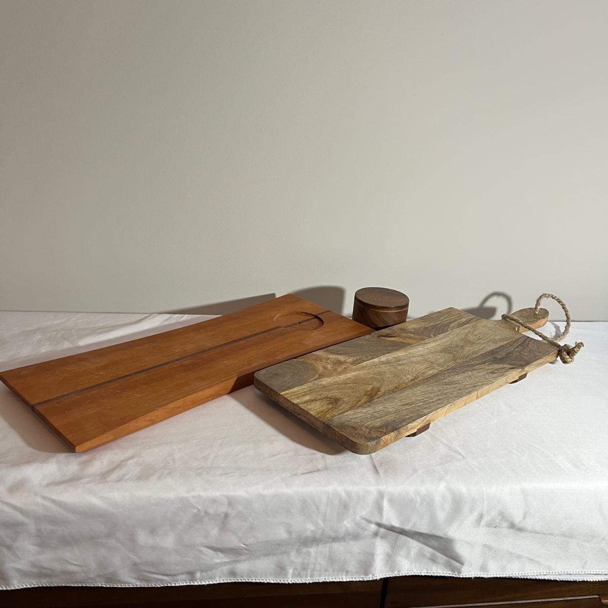 Lot includes a Sabbath Day Woods breadboard, Lipper International wooden container with lid and an unmarked wooden cutting board. Cutting board measures 8” x 23.5” x 1.5”.