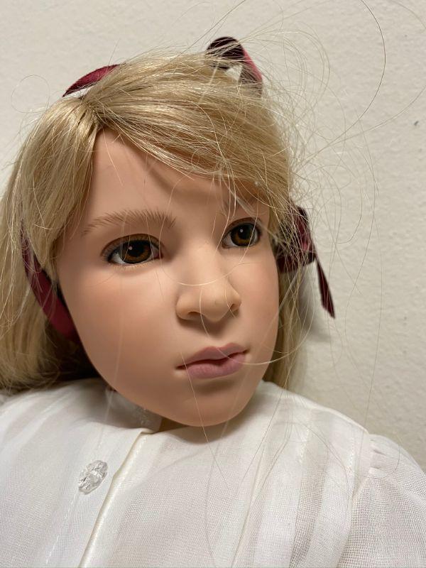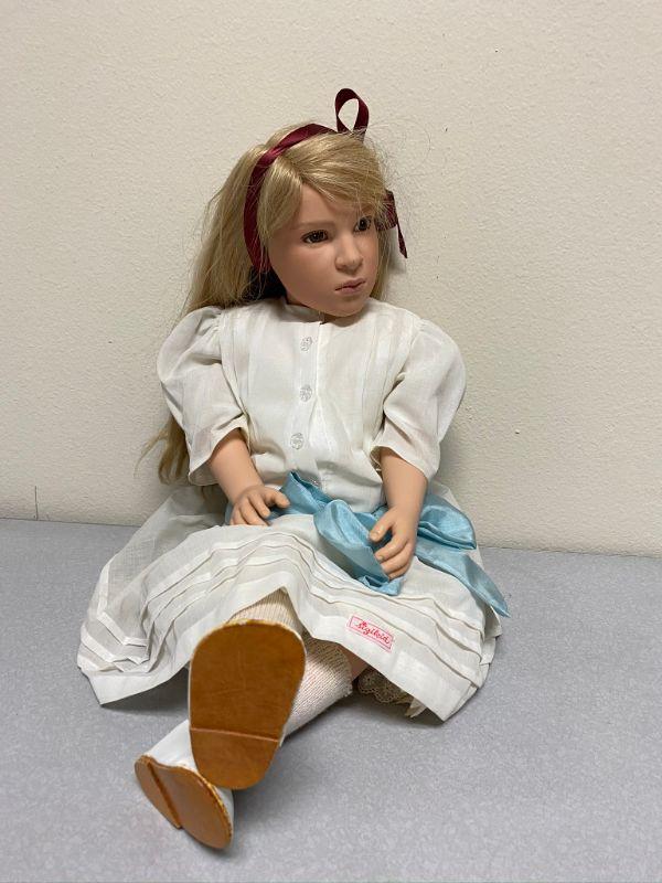 Sigikid Doll by Sabine Esche. Vinyl limbs & head, soft body. Painted eyes, blonde hair. Number 438 of 500. May be dusty and clothes discolored from age and being displayed. Needs a little refresh.