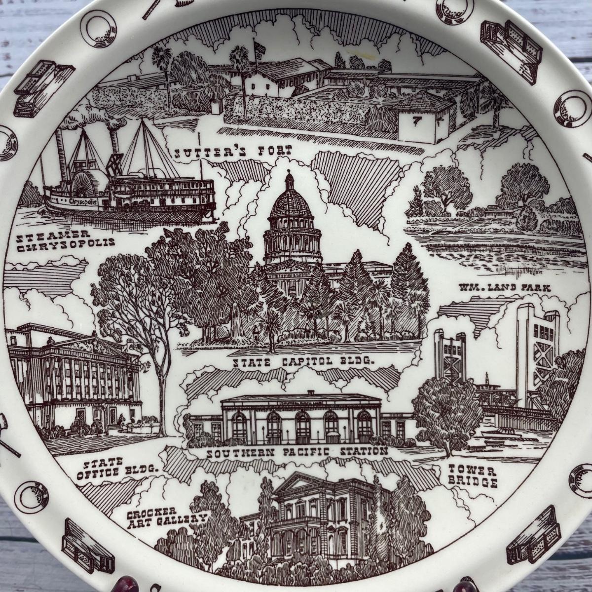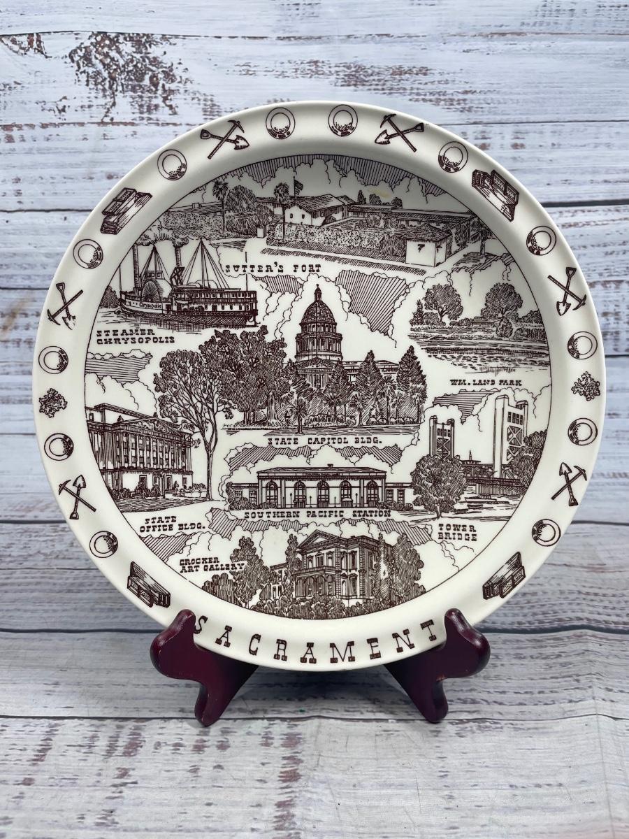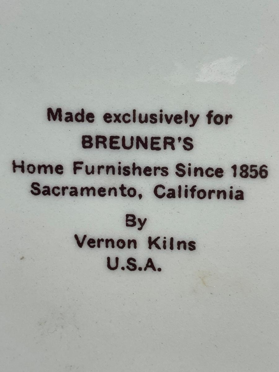 This plate is in good condition, but it has some discoloration and small scratches/chips on the back. There is also a bit of discoloration on the front. The plate was made exclusively for Breuner’s Home Furnishers since 1856 Sacramento, California by Vernon Kilns. The item was made in the U.S.A.