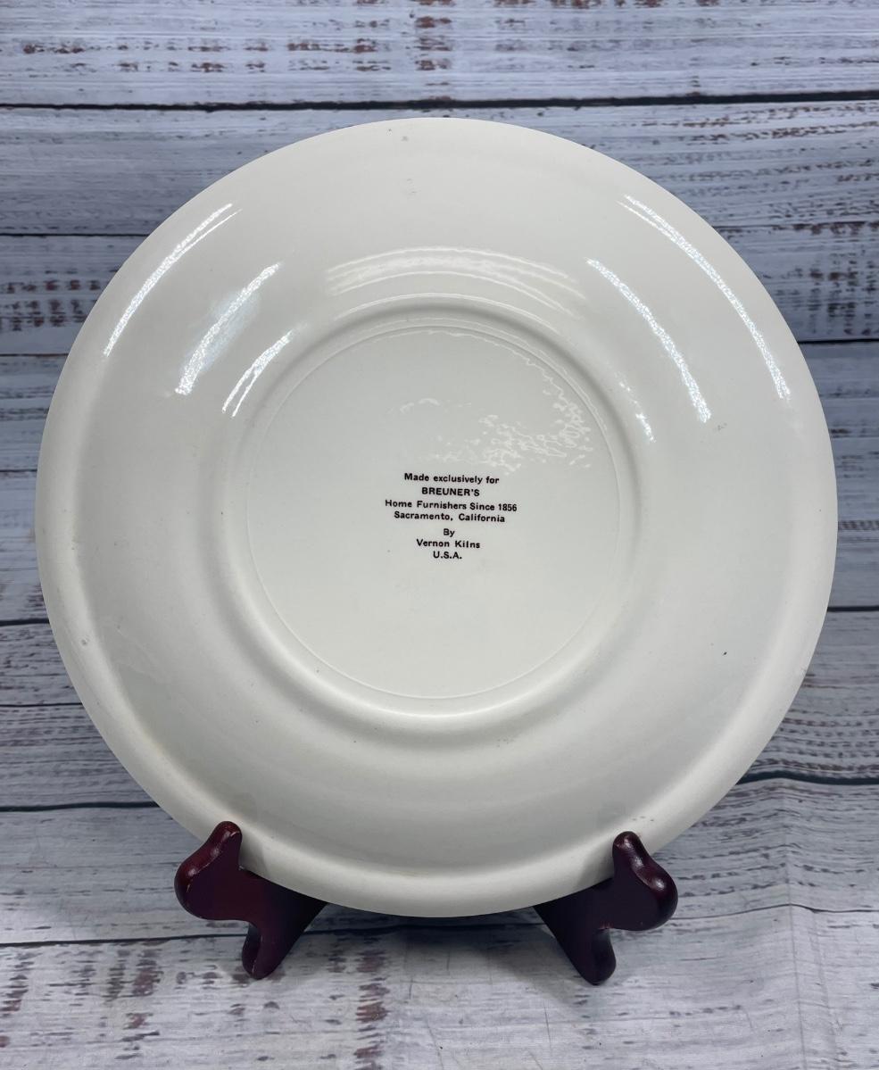This plate is in good condition, but it has some discoloration and small scratches/chips on the back. There is also a bit of discoloration on the front. The plate was made exclusively for Breuner’s Home Furnishers since 1856 Sacramento, California by Vernon Kilns. The item was made in the U.S.A.