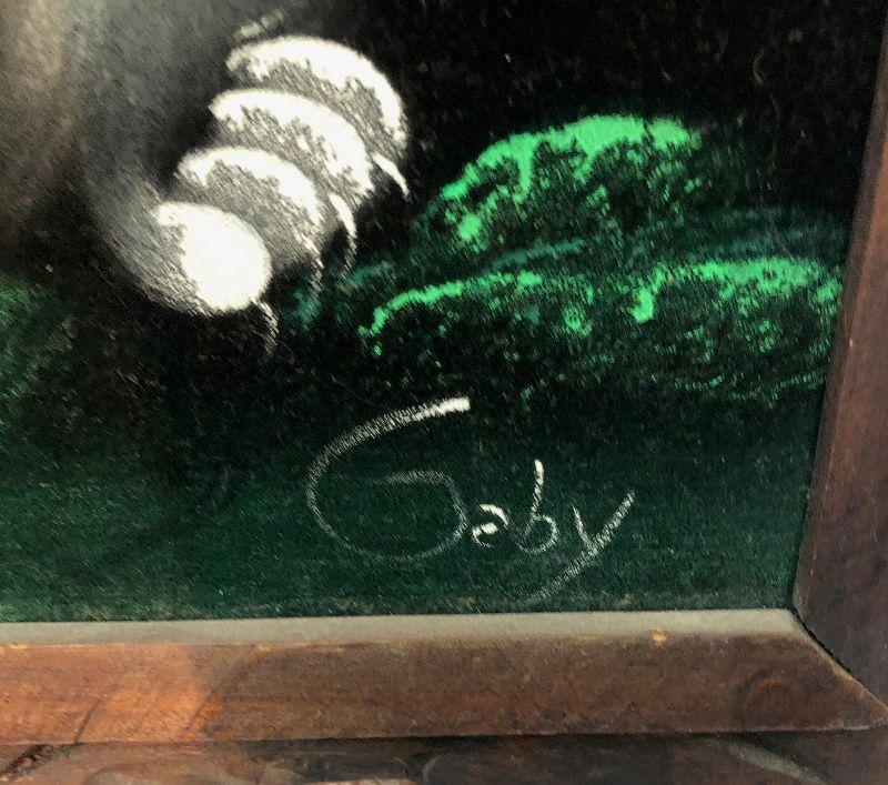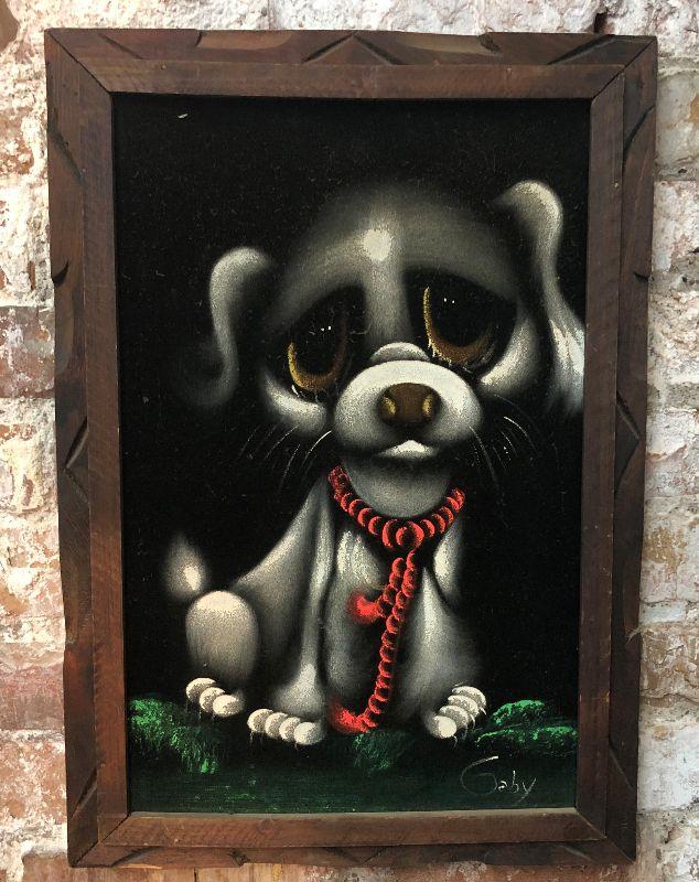 Here is a vintage painting on velvet entitled "Sad Puppy....Signed by the artist Gaby..20 x 14"...Wooden frame...