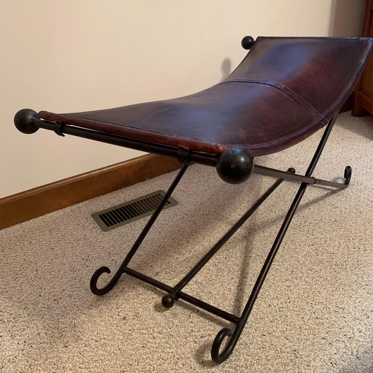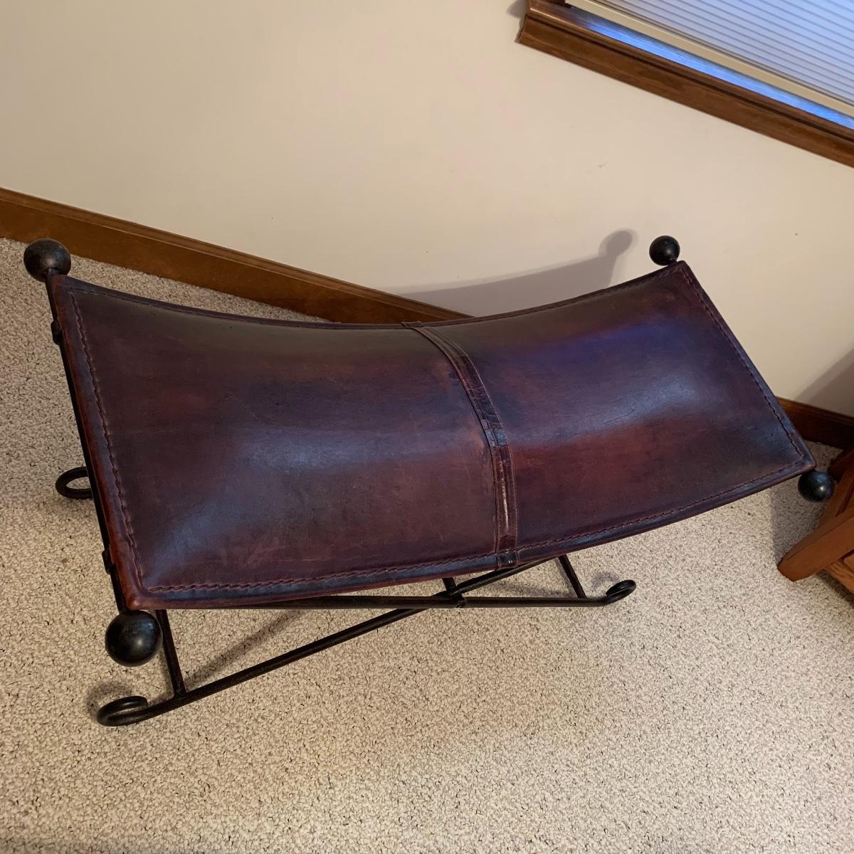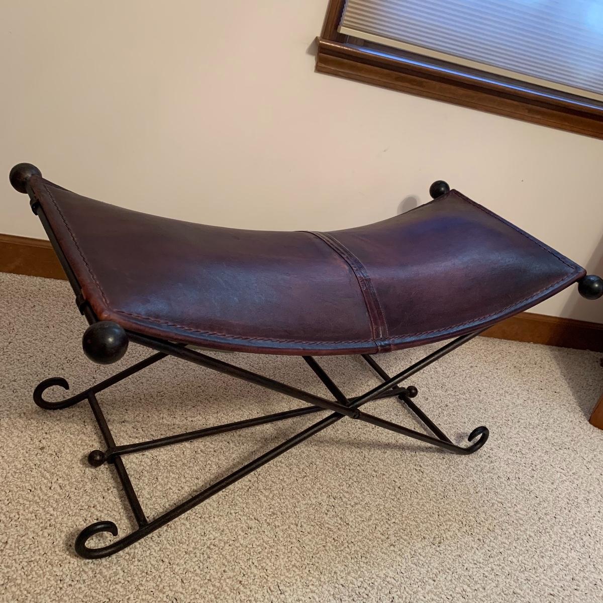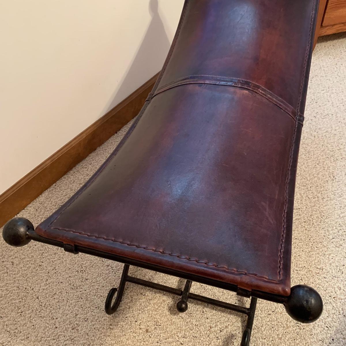 This is a nice cushioned saddle-style bench with a collapsible iron frame. The seat of the bench has the appearance of leather, but it is possible that it is a man-made material. We cannot verify if it is genuine leather or not. The bench has a heavy, sturdy iron frame that is collapsible. The seat of the bench hooks onto the frame, and there is a hooked rod on the bottom that holds it together (3 pieces total). It measures approximately 41” x 21” x 19”. Local pickup only.