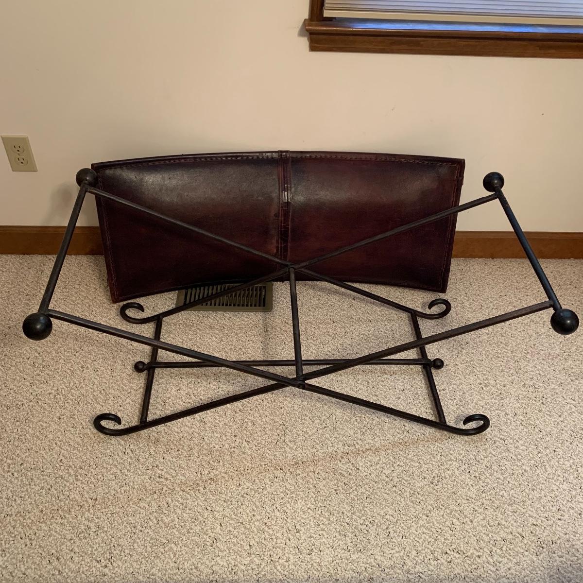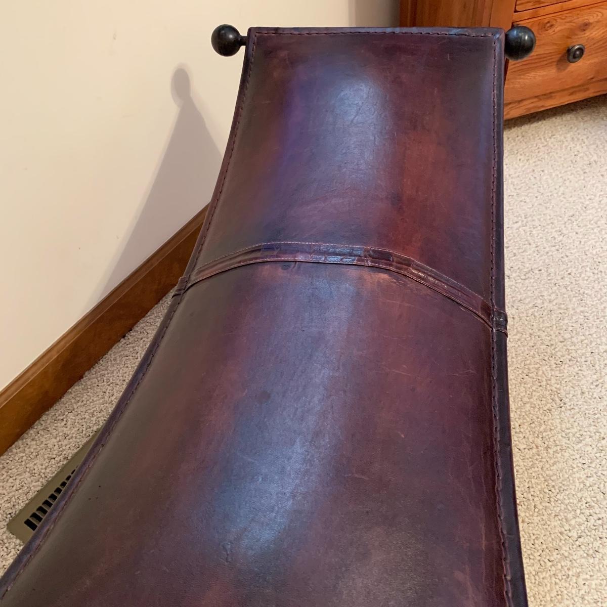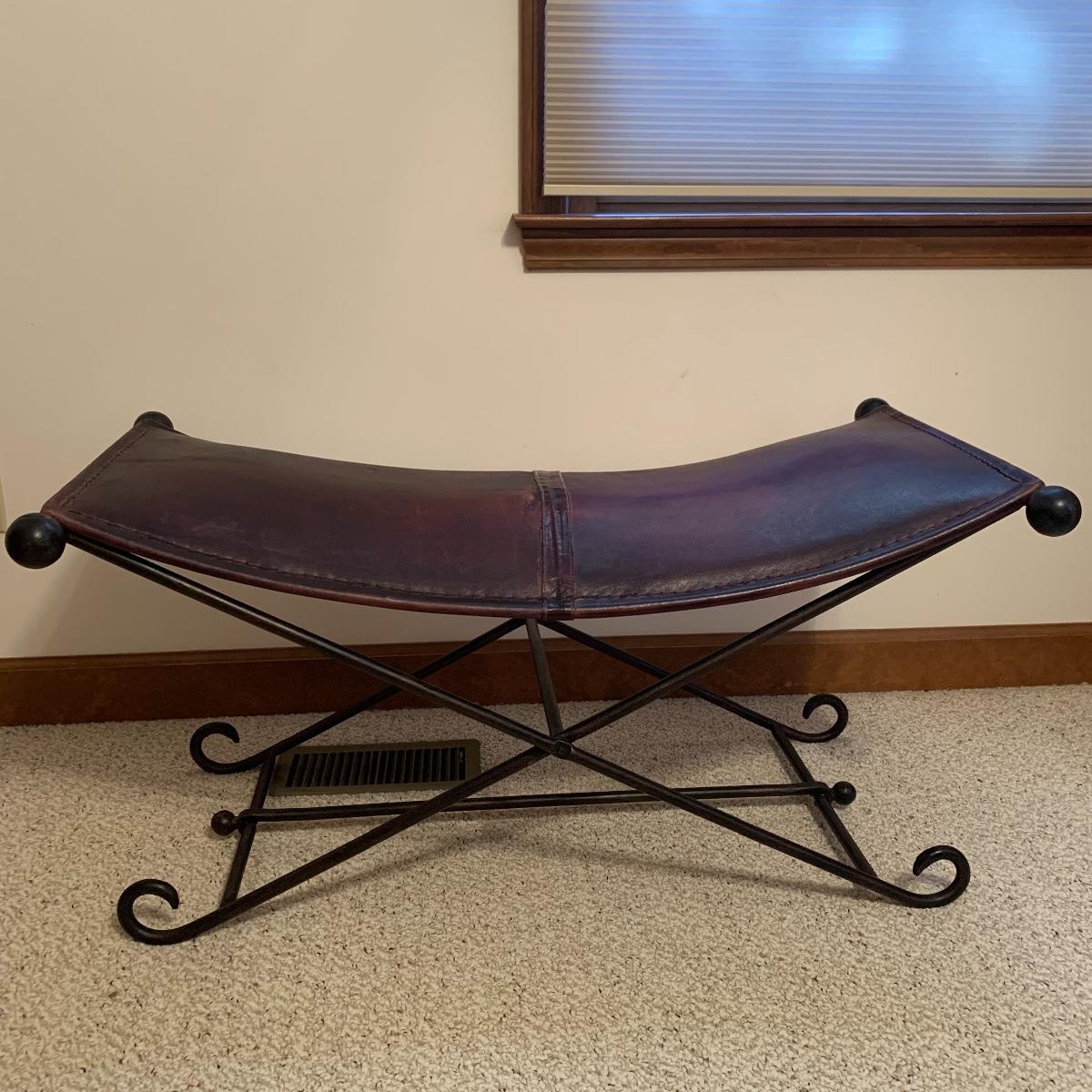 This is a nice cushioned saddle-style bench with a collapsible iron frame. The seat of the bench has the appearance of leather, but it is possible that it is a man-made material. We cannot verify if it is genuine leather or not. The bench has a heavy, sturdy iron frame that is collapsible. The seat of the bench hooks onto the frame, and there is a hooked rod on the bottom that holds it together (3 pieces total). It measures approximately 41” x 21” x 19”. Local pickup only.
