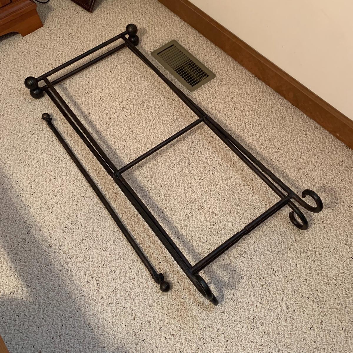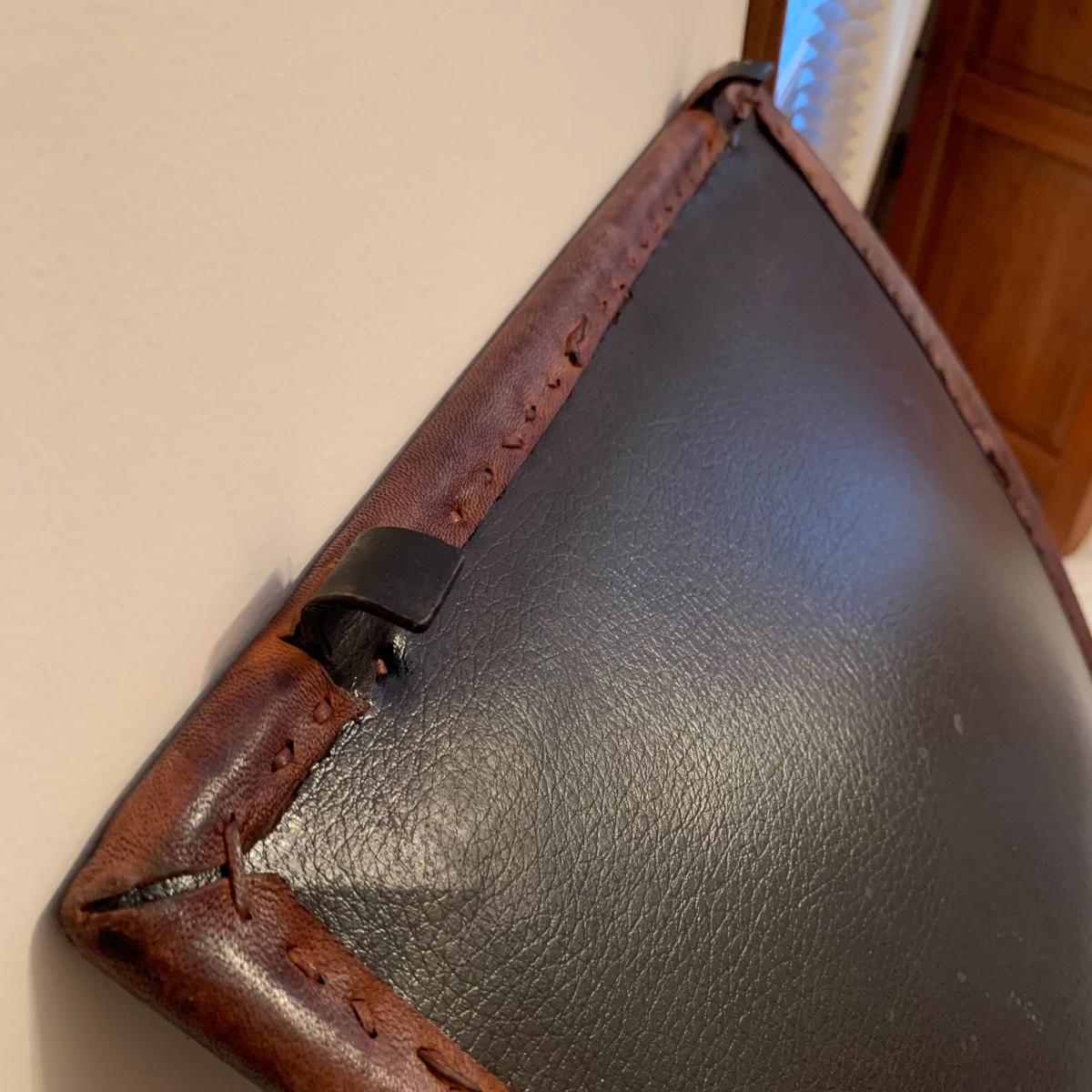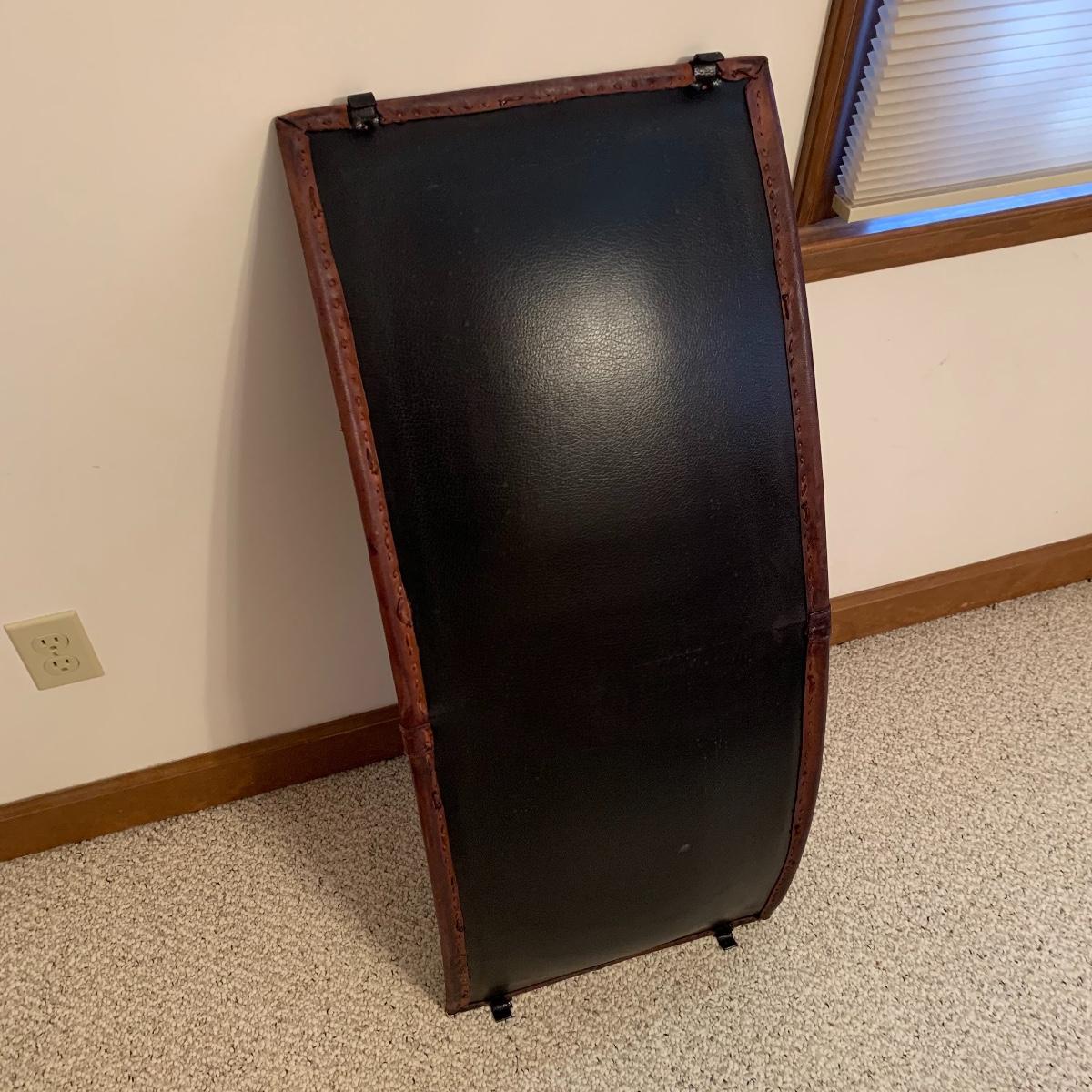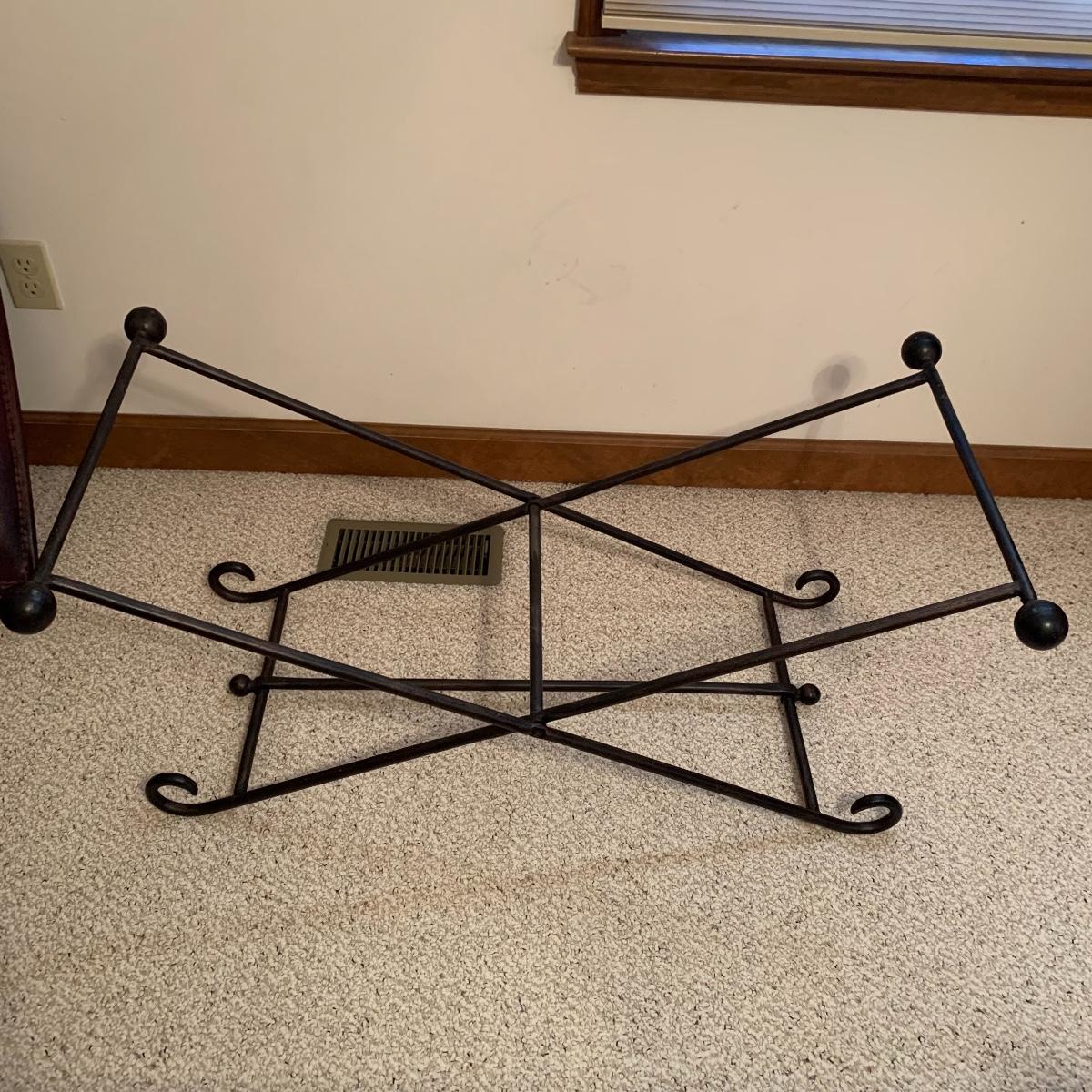 This is a nice cushioned saddle-style bench with a collapsible iron frame. The seat of the bench has the appearance of leather, but it is possible that it is a man-made material. We cannot verify if it is genuine leather or not. The bench has a heavy, sturdy iron frame that is collapsible. The seat of the bench hooks onto the frame, and there is a hooked rod on the bottom that holds it together (3 pieces total). It measures approximately 41” x 21” x 19”. Local pickup only.
