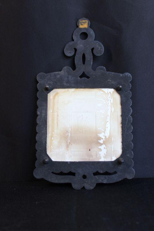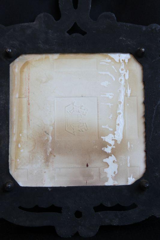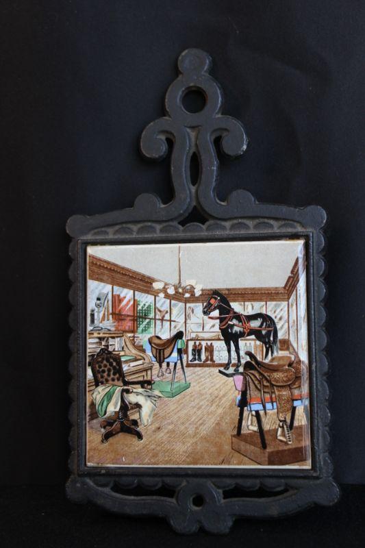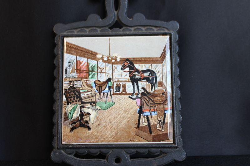 Saddleshop scene Trivet. Painted tile with a cast frame.