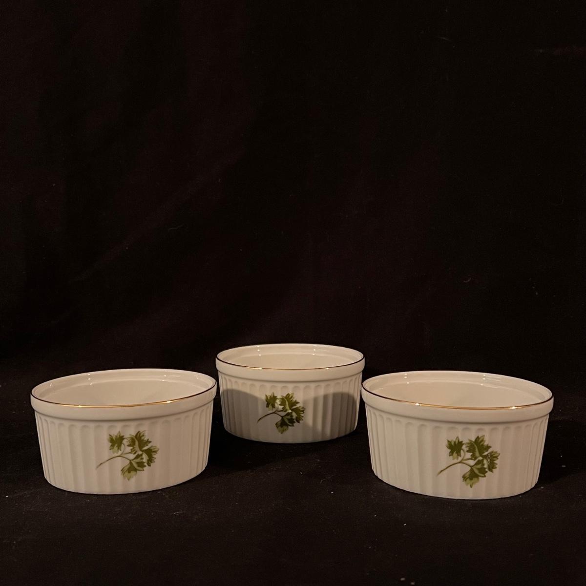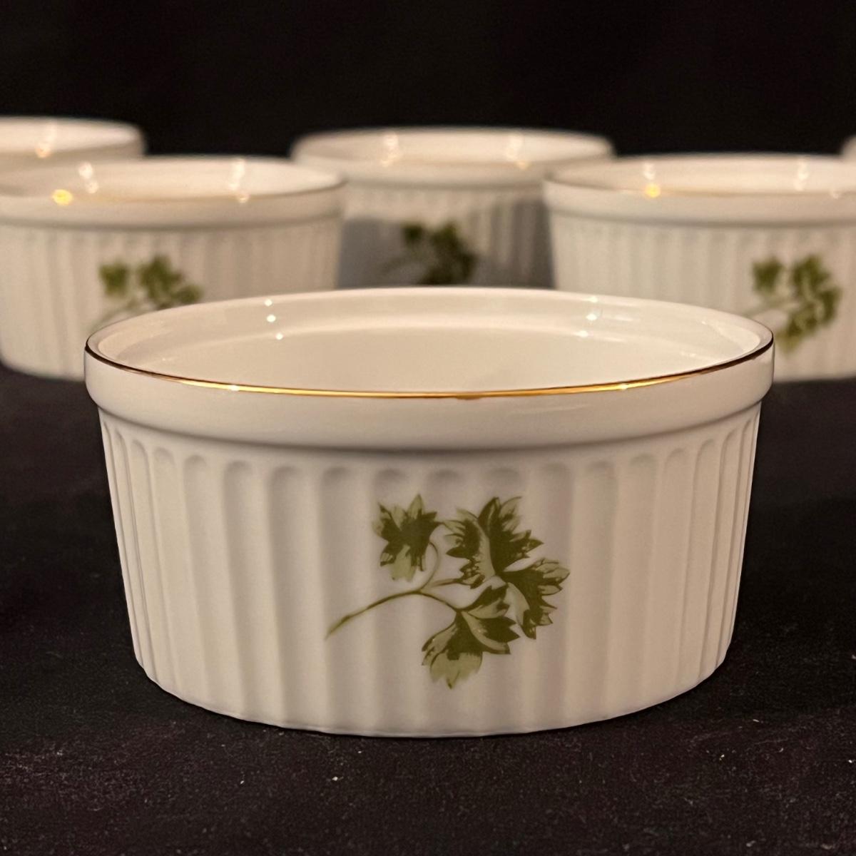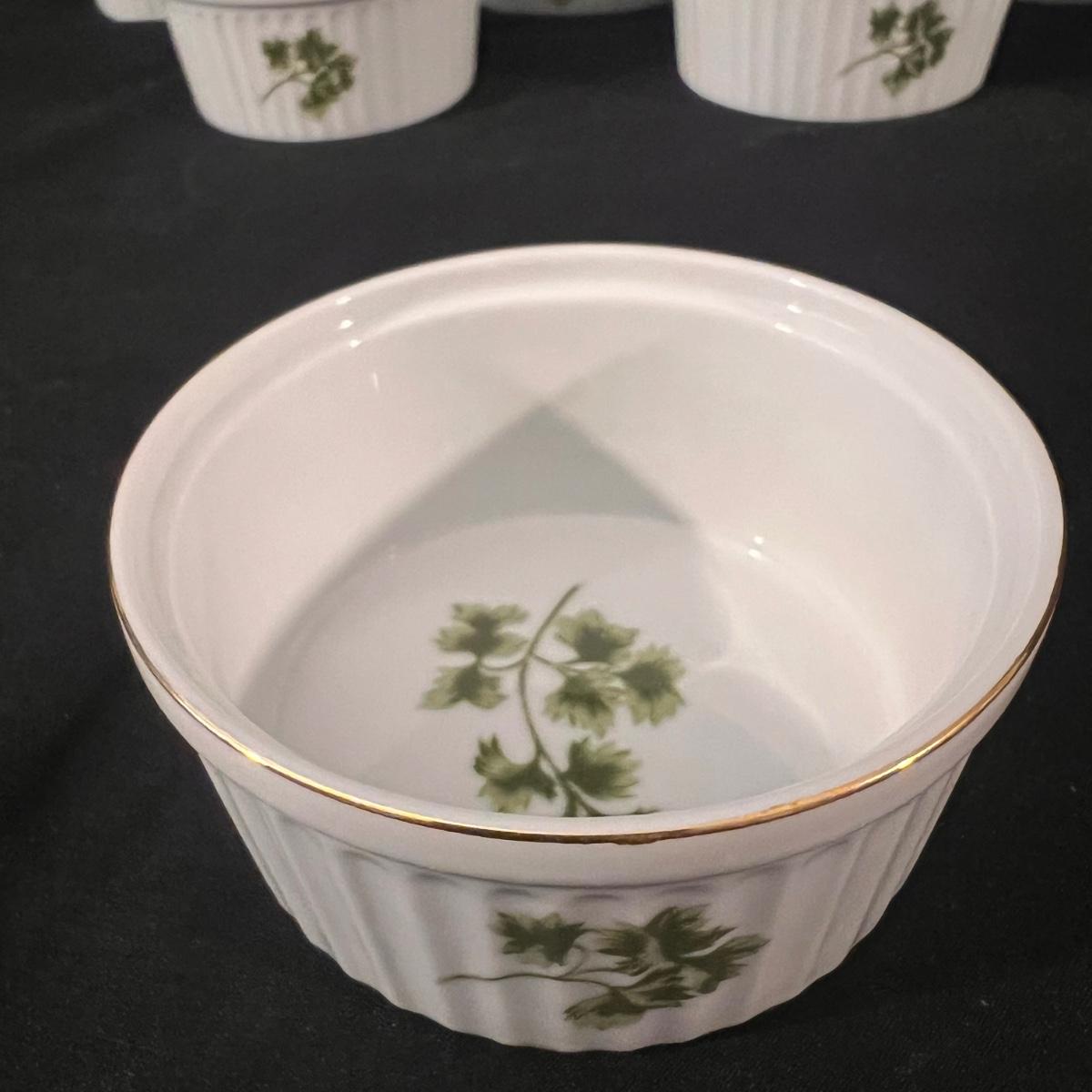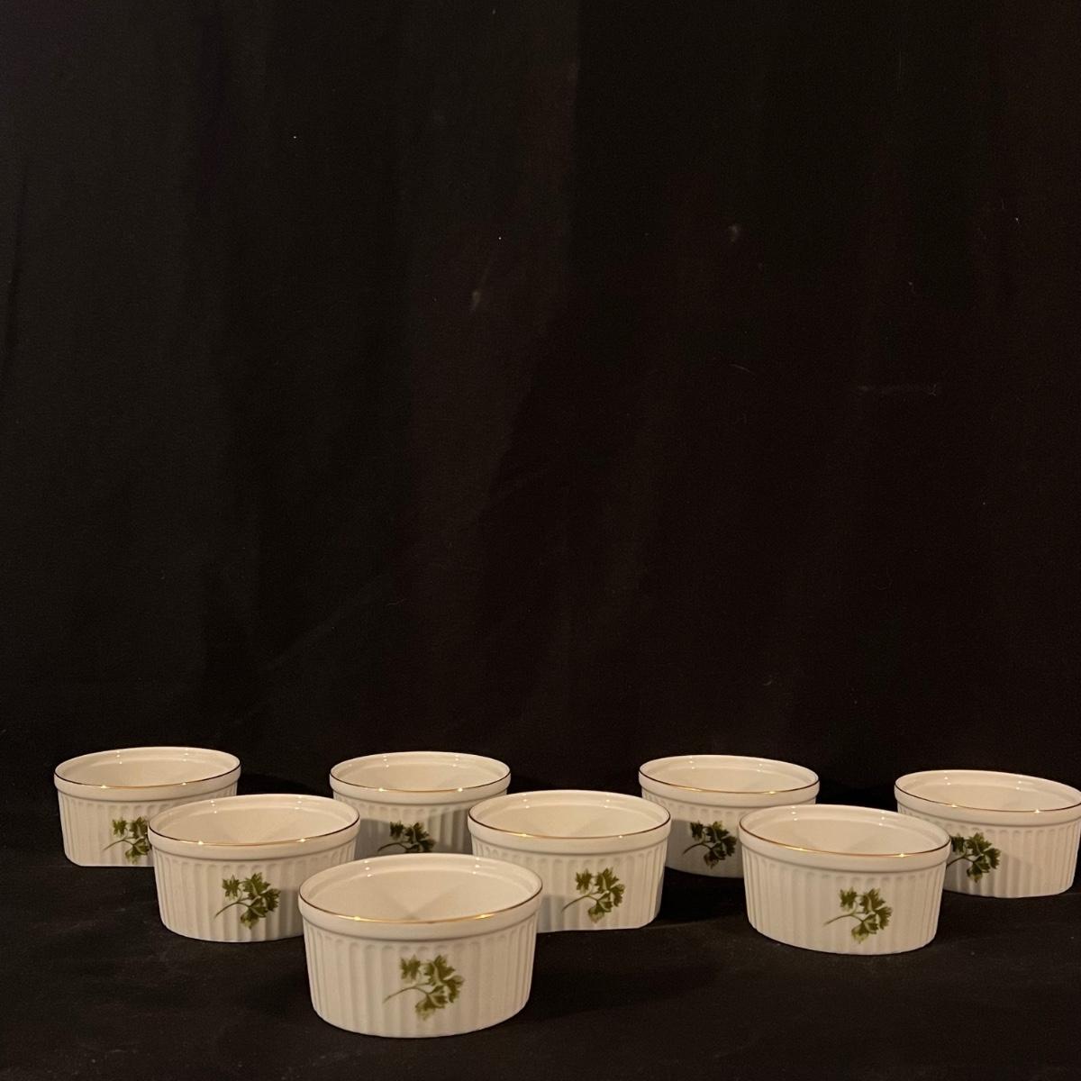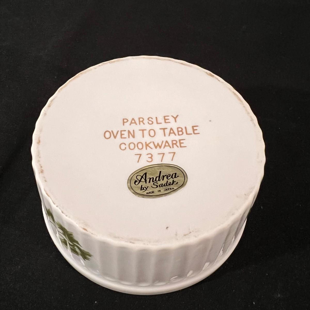 This lot includes 8 pieces of Andrea by Sadek Parsley oven-to-table stoneware ramekins that measure 4”D x 2”H. All appear to be in great condition. Shipping available.