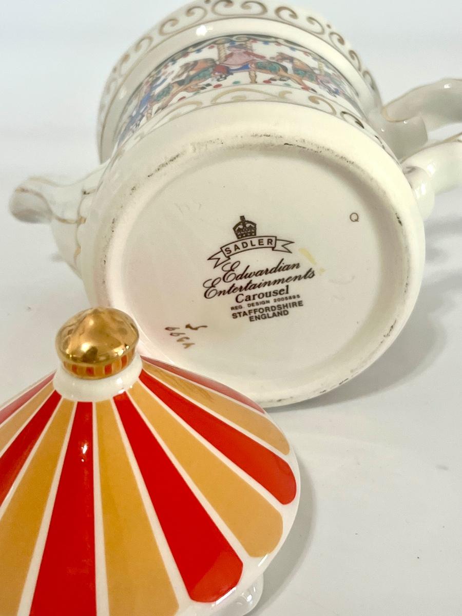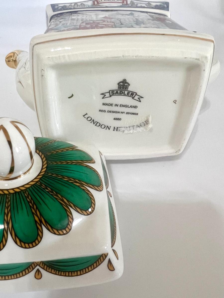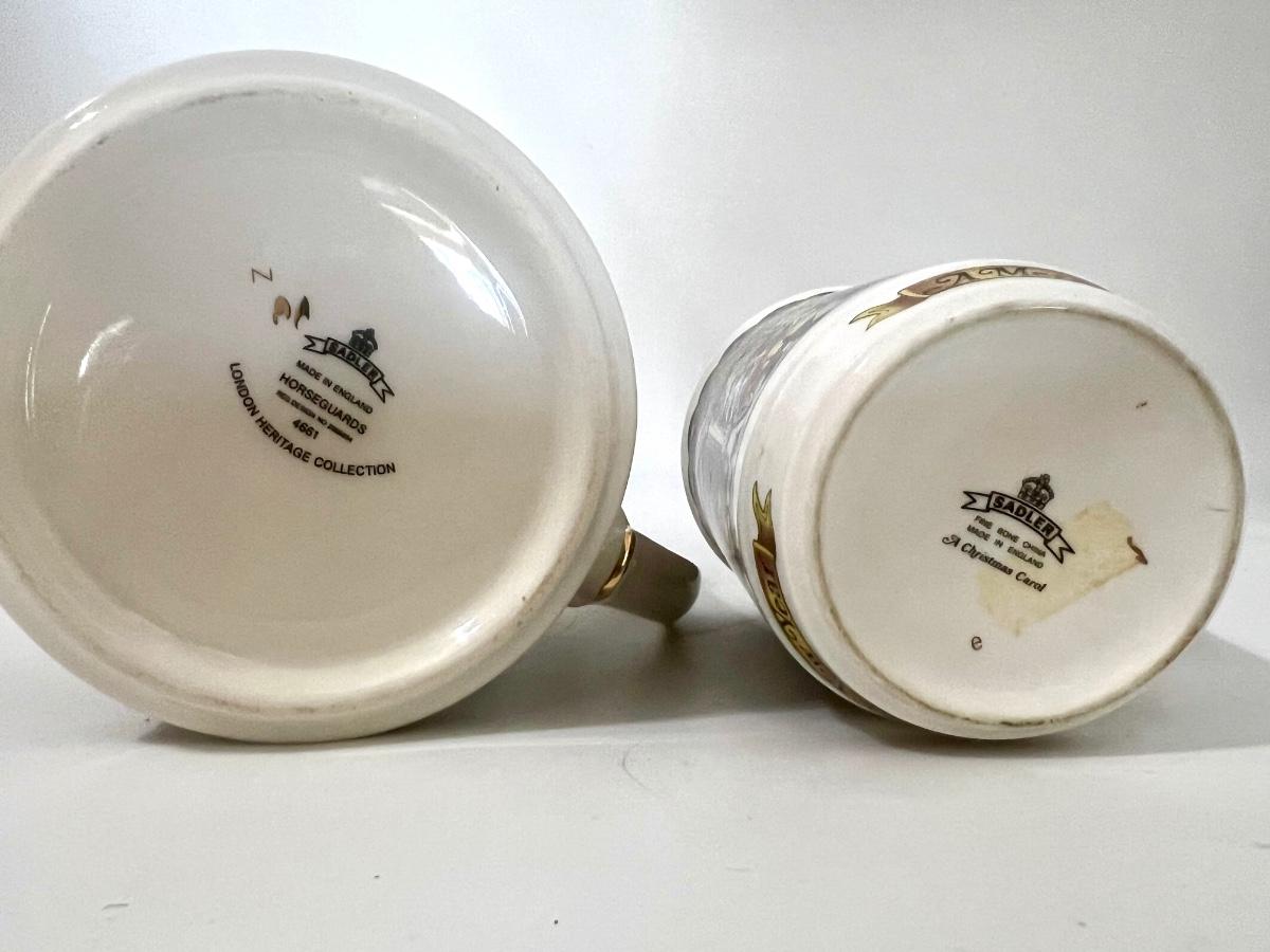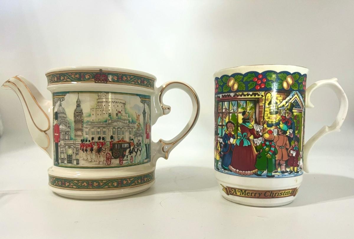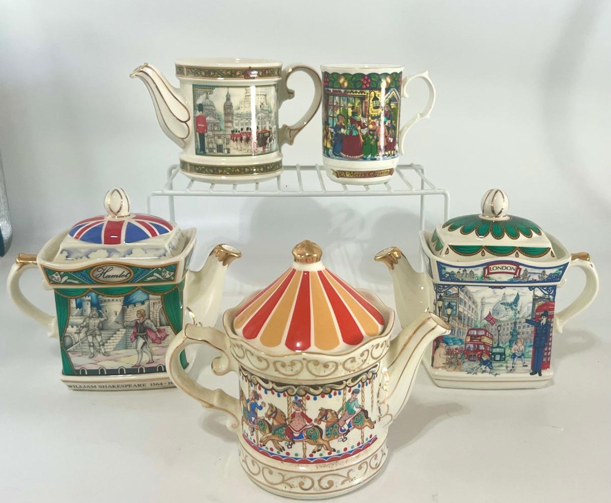 SADLER Tea Pot Lot Includes three teapots with lids, one teapot without lid, and one Merry Christmas mug.