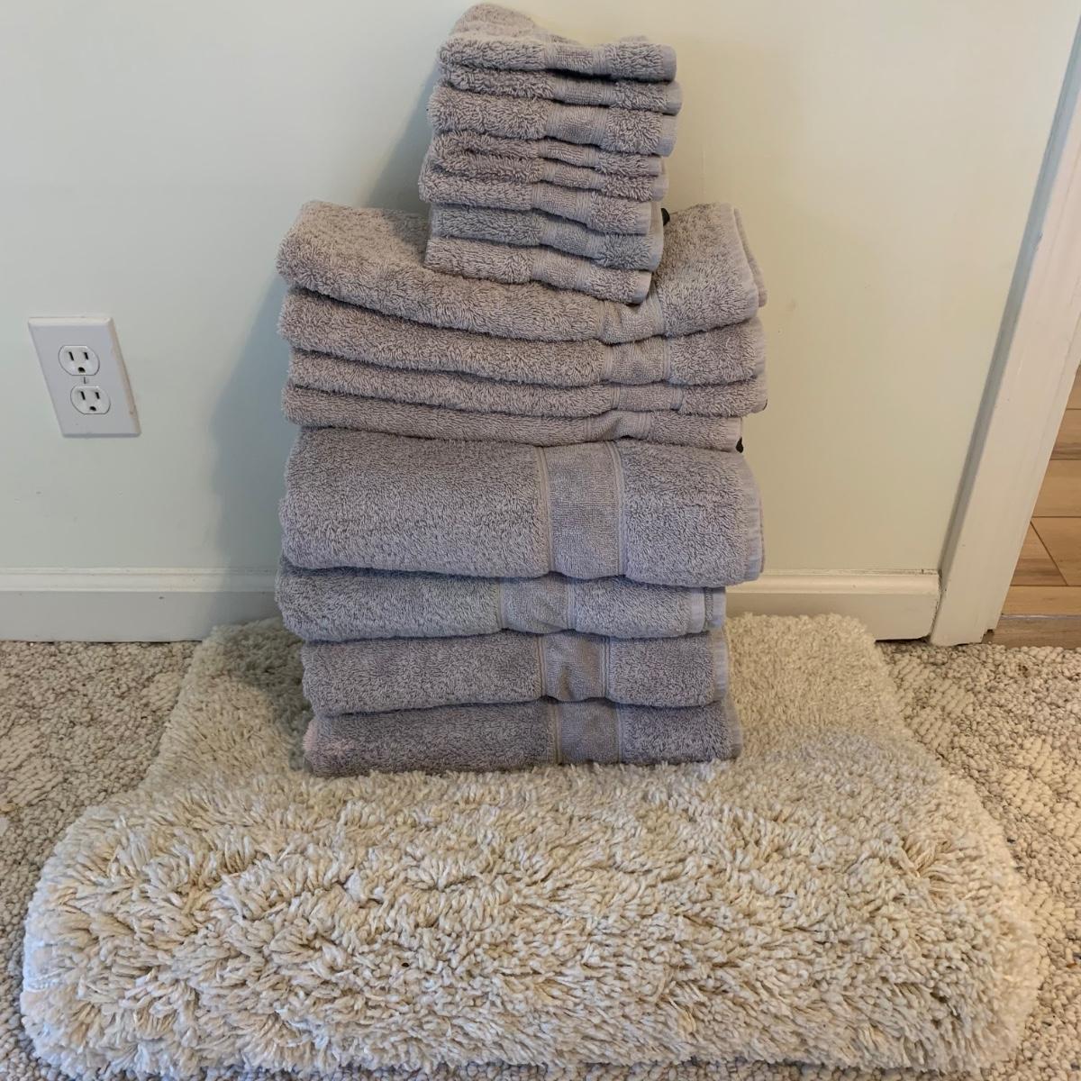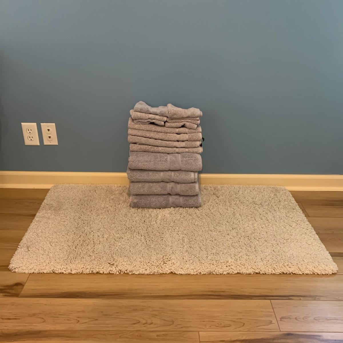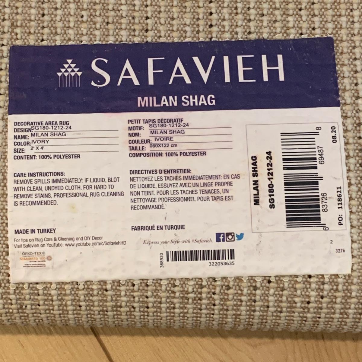 Safavieh Milan shag rug in ivory. Rug comes with four bath towels, four hand towels, and six washcloths. Rug measures 2” x 4” and is made of a thick shag material. Please note that a two linens have spots of discoloration. Please see photos for more details. Shipping available.