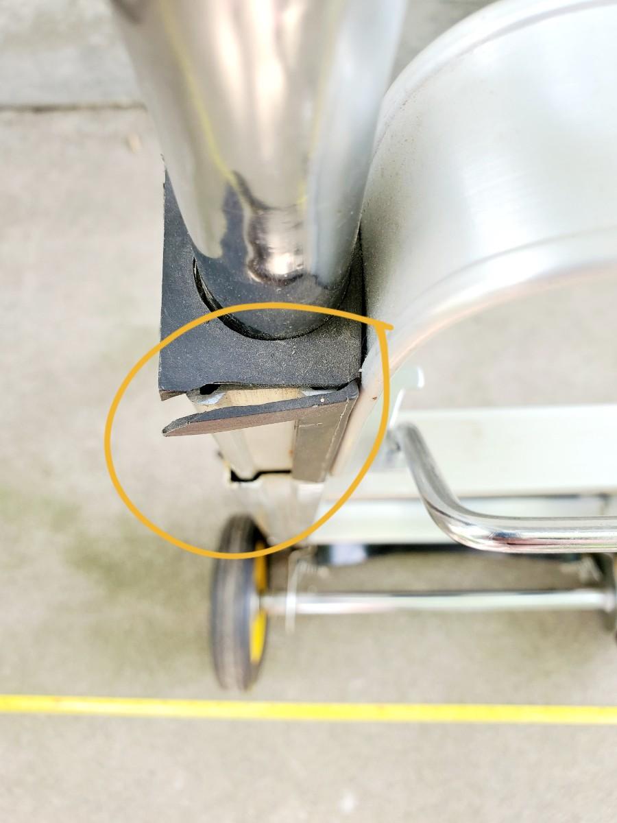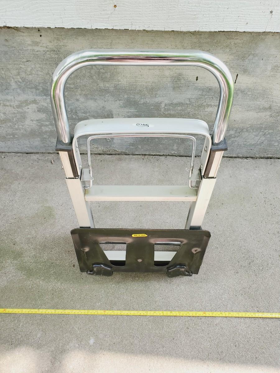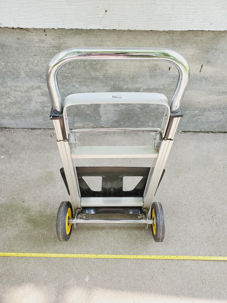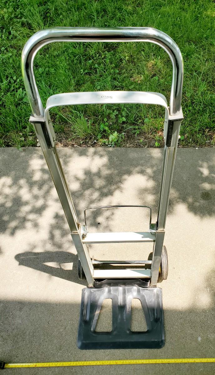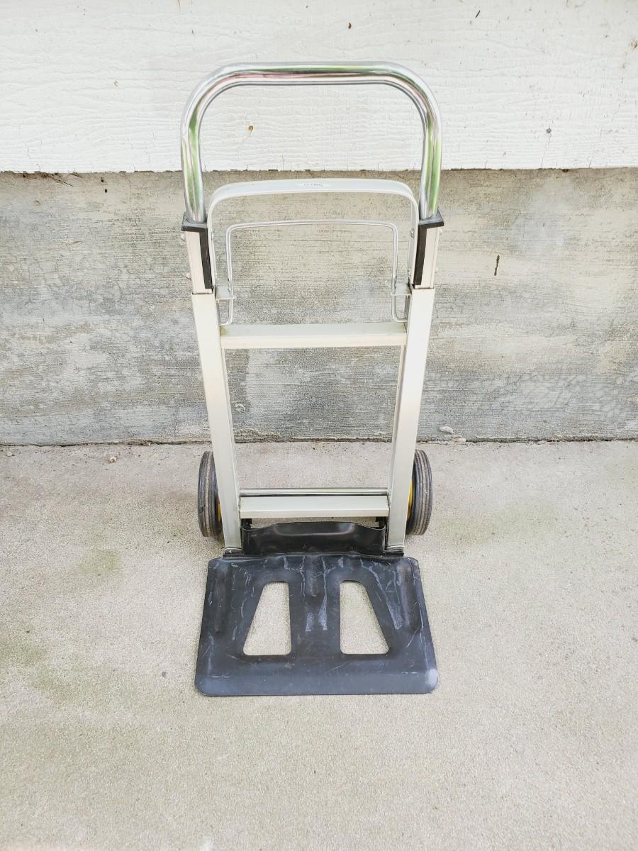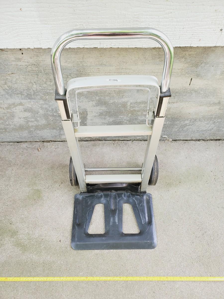 Nice heavy duty Safco adjustable handle dolly/cart. Crack in plastic near the handle but still in overall good working condition.