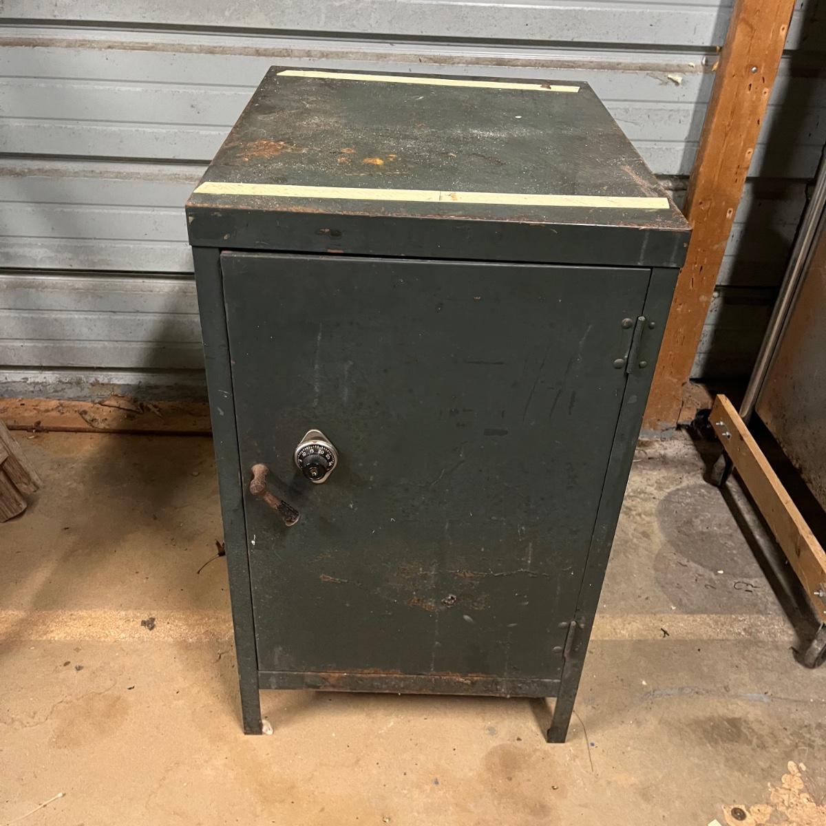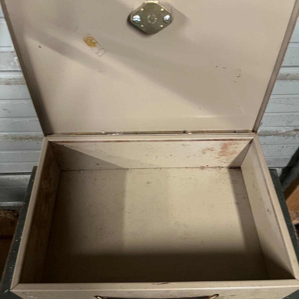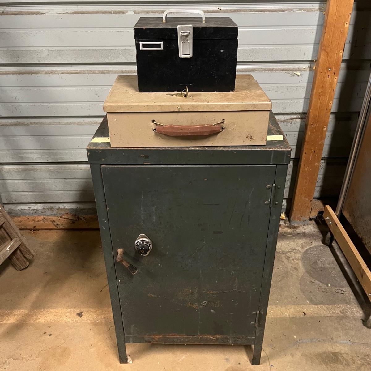 Lot includes a large safe with combination lock, and two metal lock boxes. Safe is open but we do not have combination or key. Safe is scratched and has some rust, see pictures. Safe measures 18” x 22.5” x 30.5”.